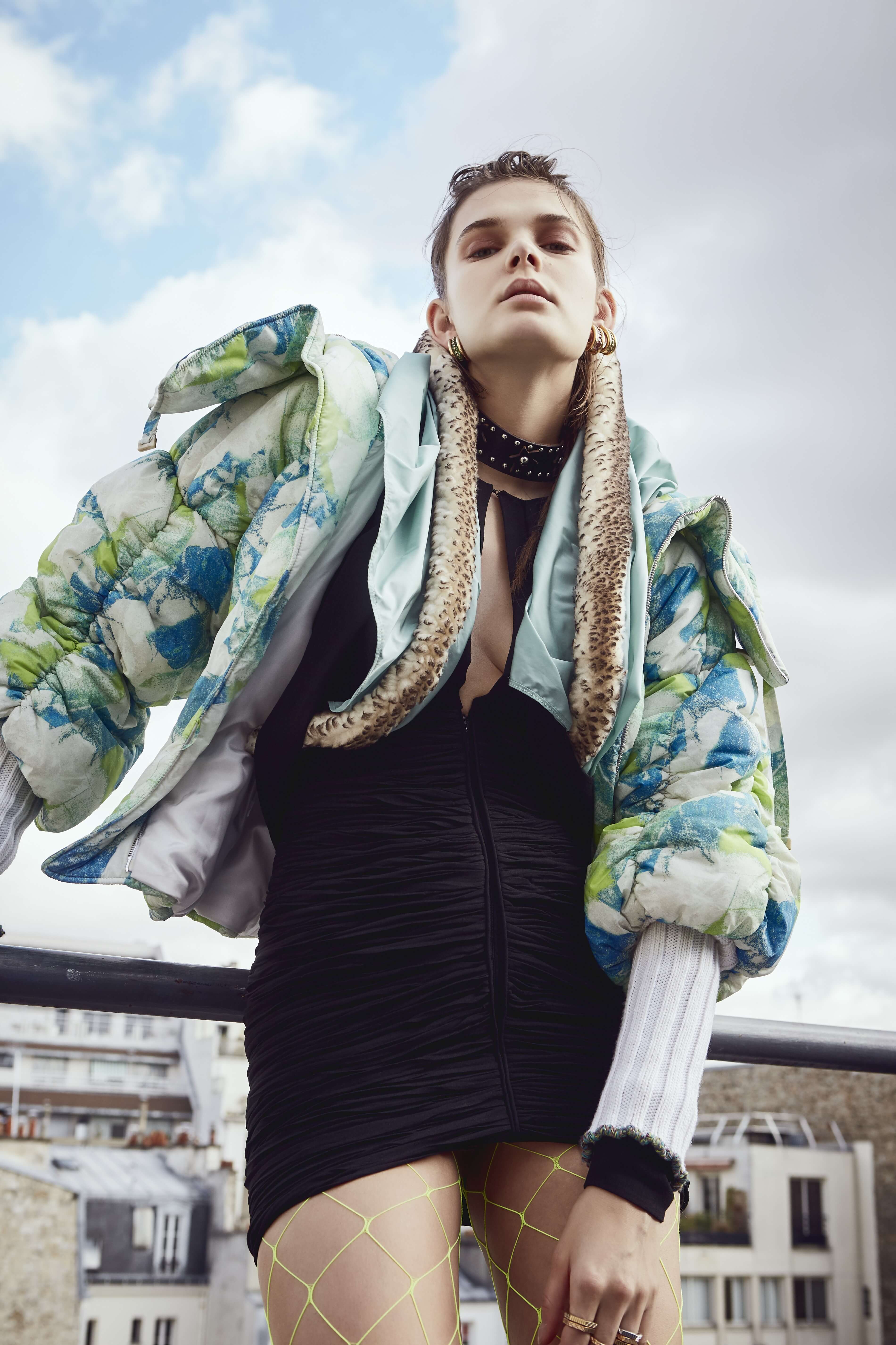Шуба Bally, рубашка и длинное нюдовое пальто Acne, джинсовое худи Andrea Crews, юбка Drome, чокер Zana Bayne, ботфорты Elie Saab, серьги Zadig & Voltaire