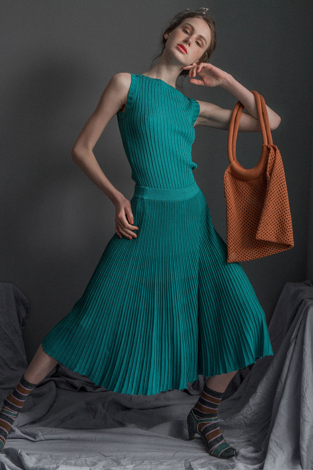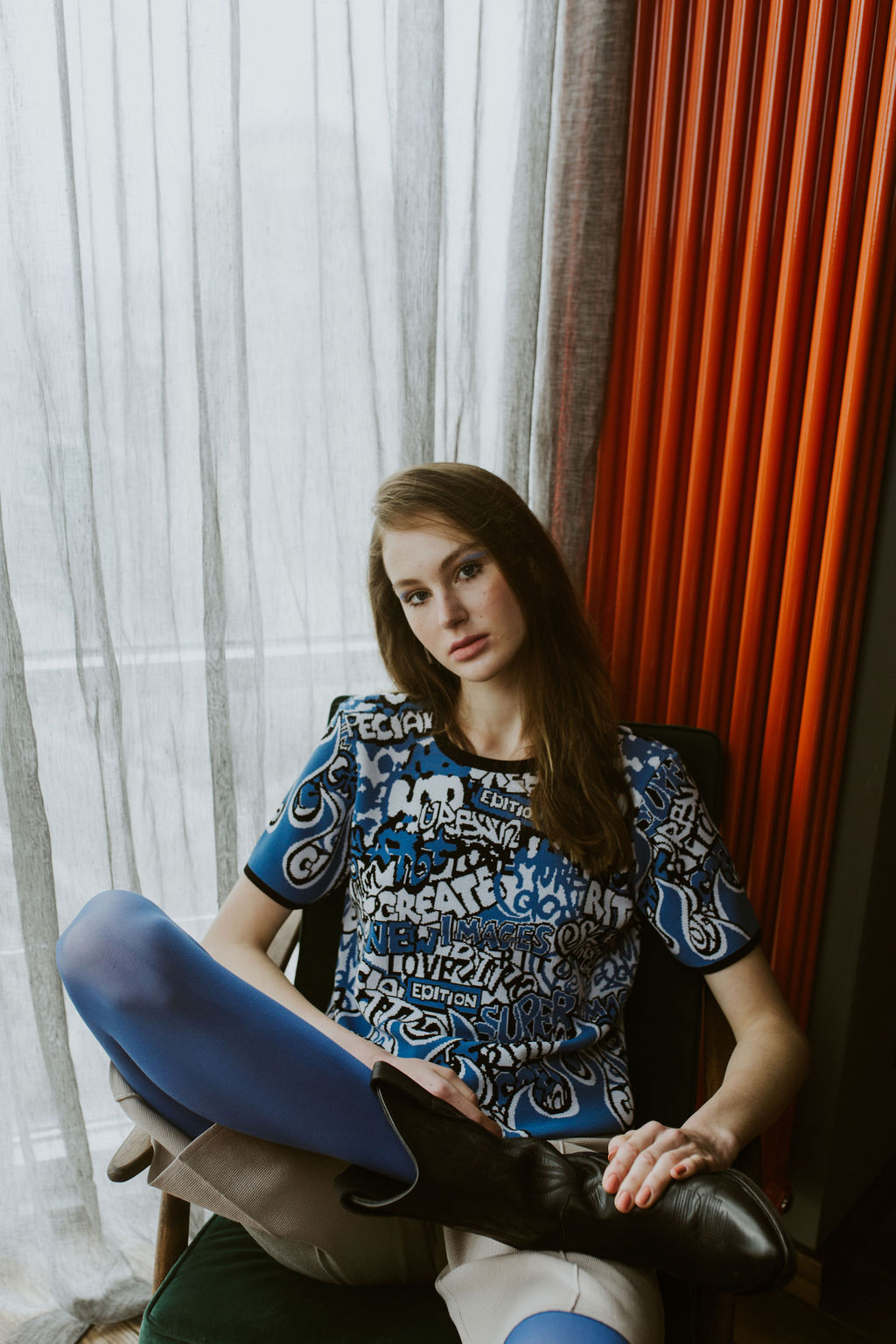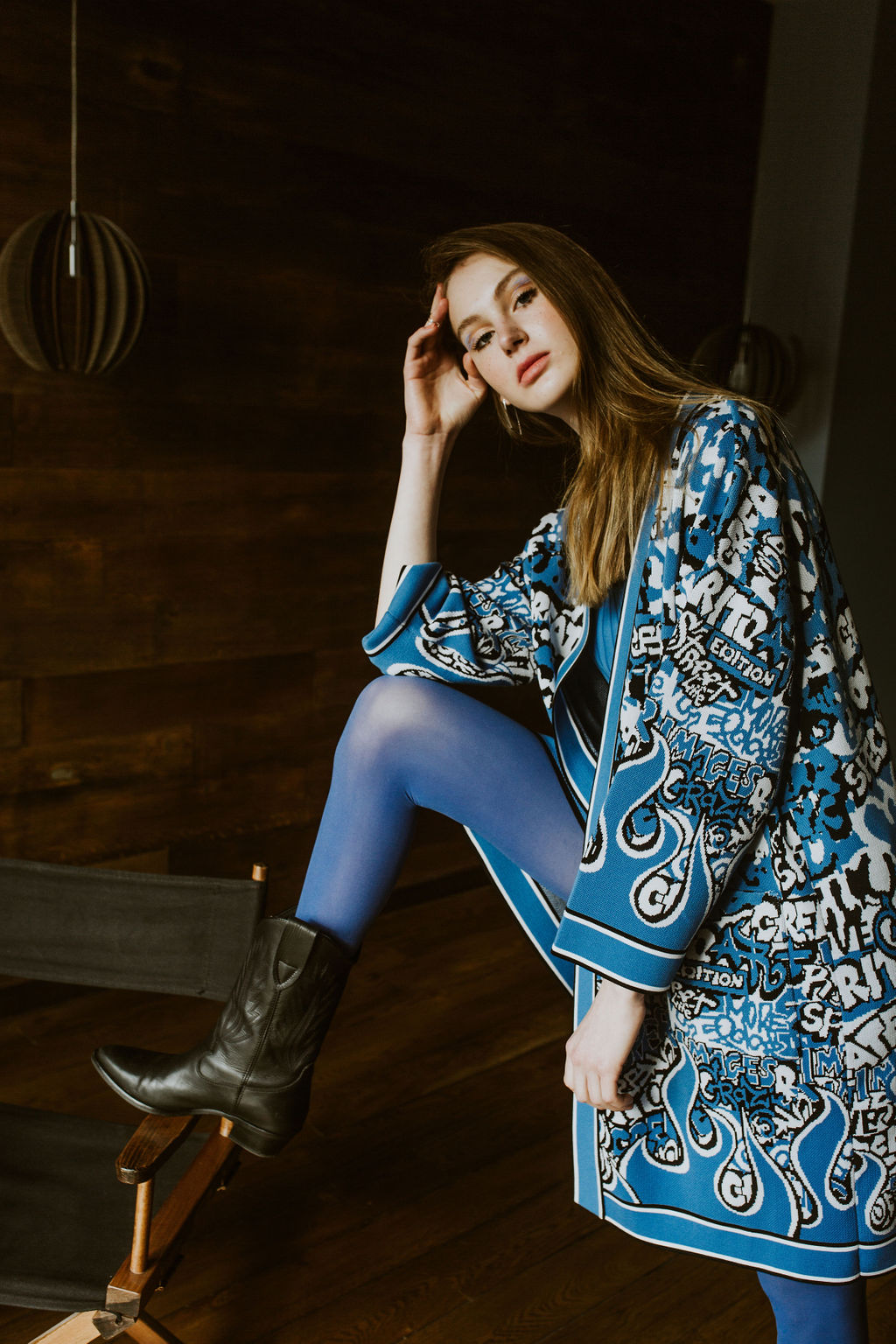 Технологически сложные жаккарды воплощены в костюмной тройке: джемпере, мини-юбке и свободно сидящем кардигане с принтами в двух цветовых вариациях. Это отсылка к японским комиксам манга и свободному духу 1980-х с его уличным искусством, хип-хопом, видеоиграми и драм-машинами. Вещи можно как надевать вместе, так и комбинировать с базовыми элементами гардероба.