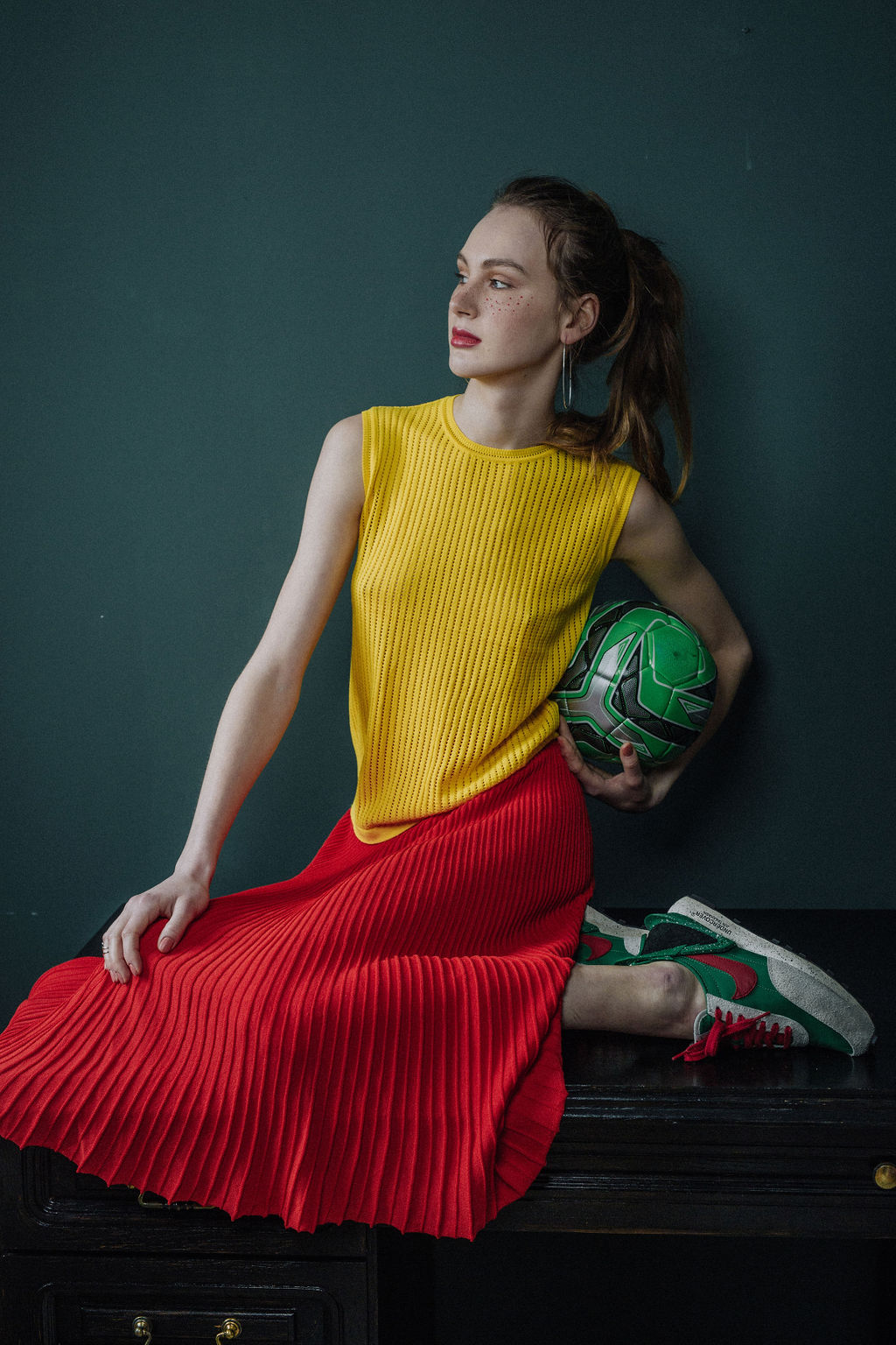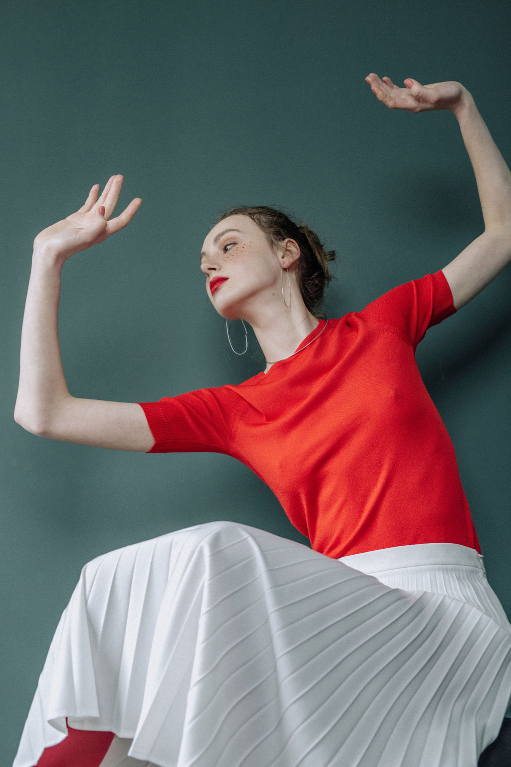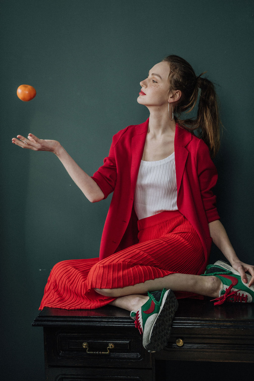 Технологически сложные жаккарды воплощены в костюмной тройке: джемпере, мини-юбке и свободно сидящем кардигане с принтами в двух цветовых вариациях. Это отсылка к японским комиксам манга и свободному духу 1980-х с его уличным искусством, хип-хопом, видеоиграми и драм-машинами. Вещи можно как надевать вместе, так и комбинировать с базовыми элементами гардероба.