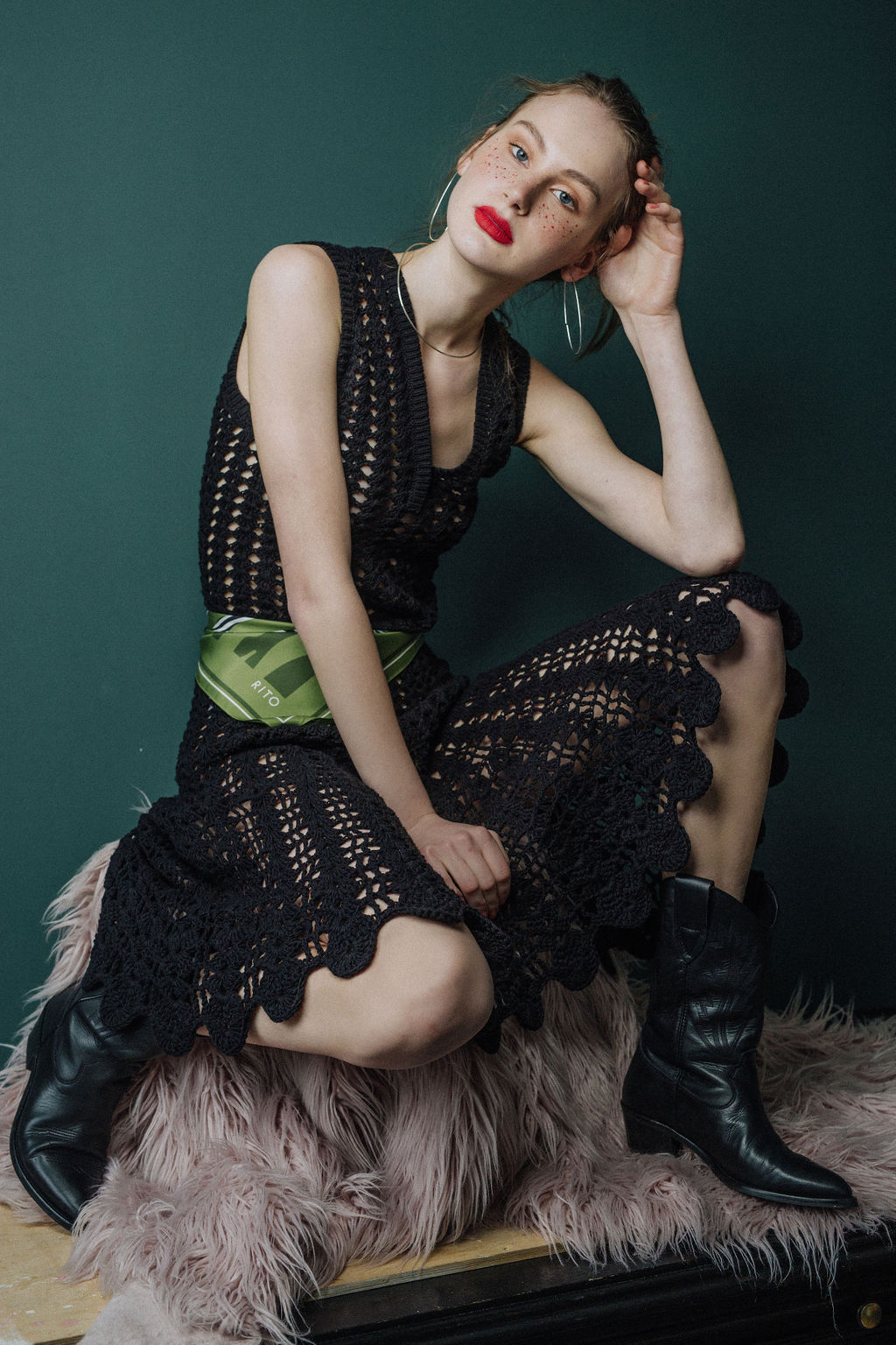 Rito пополнили ассортимент трикотажных базовых вещей, актуальных вне зависимости от сезона, платьями из вискозы и хлопка, топами с коротким рукавом в нескольких цветовых решениях, костюмами свободного кроя с брюками или кюлотами, а также классическими жилетами из невесомой и рыхлой вискозы. Ценителям ручной работы бренд предлагает носить в этом сезоне ажурные топы-безрукавки, а также платья и юбки, связанные крючком.