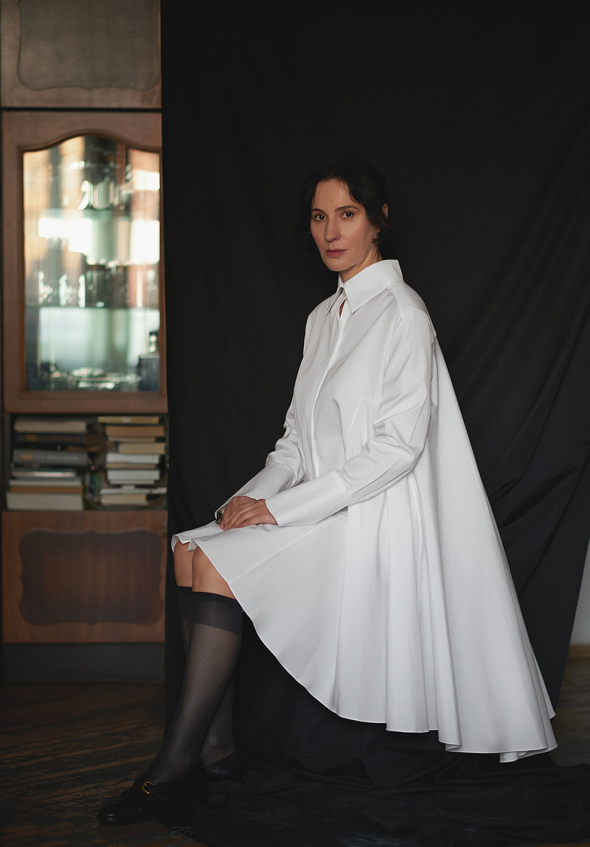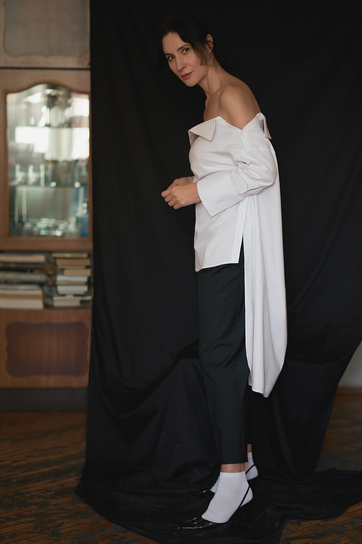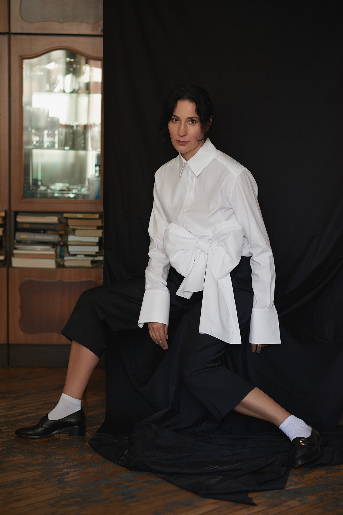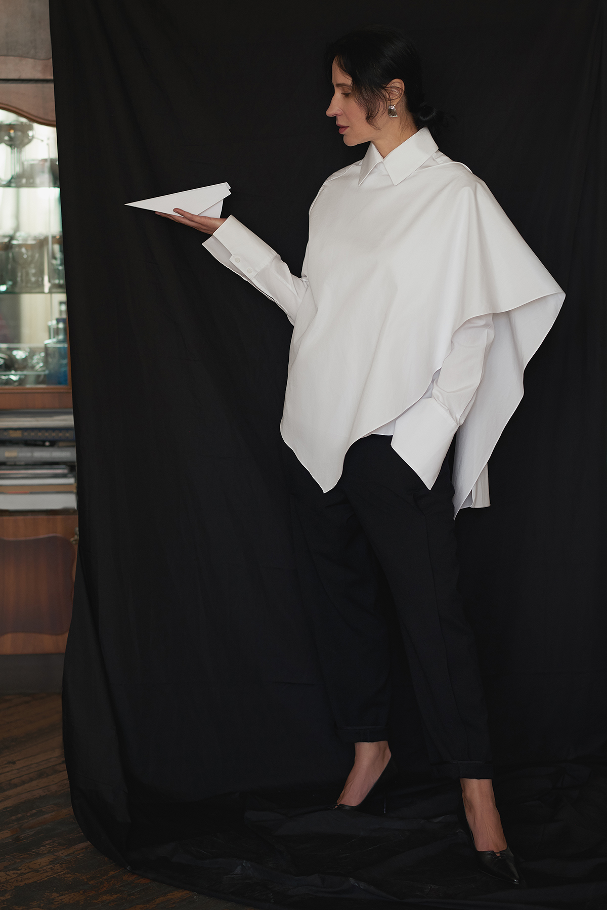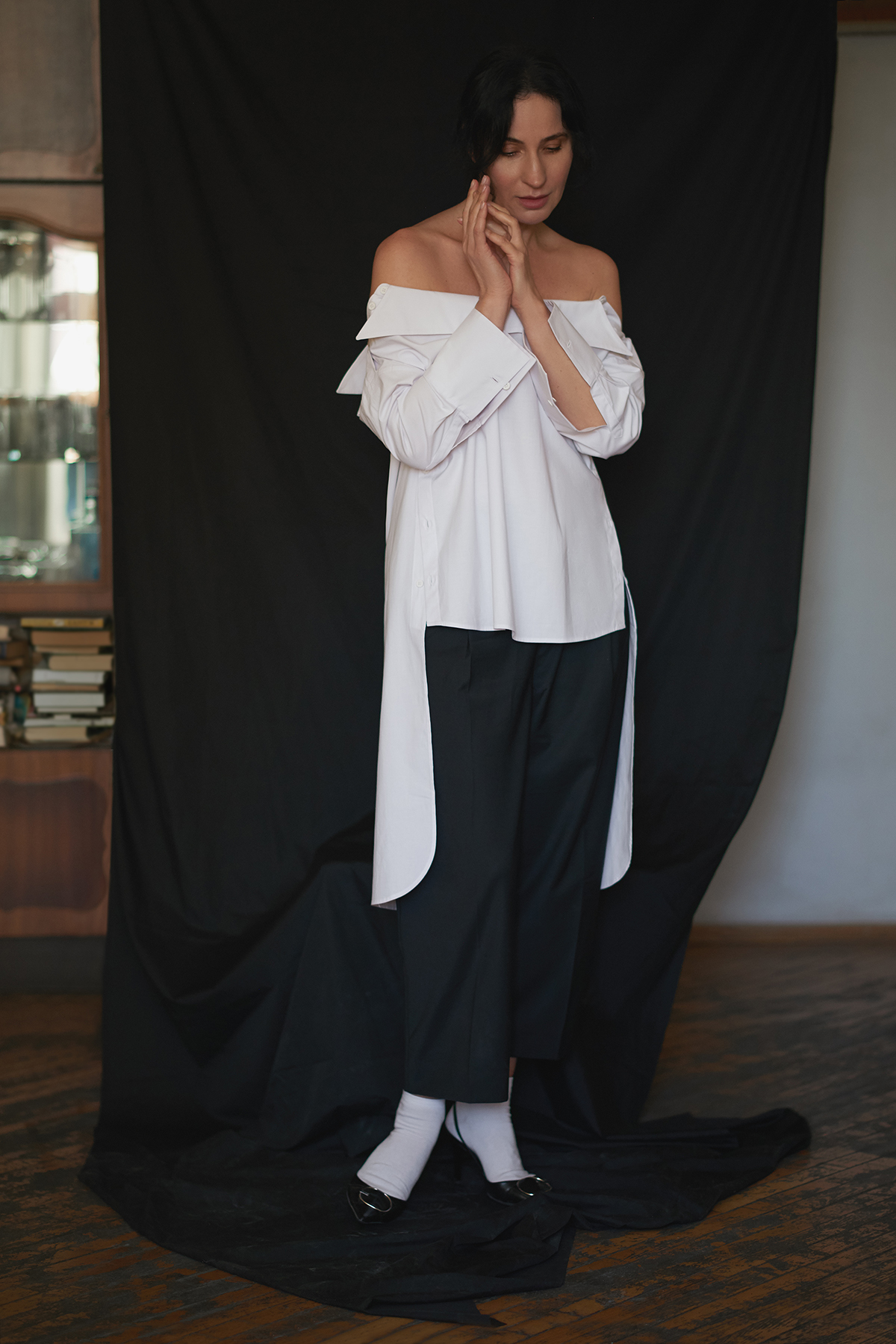 Рубашки-мантии, рубашки-фраки, модели с двойными воротниками, элементами корсетов и длинными фалдами, которые можно завязывать в объемные банты, – коллекция дизайнера бренда Кристины Касиловой не имеет ничего общего с привычным пониманием “базовых” рубашек. При этом благодаря универсальности белой сорочки как таковой, они будут уместны и в офисе, и на вечеринке: для перевоплощения достаточно по-новому перевязать элементы рубашки – и новый образ на вечер готов.