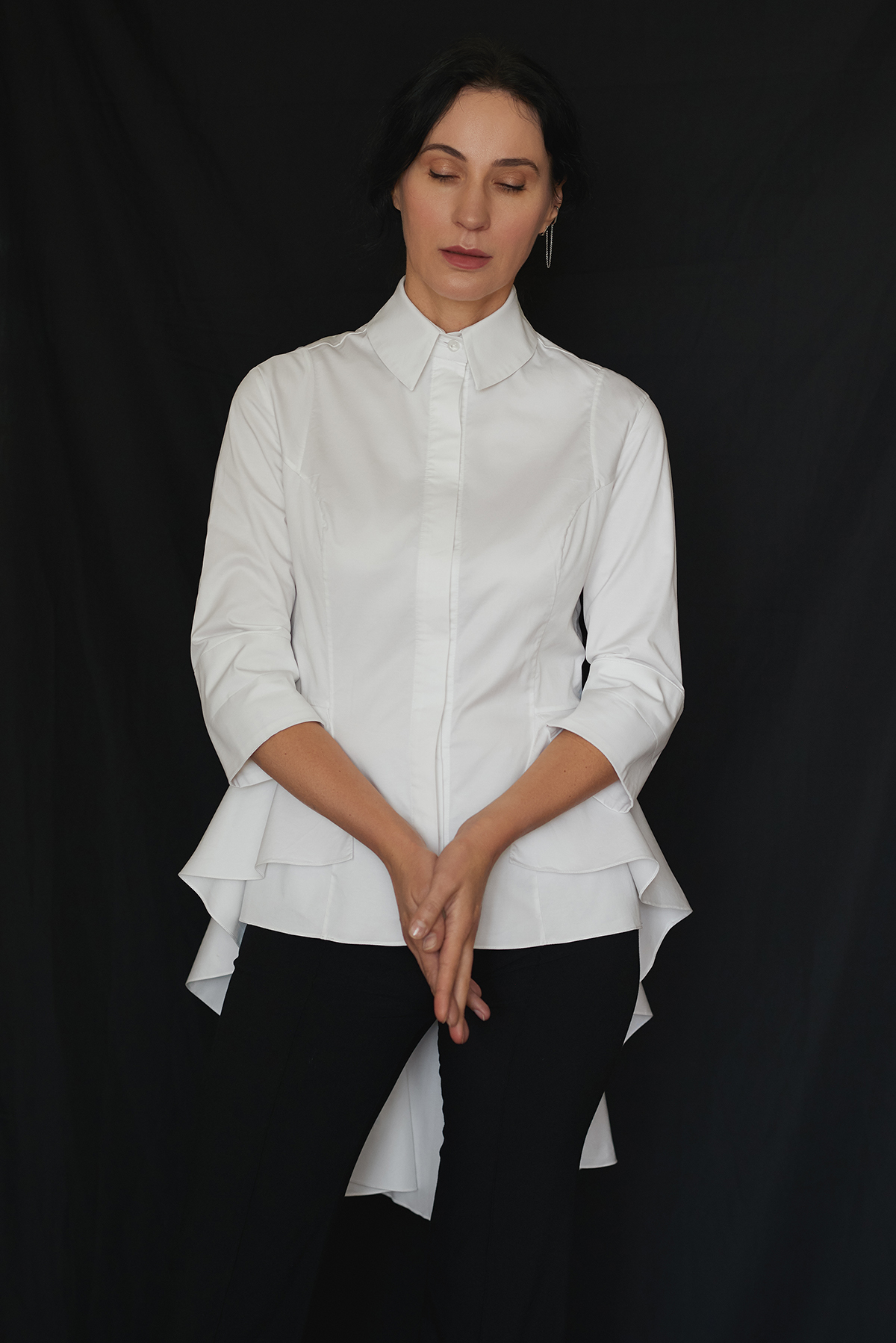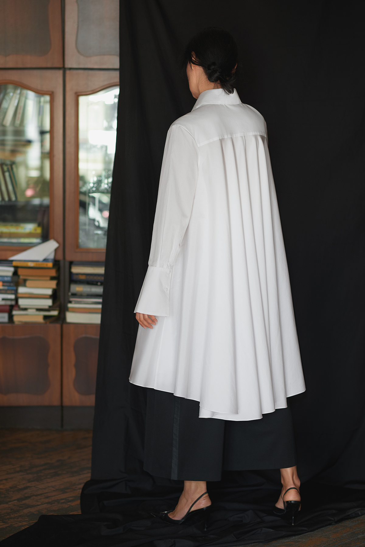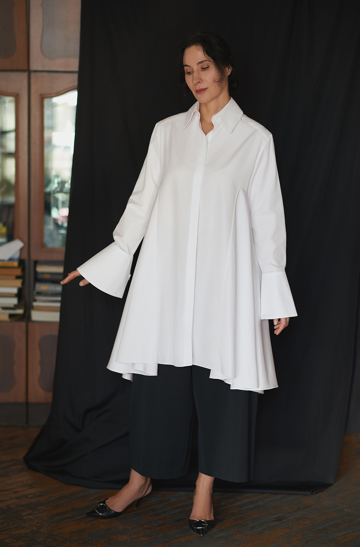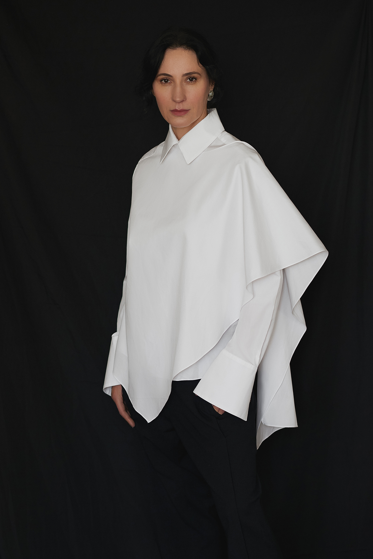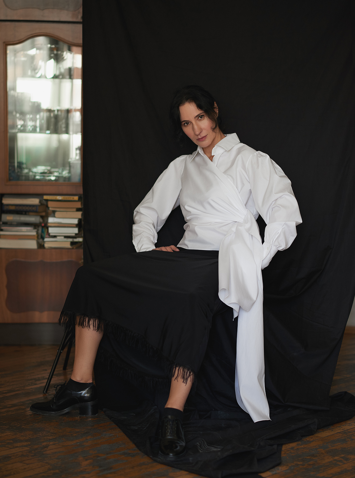 Рубашки-мантии, рубашки-фраки, модели с двойными воротниками, элементами корсетов и длинными фалдами, которые можно завязывать в объемные банты, – коллекция дизайнера бренда Кристины Касиловой не имеет ничего общего с привычным пониманием “базовых” рубашек. При этом благодаря универсальности белой сорочки как таковой, они будут уместны и в офисе, и на вечеринке: для перевоплощения достаточно по-новому перевязать элементы рубашки – и новый образ на вечер готов.