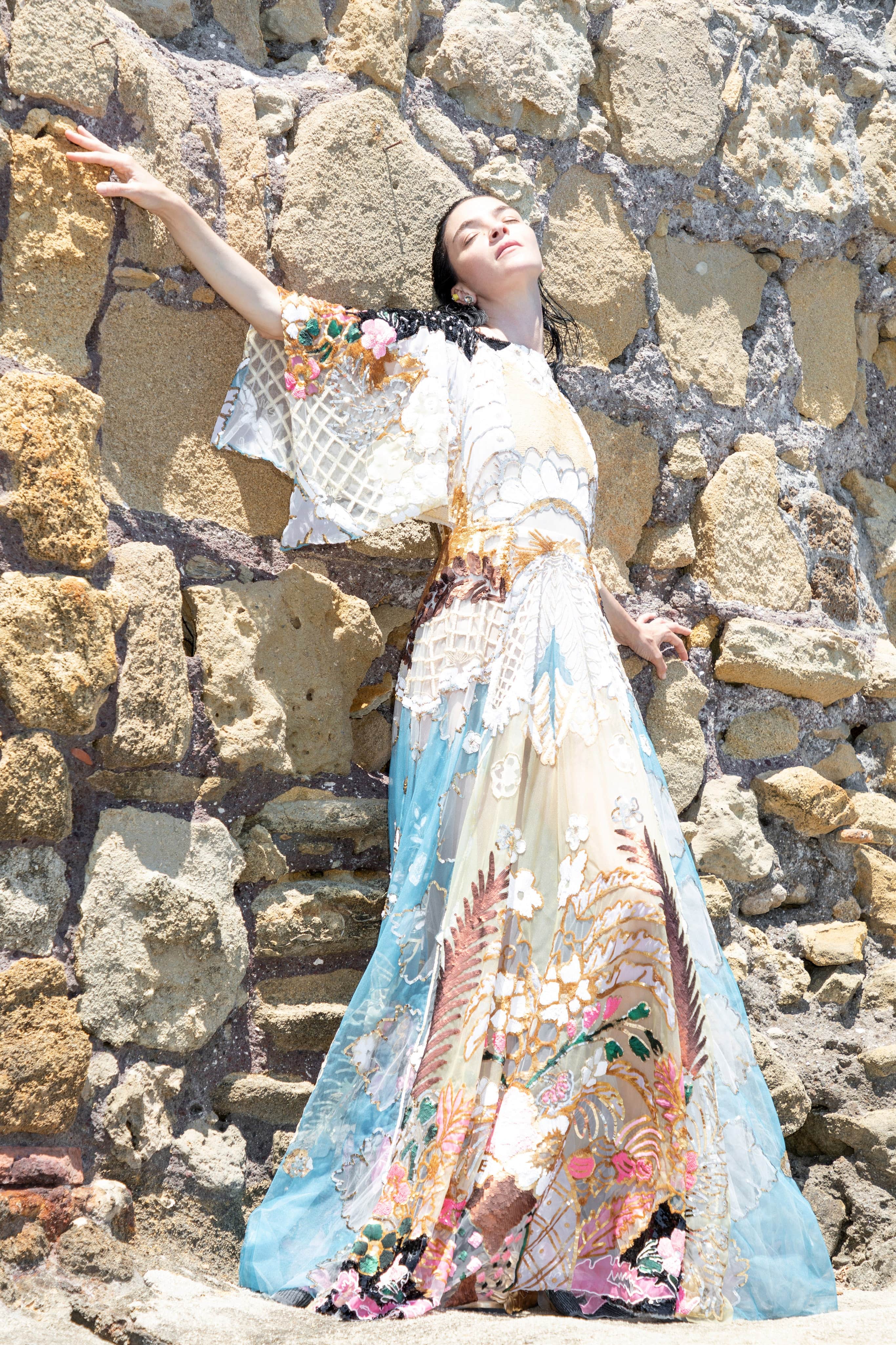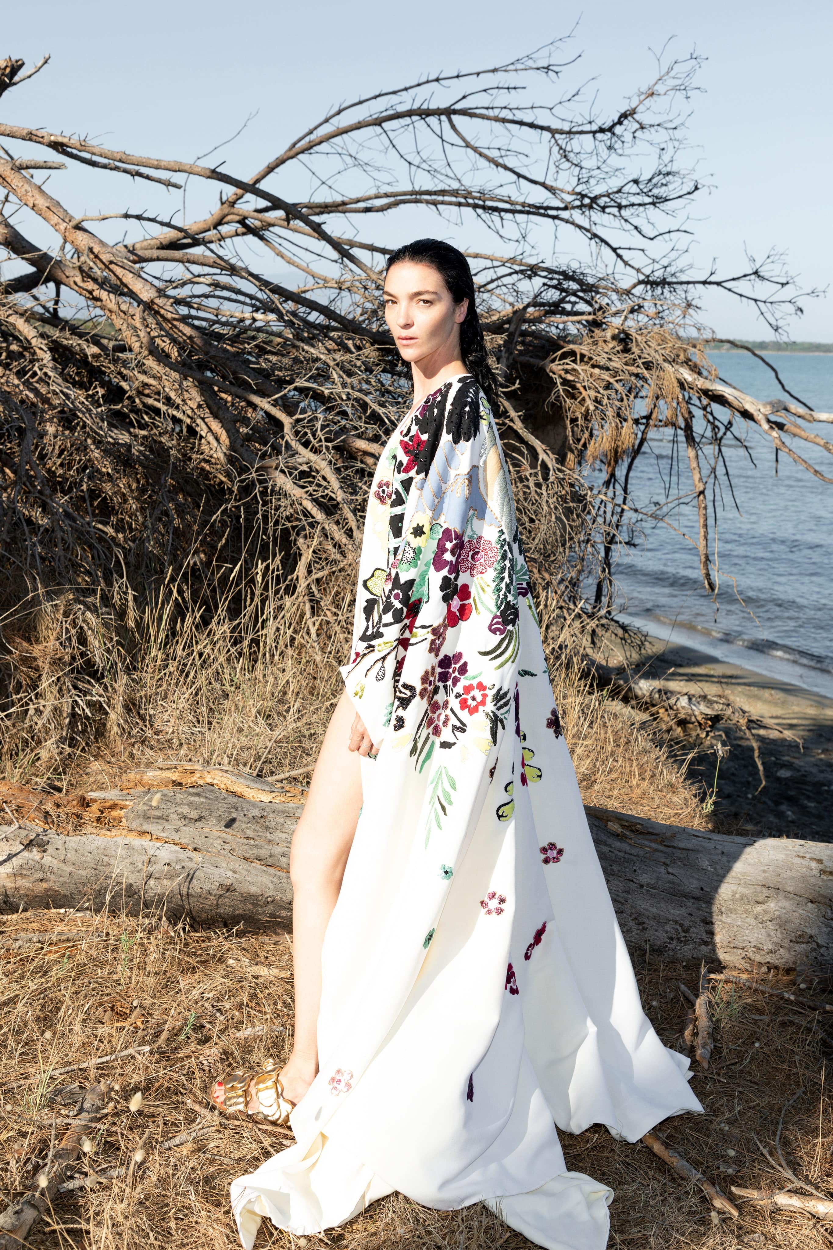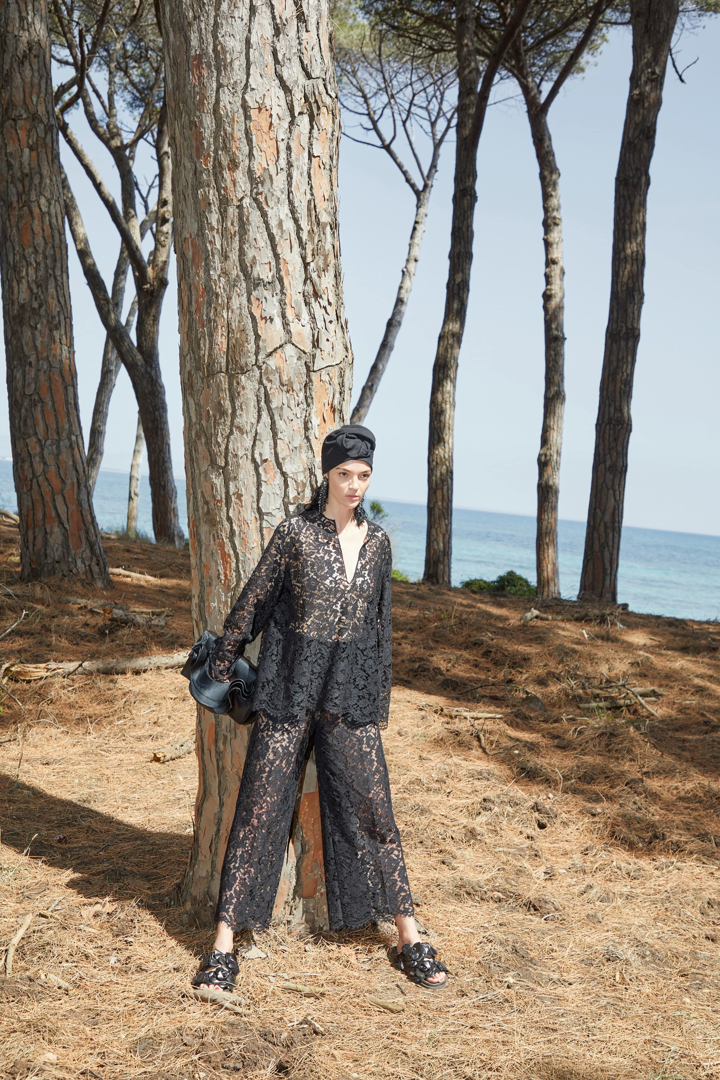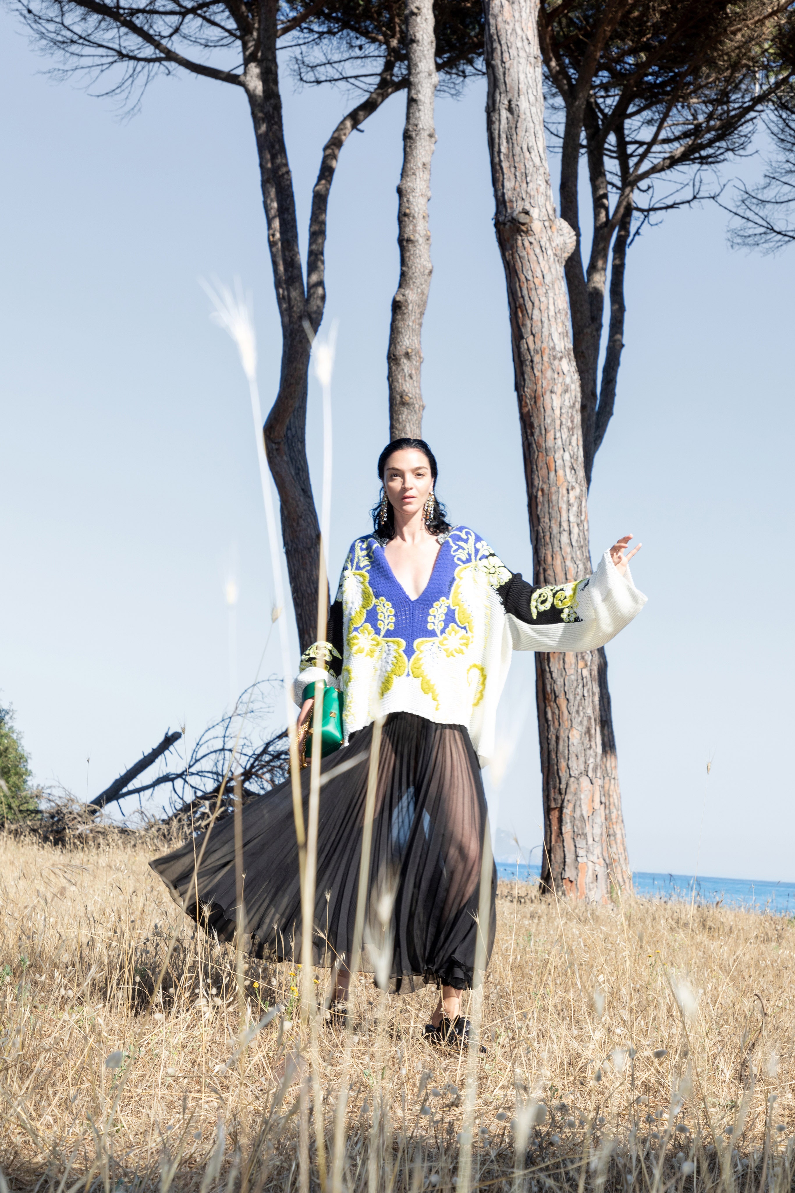 На снимках модель позирует на берегу залива, среди дикой, почти деревенской местности, в кремово-белых платьях миди, уютных и элегантных пончо, свободных брючных костюмах из кружева и богемных нарядах из денима. Ключевыми приемами коллекции стали перья, экзотические орнаменты и знаковые для дизайнера насыщенные оттенки изумруда, аметиста, цветочной пыльцы и розы.
