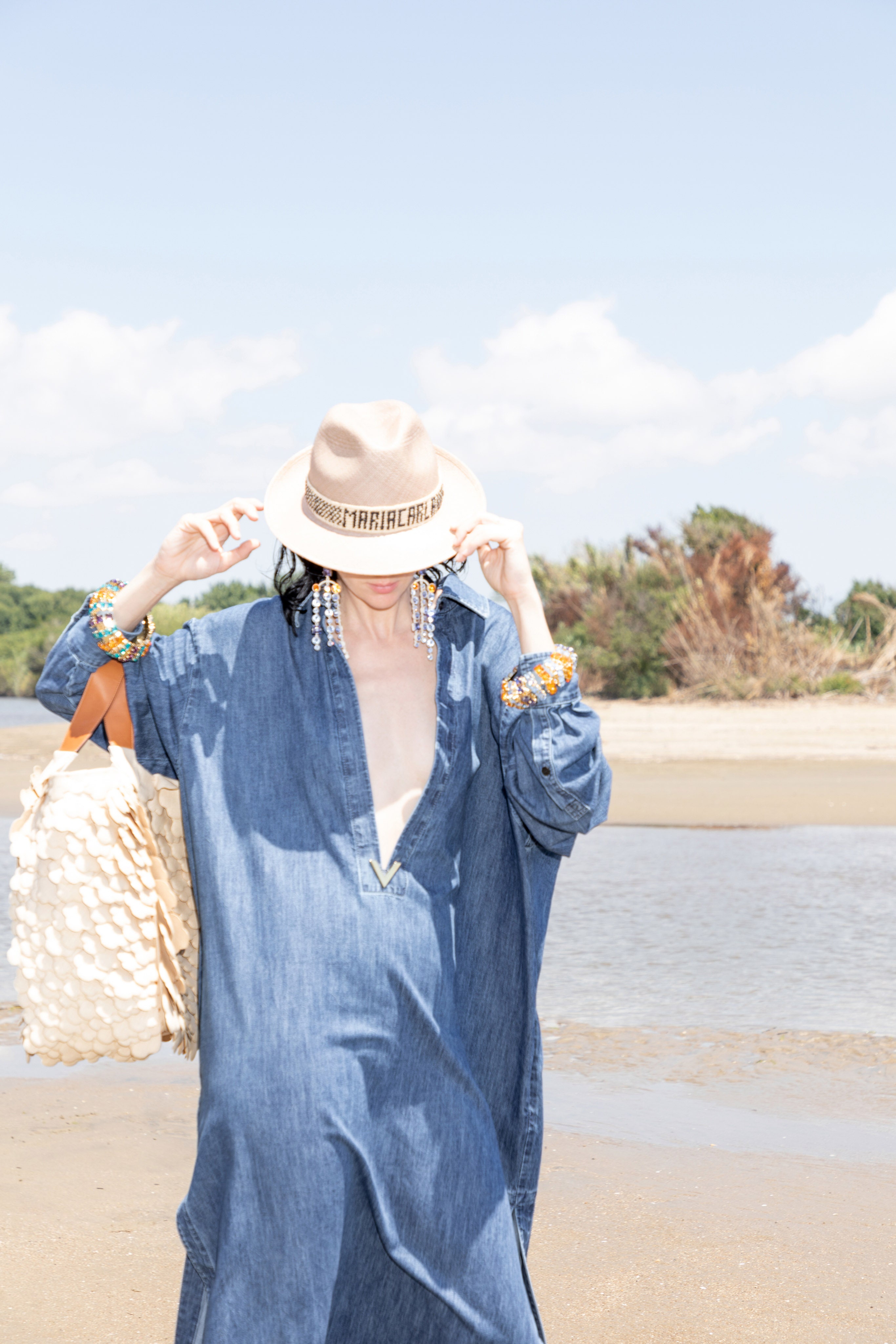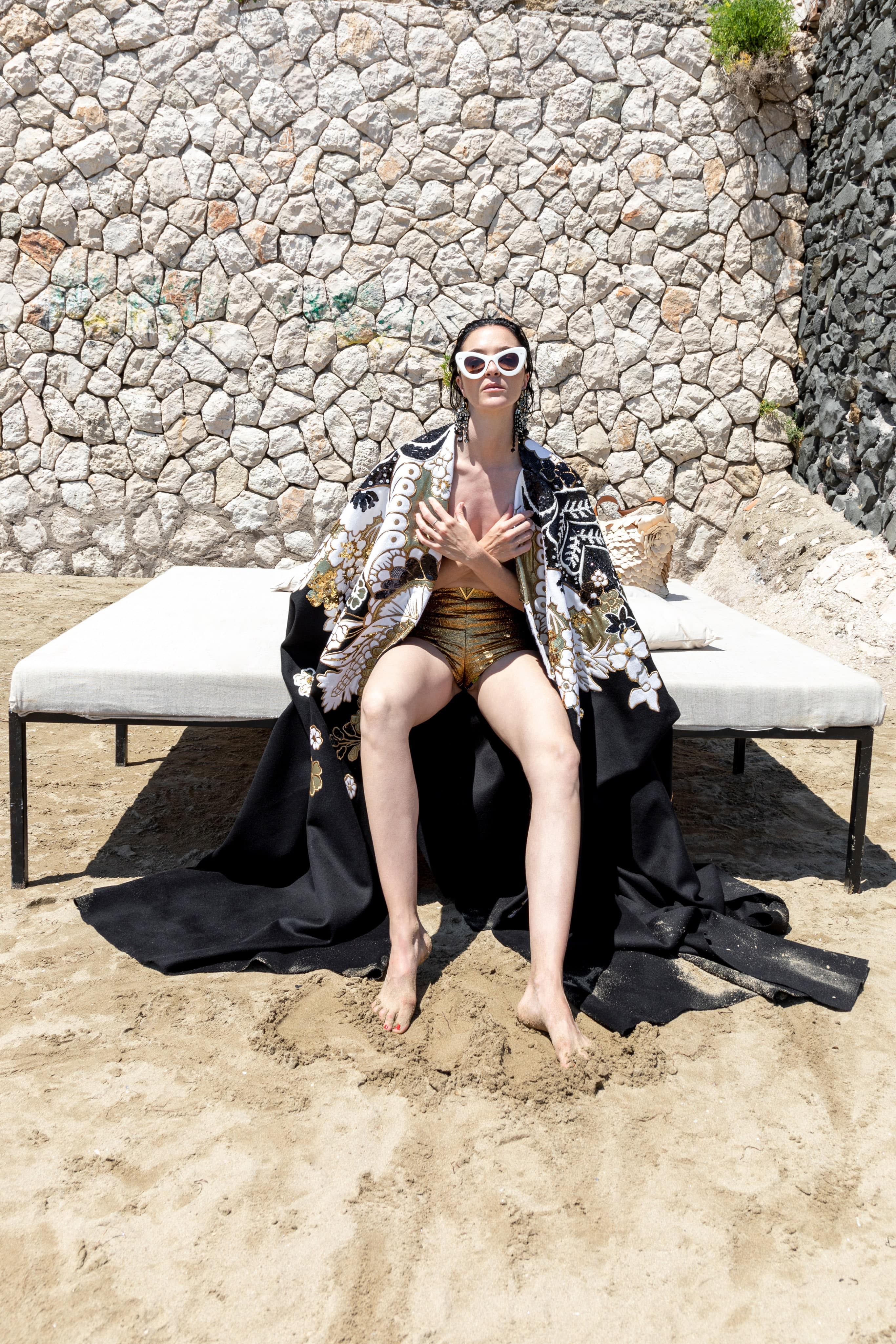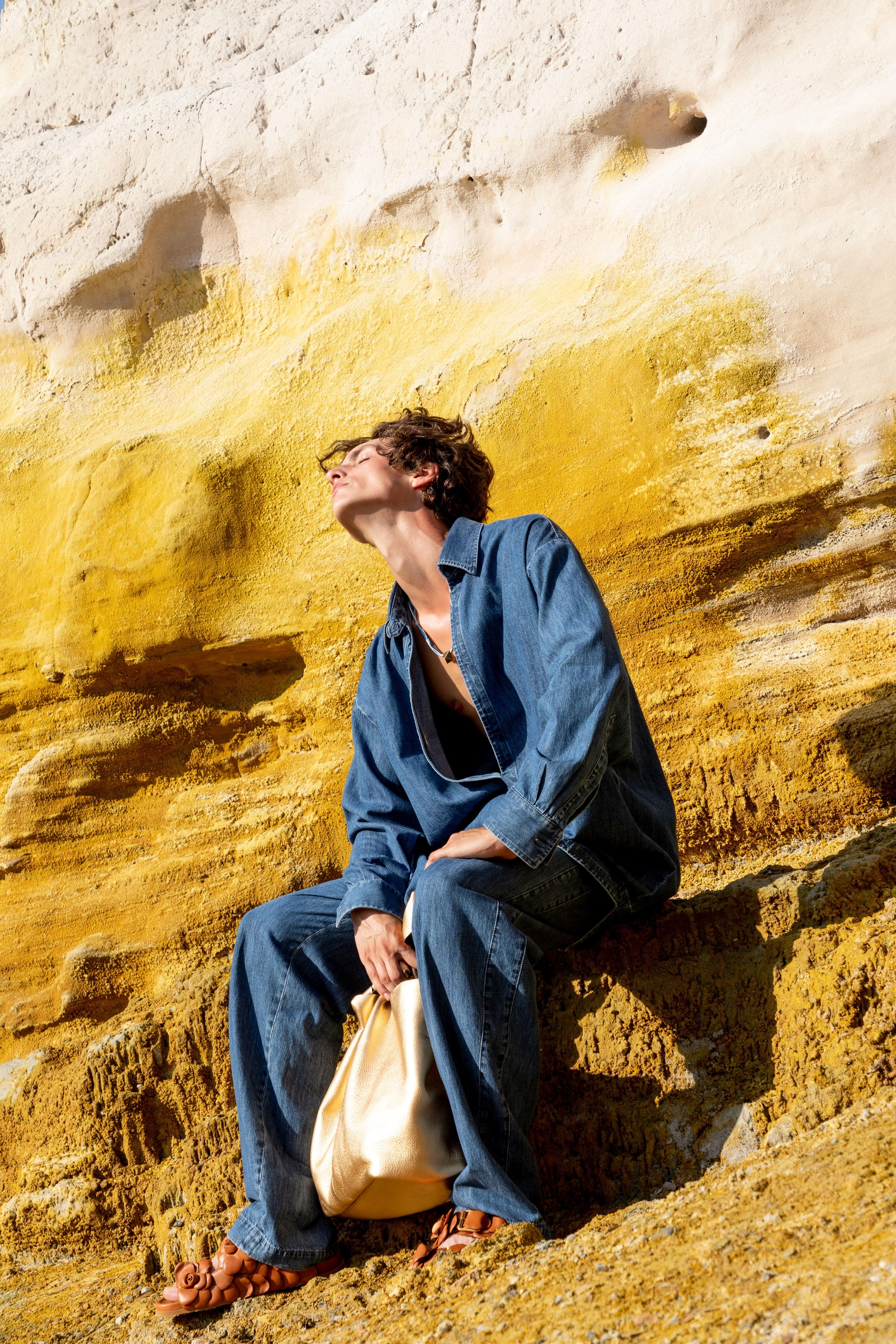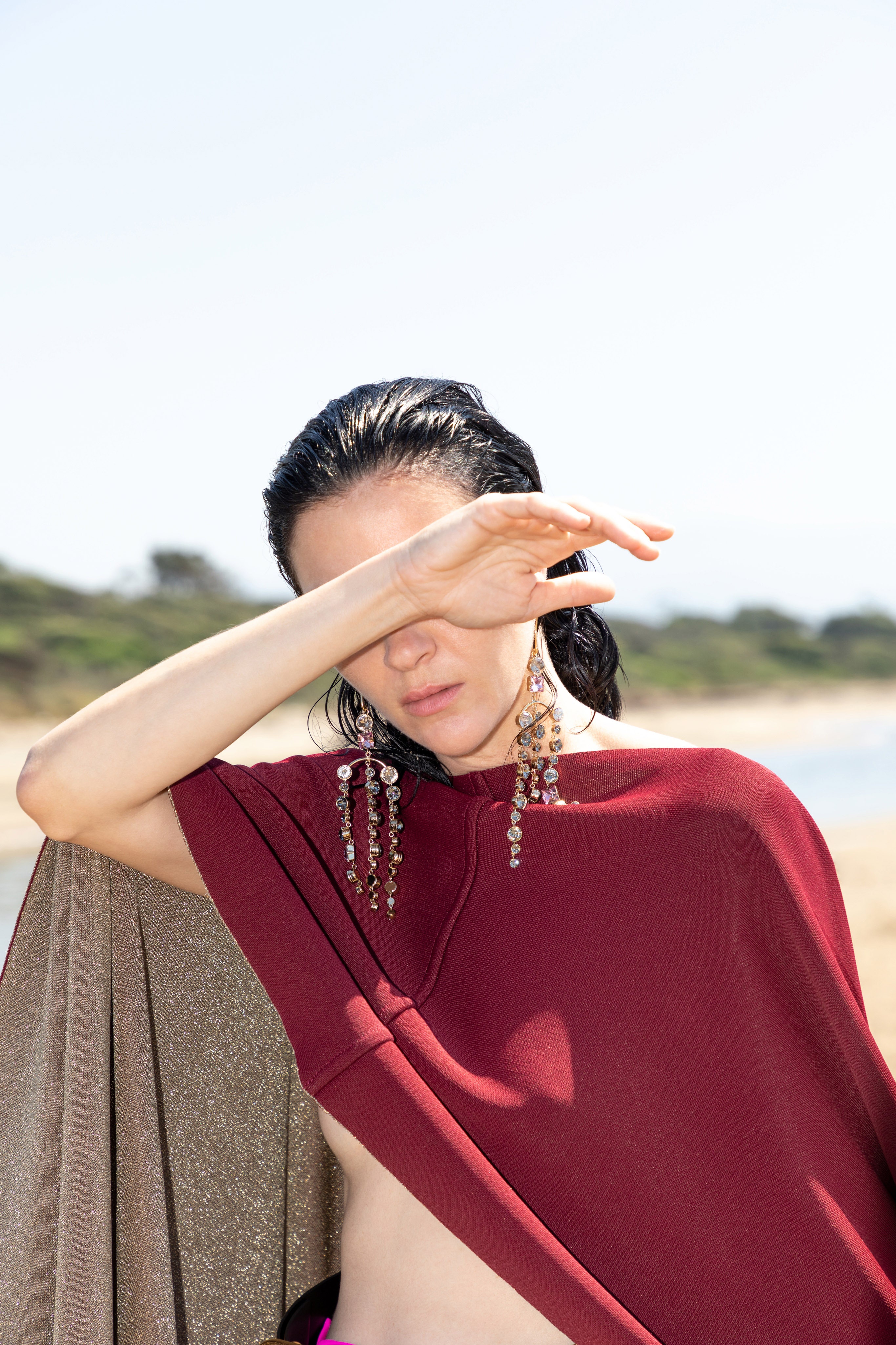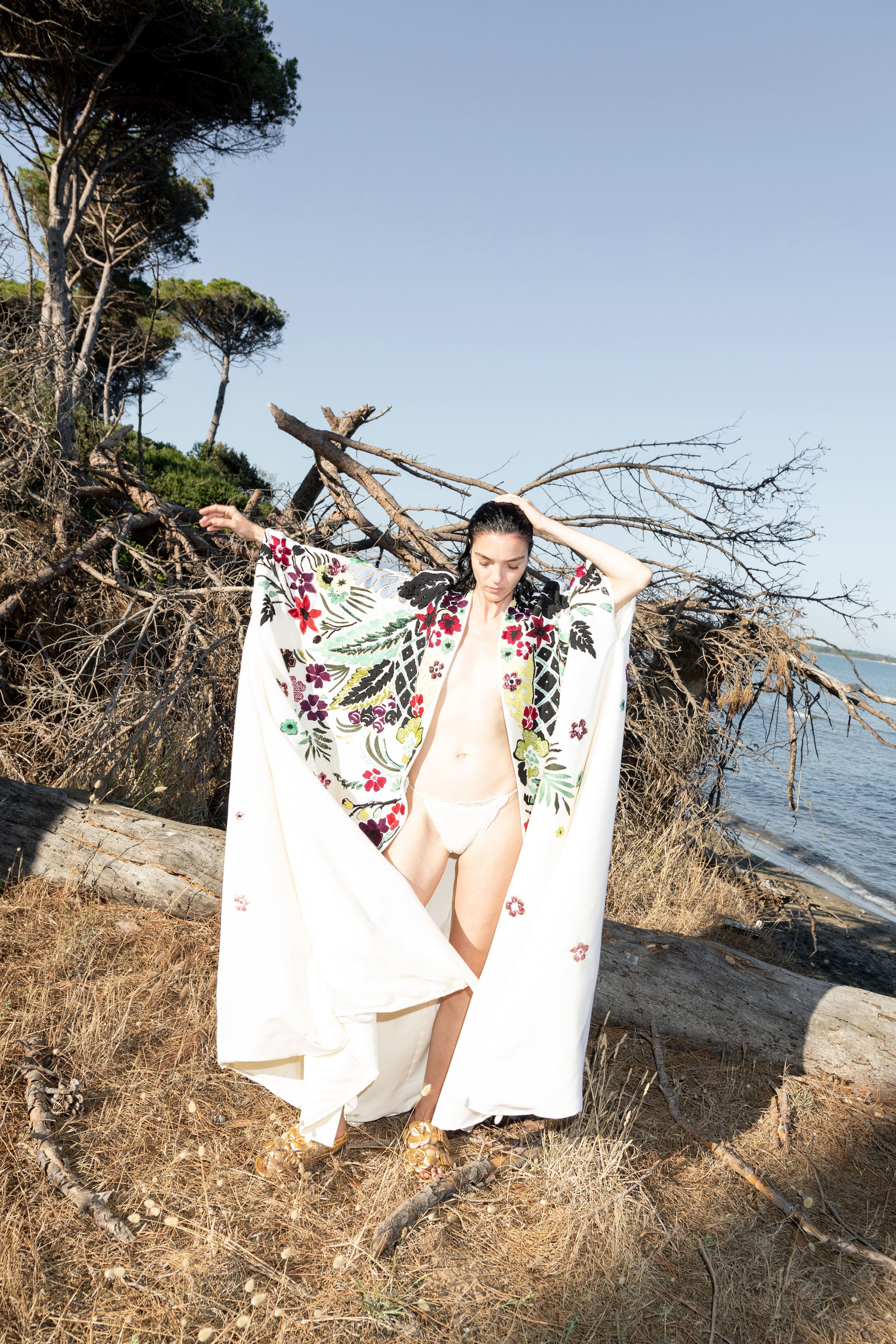 На снимках модель позирует на берегу залива, среди дикой, почти деревенской местности, в кремово-белых платьях миди, уютных и элегантных пончо, свободных брючных костюмах из кружева и богемных нарядах из денима. Ключевыми приемами коллекции стали перья, экзотические орнаменты и знаковые для дизайнера насыщенные оттенки изумруда, аметиста, цветочной пыльцы и розы.
