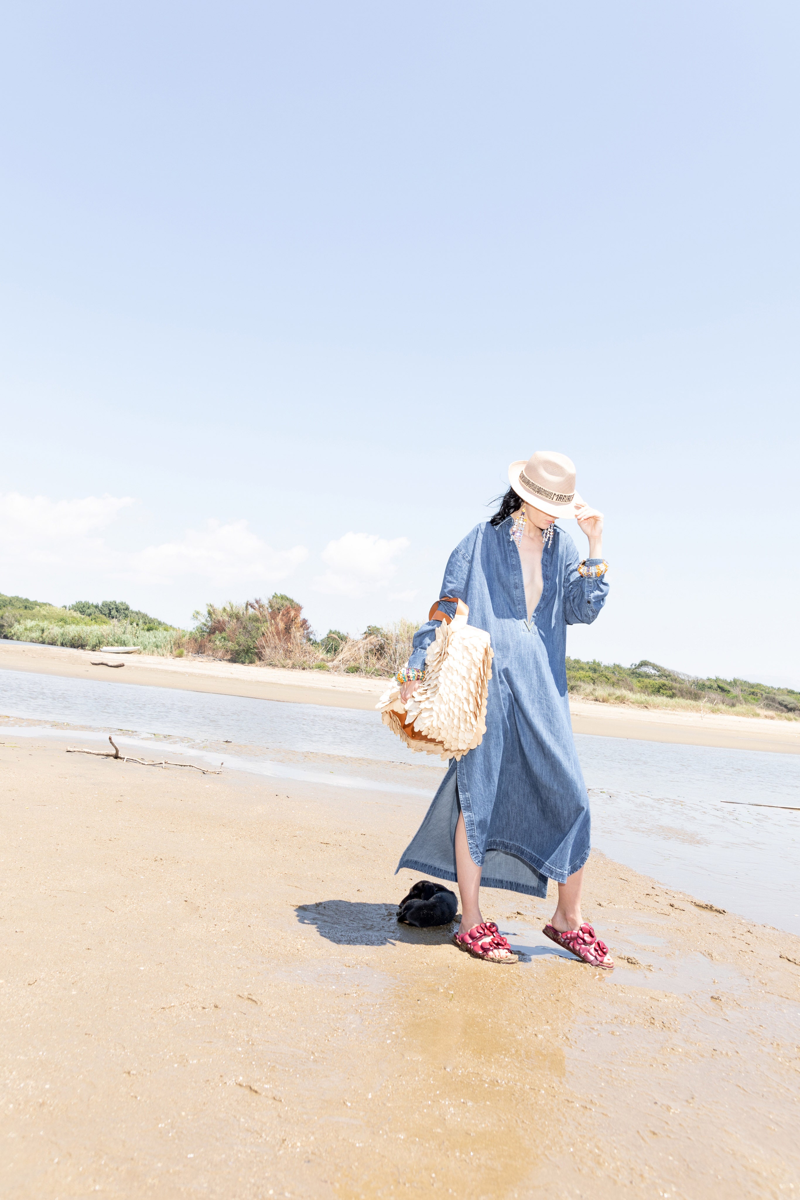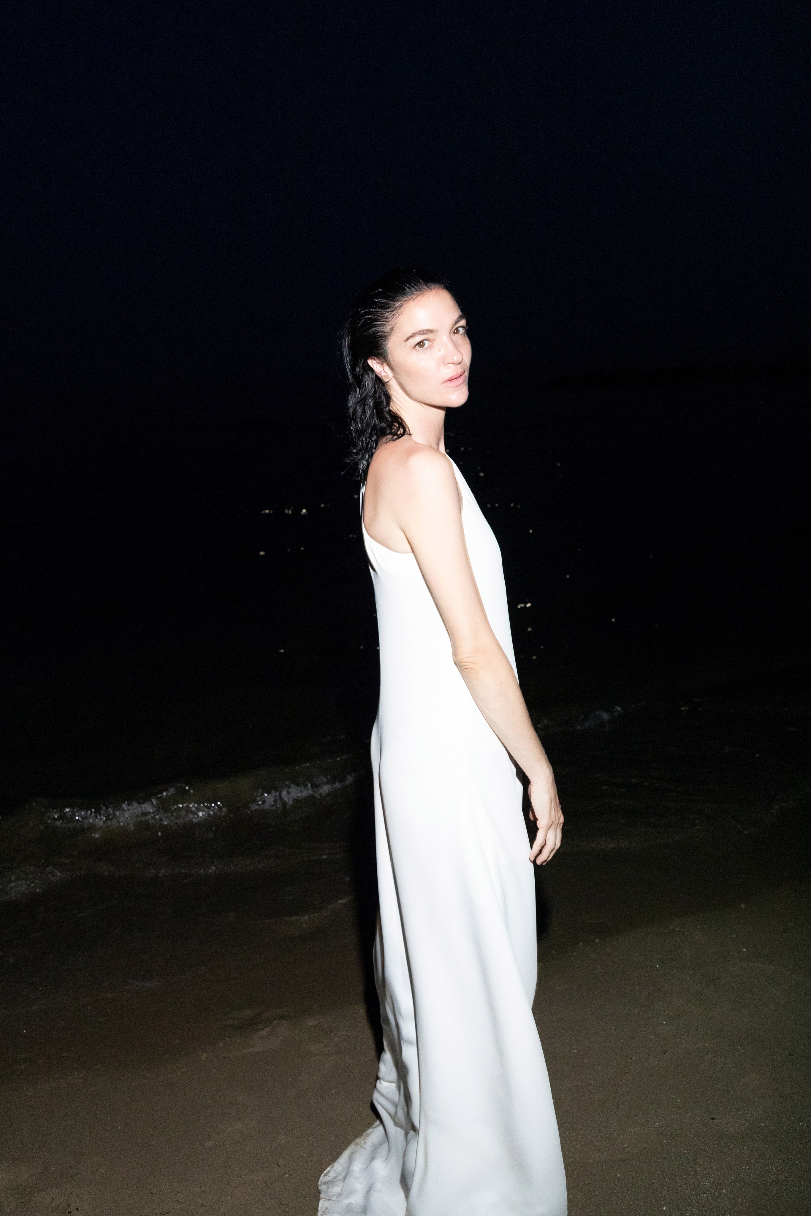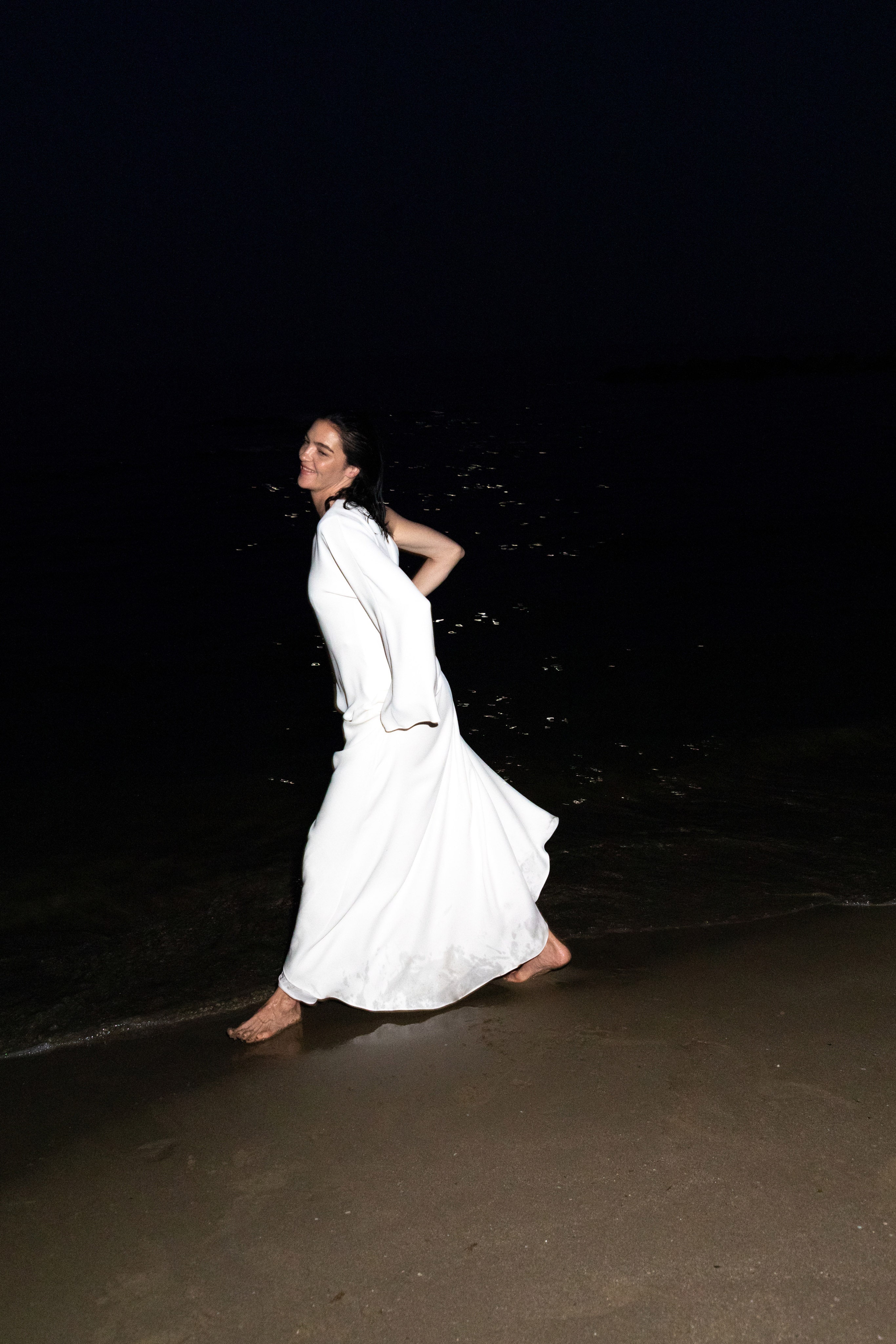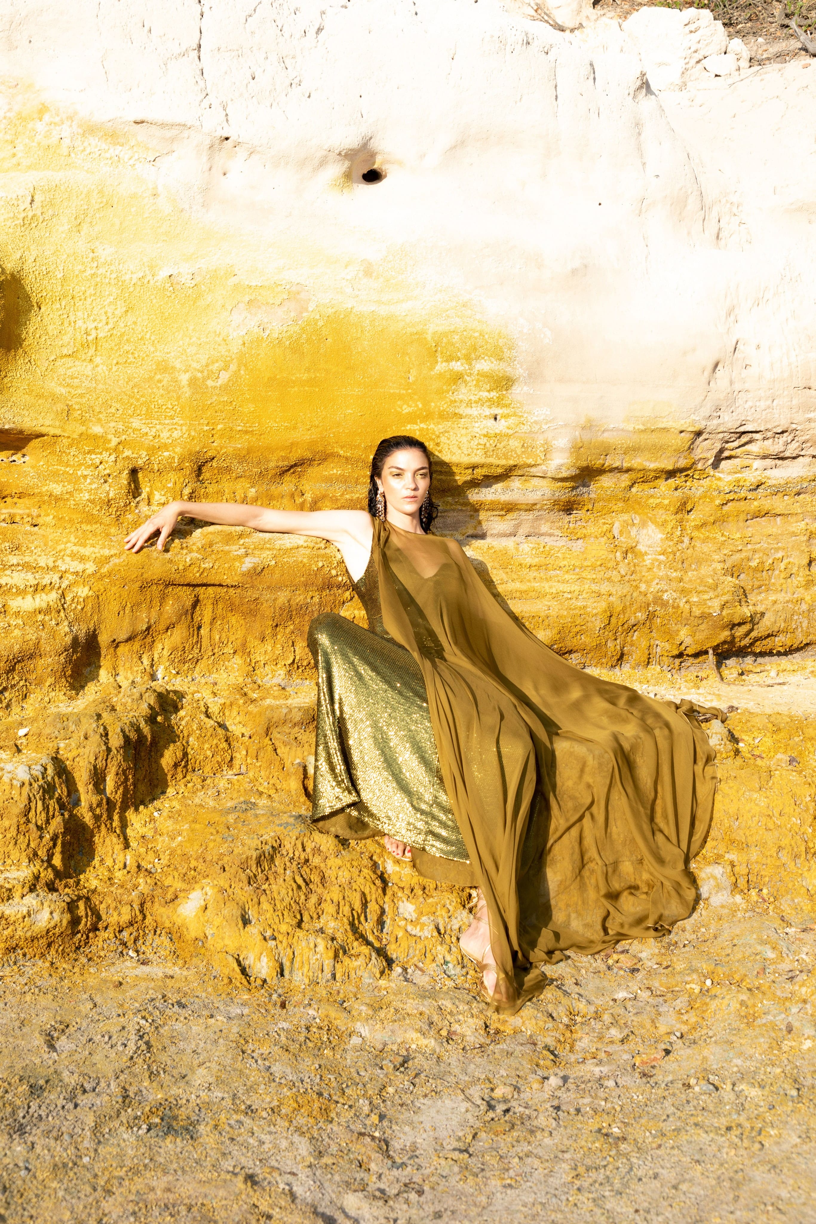 На снимках модель позирует на берегу залива, среди дикой, почти деревенской местности, в кремово-белых платьях миди, уютных и элегантных пончо, свободных брючных костюмах из кружева и богемных нарядах из денима. Ключевыми приемами коллекции стали перья, экзотические орнаменты и знаковые для дизайнера насыщенные оттенки изумруда, аметиста, цветочной пыльцы и розы.