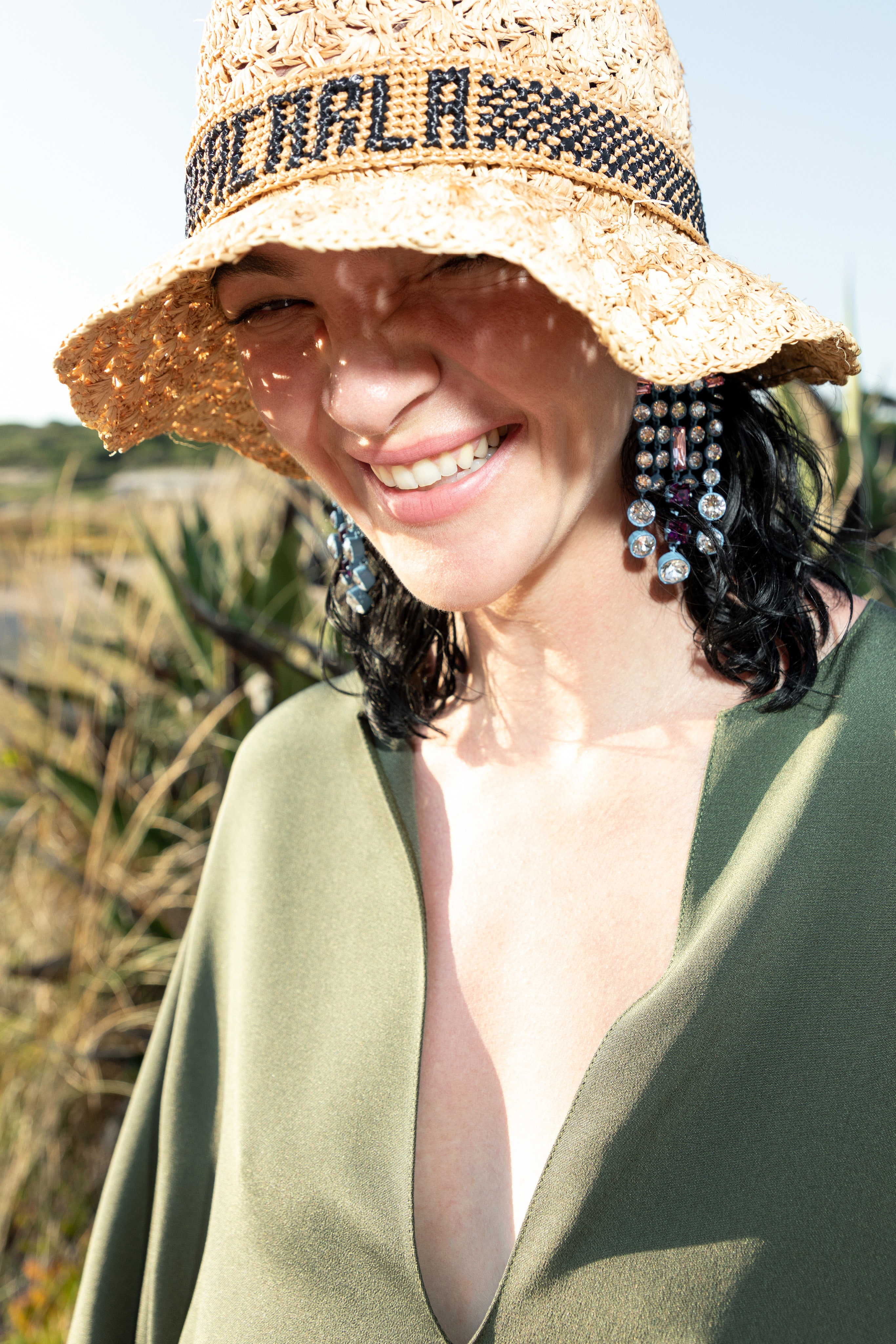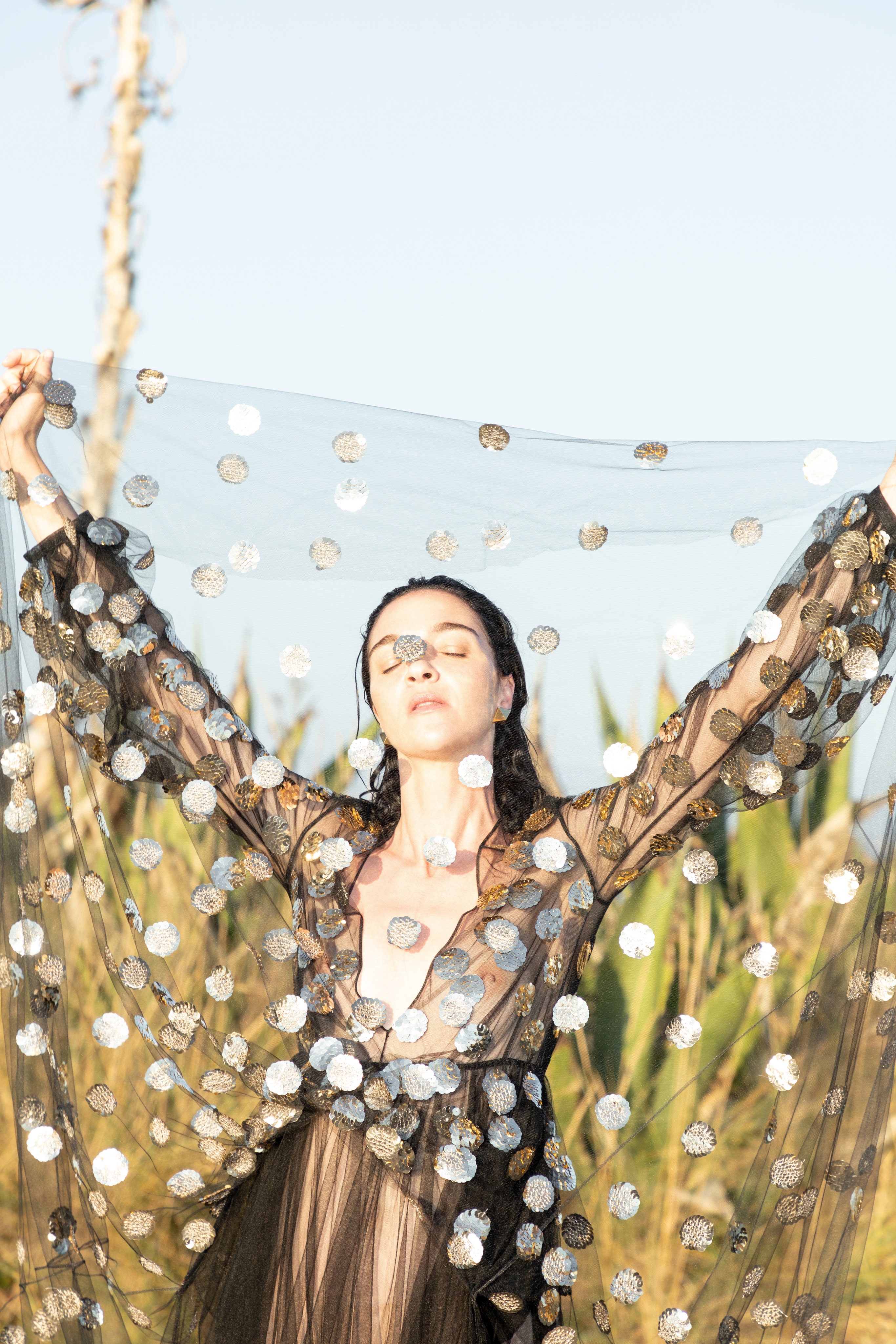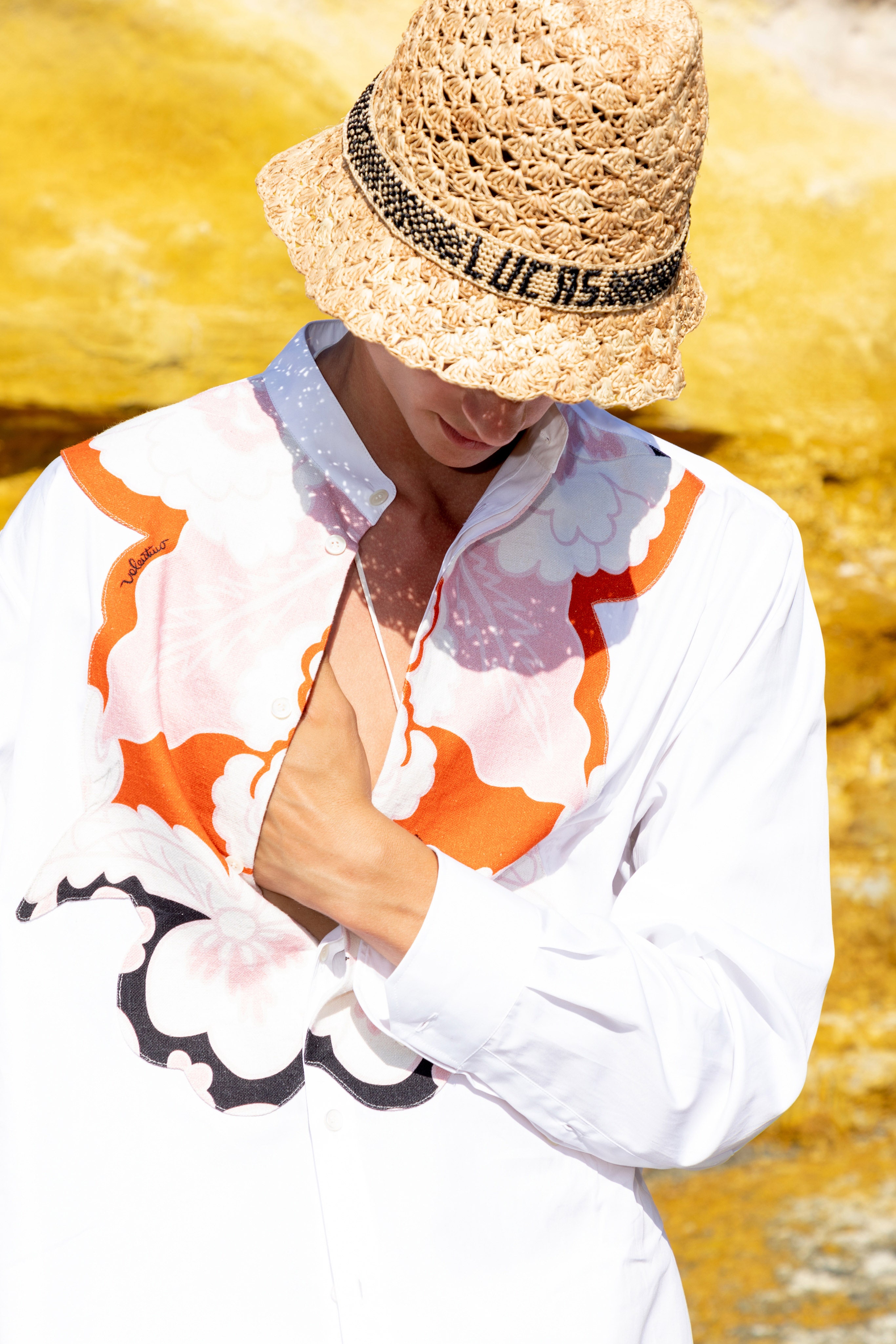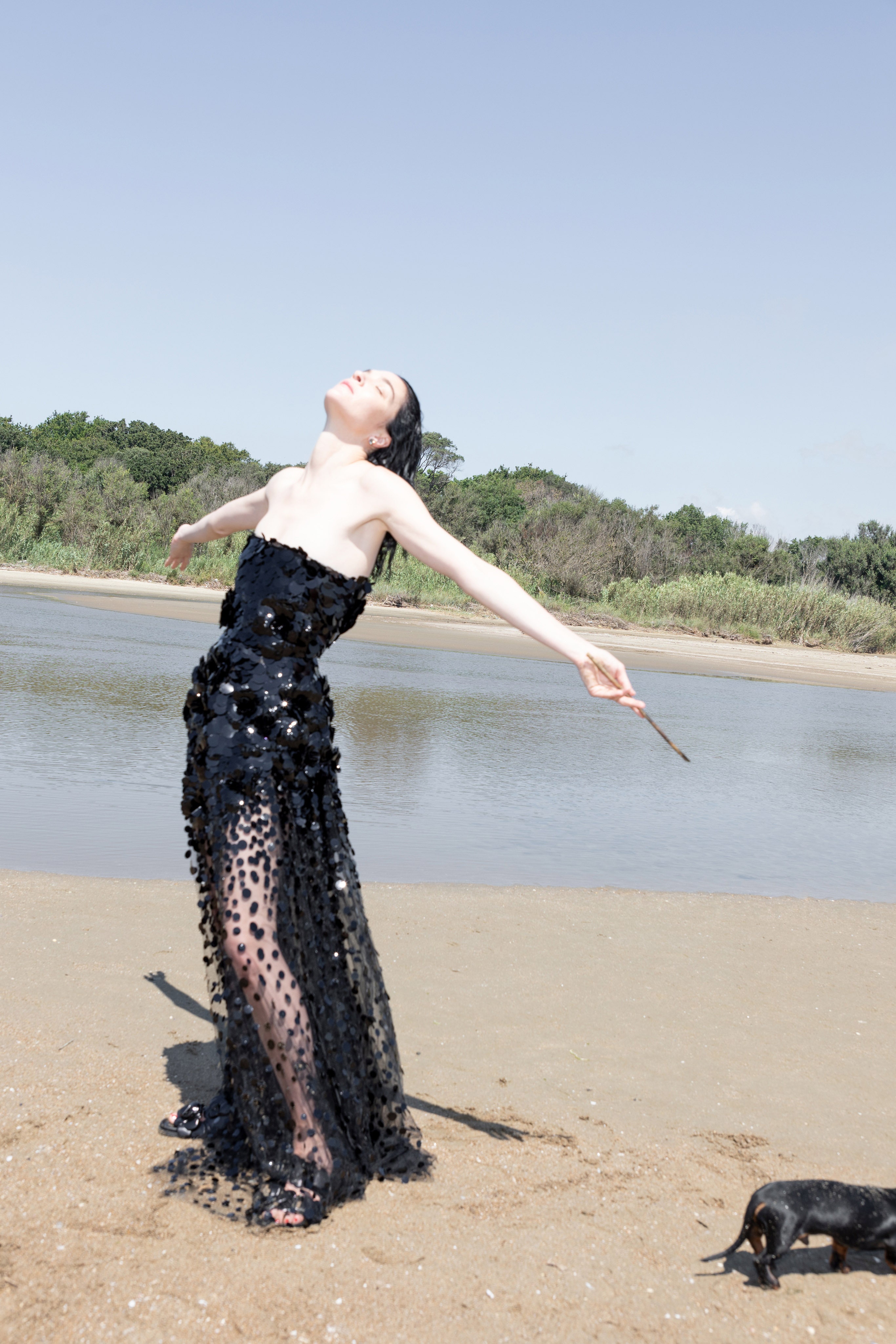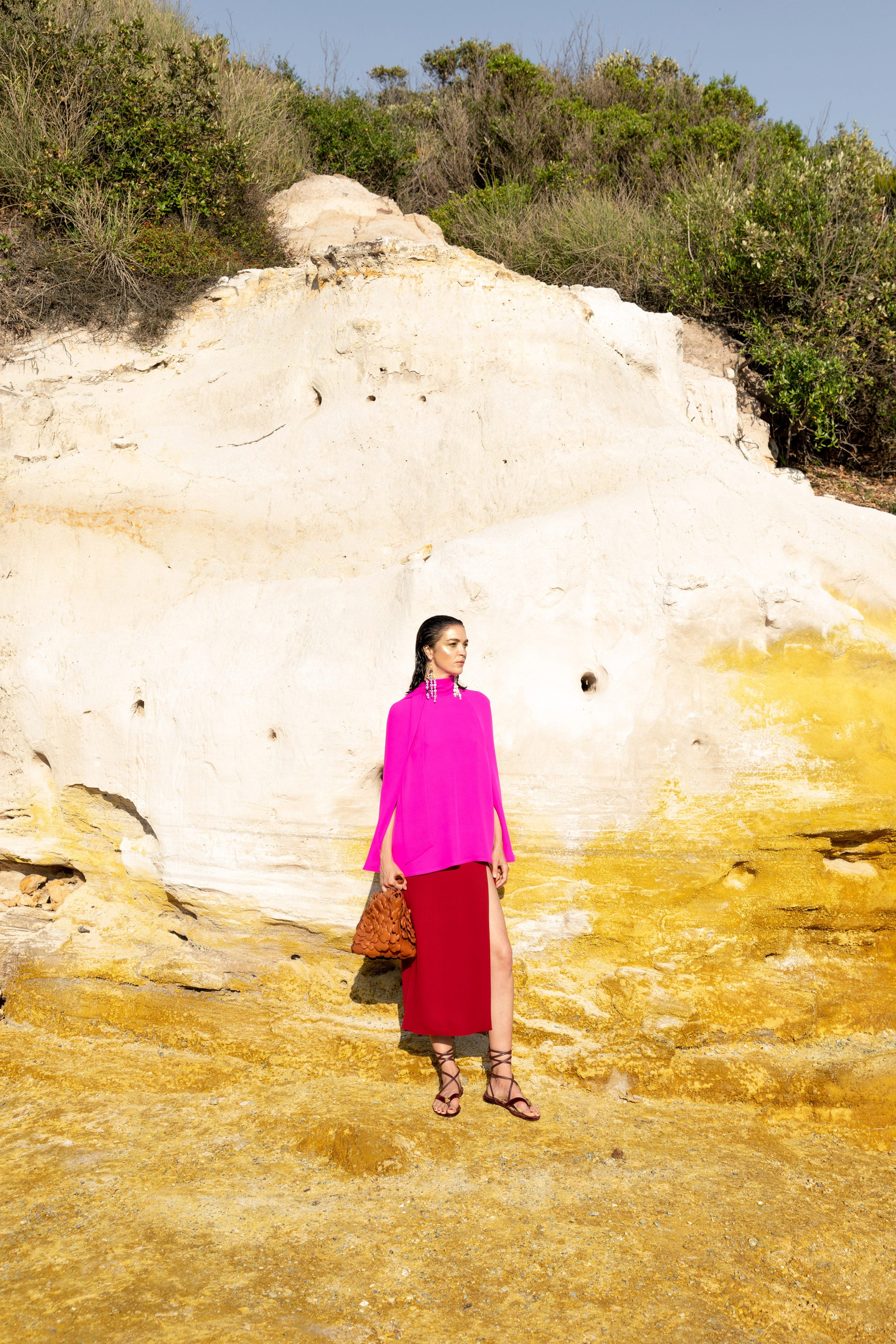 На снимках модель позирует на берегу залива, среди дикой, почти деревенской местности, в кремово-белых платьях миди, уютных и элегантных пончо, свободных брючных костюмах из кружева и богемных нарядах из денима. Ключевыми приемами коллекции стали перья, экзотические орнаменты и знаковые для дизайнера насыщенные оттенки изумруда, аметиста, цветочной пыльцы и розы.
