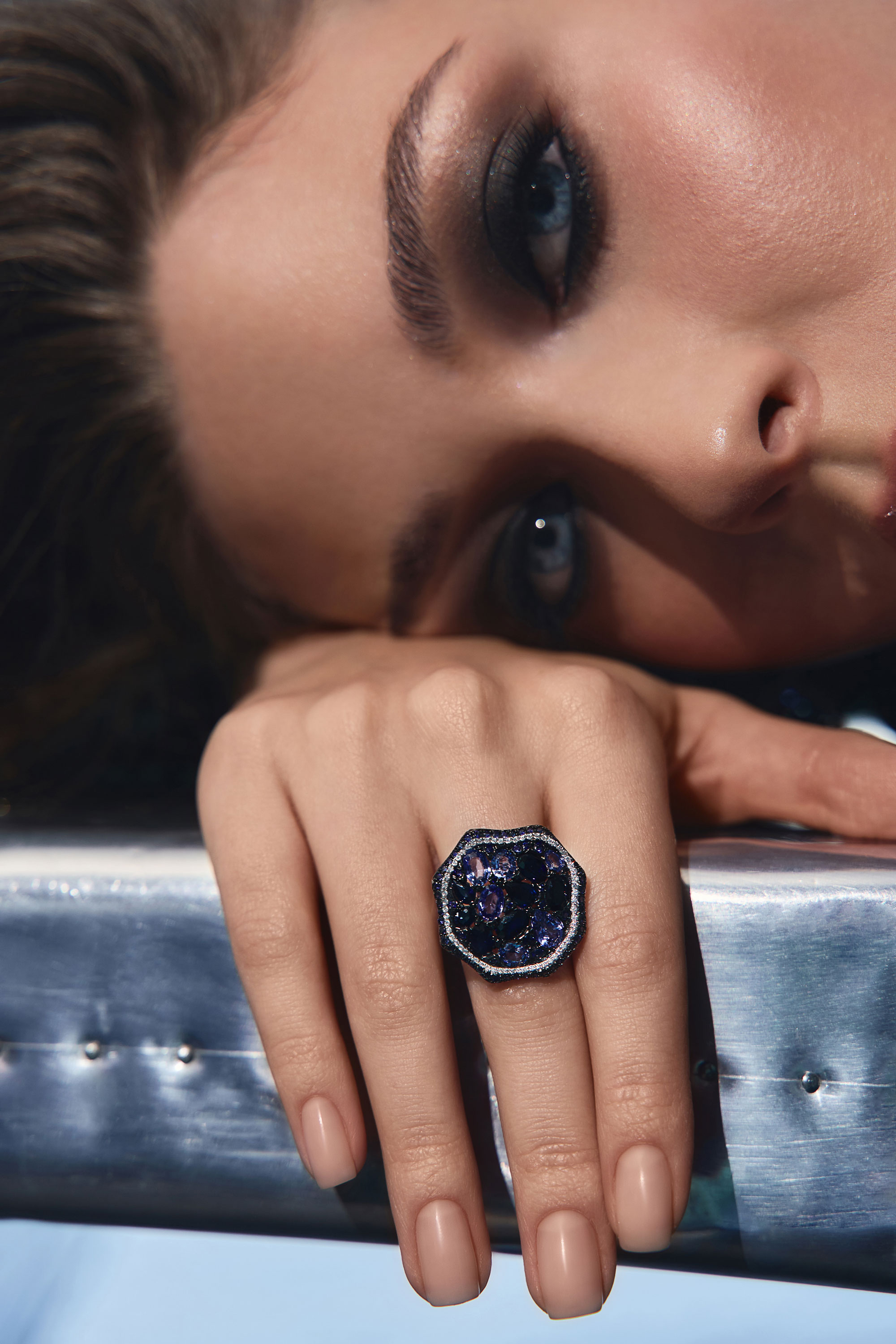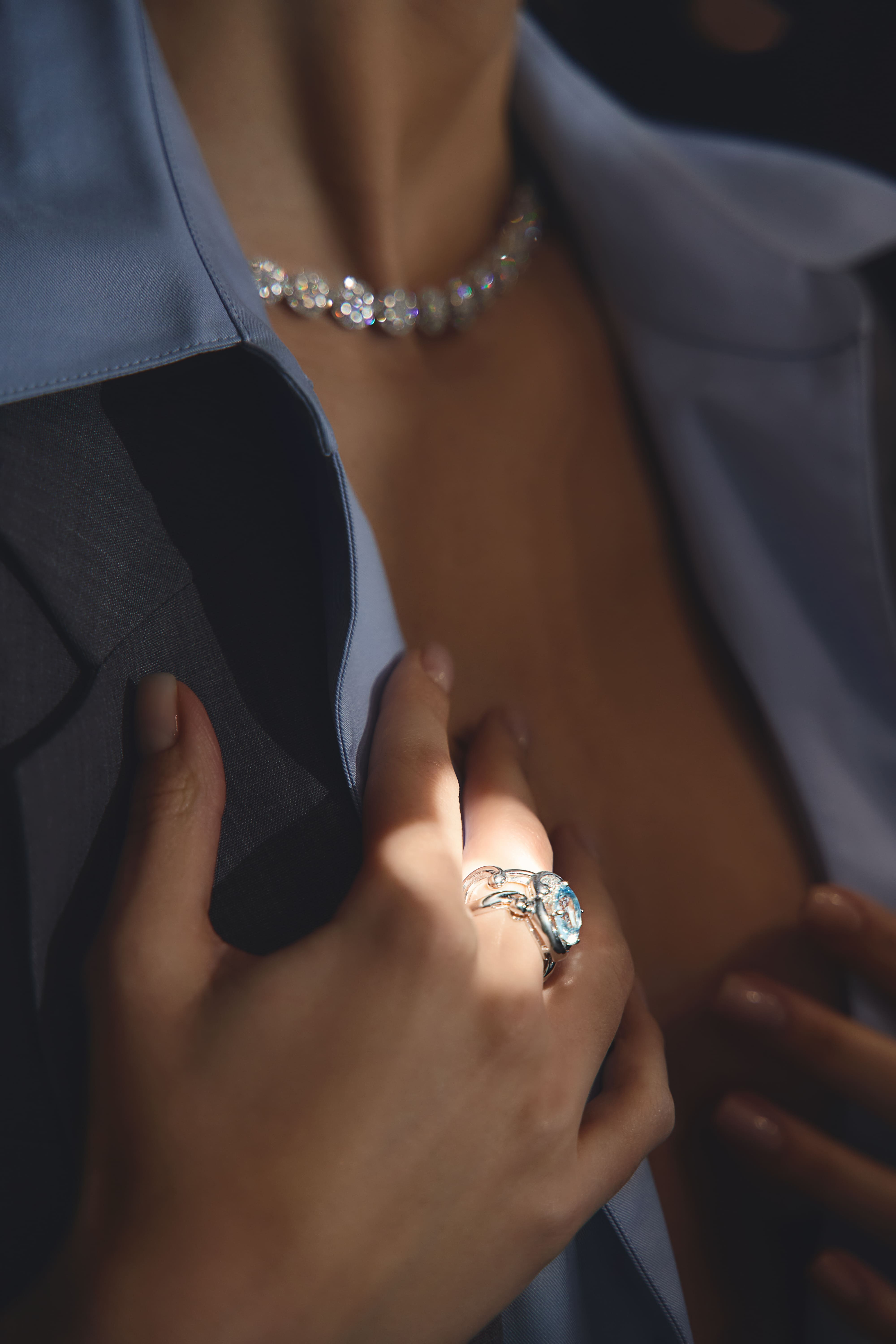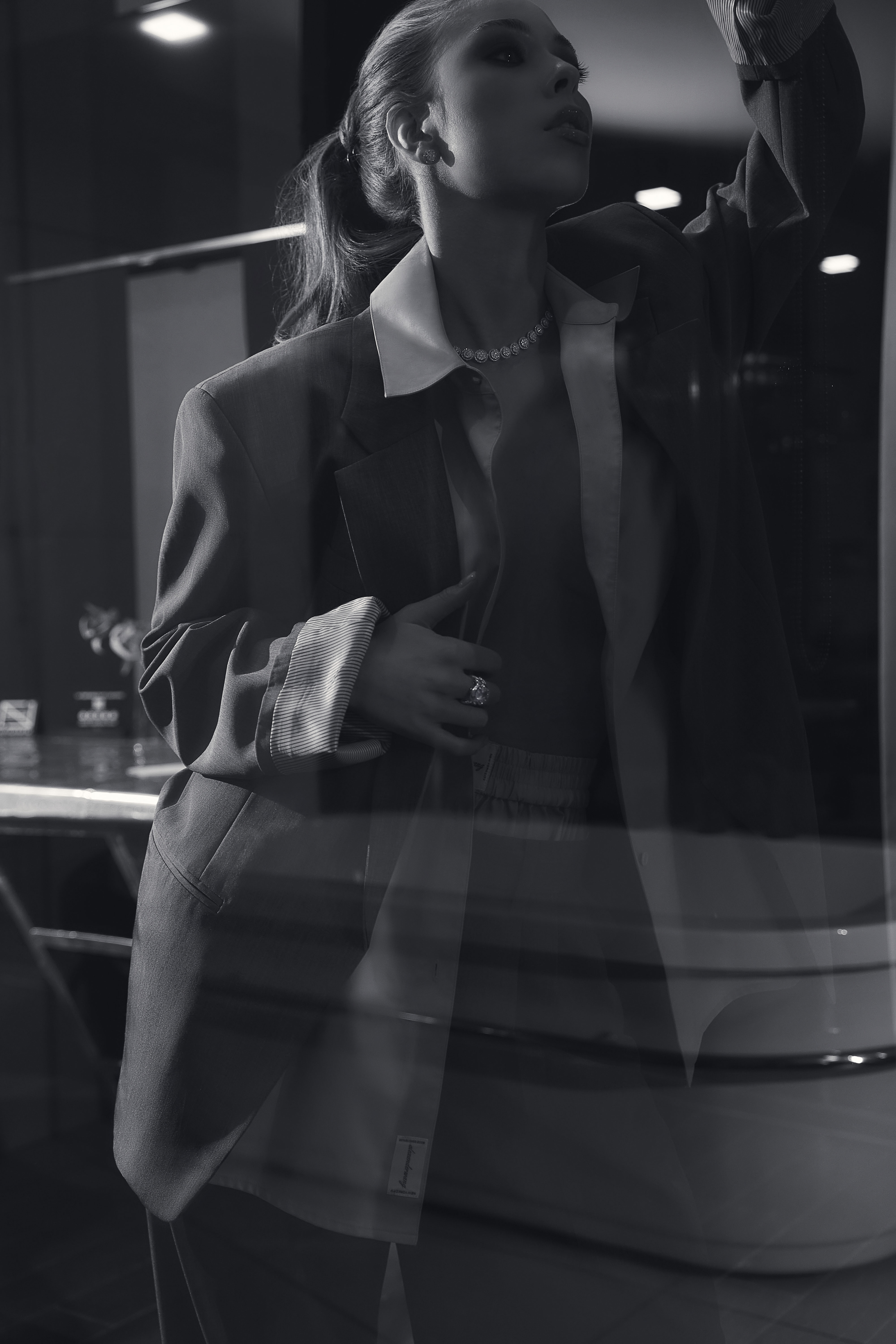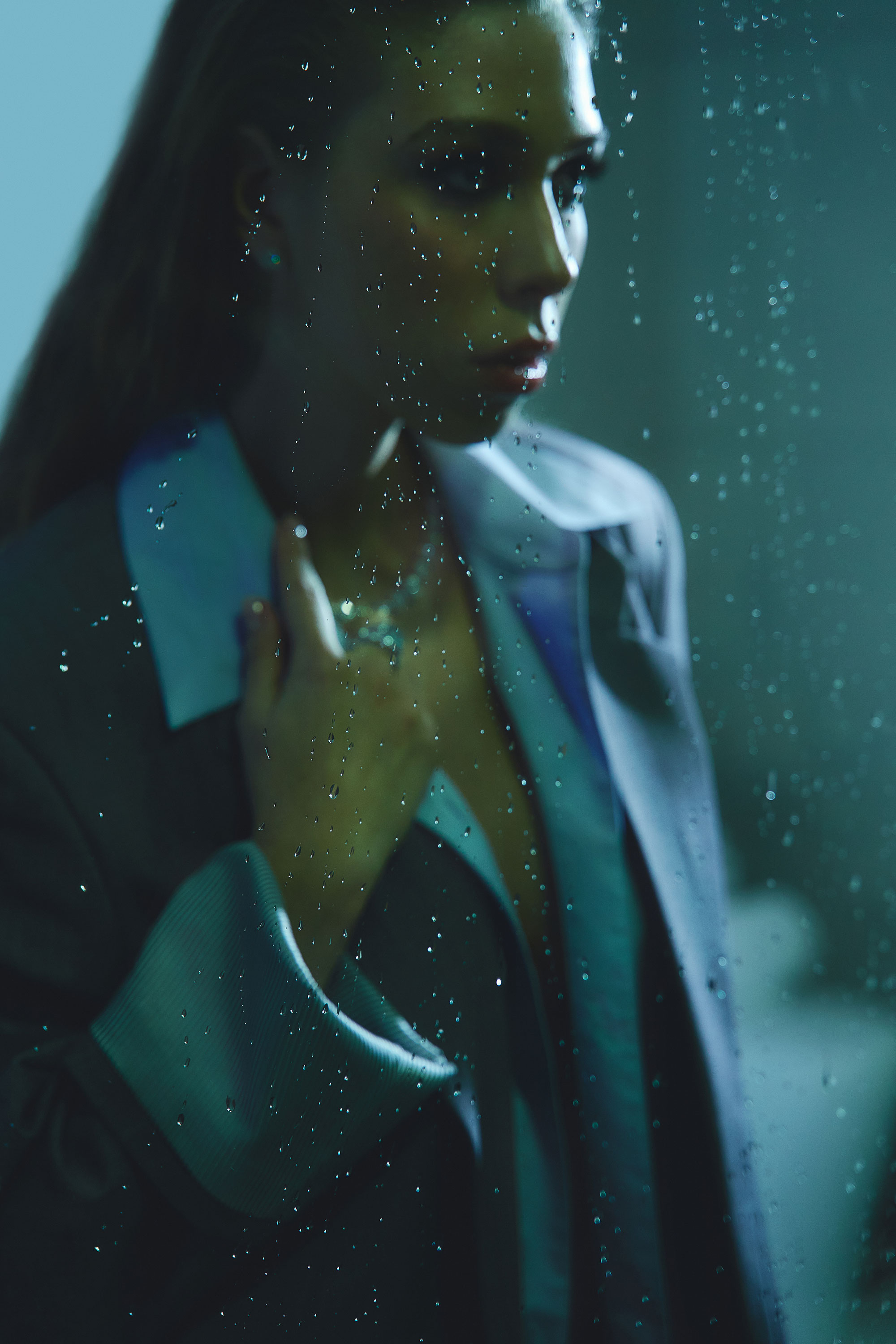Історія сильної та впевненої жінки представлена через призму першого образу зйомки – піджаку та брюках від бренду Dries Van Noten. Оксамитовий матеріал надає цим елементам гардеробу вишуканість та теплоту. Смарагдовий колір додає образу елегантності та таємничості. Комфортний крій і прості форми штанів підкреслюють дух вільності та індивідуальності. Образ доповнюється прикрасами з білого золота з діамантами та сапфірами, пропонуючи унікальний погляд на аксесуарний вплив.