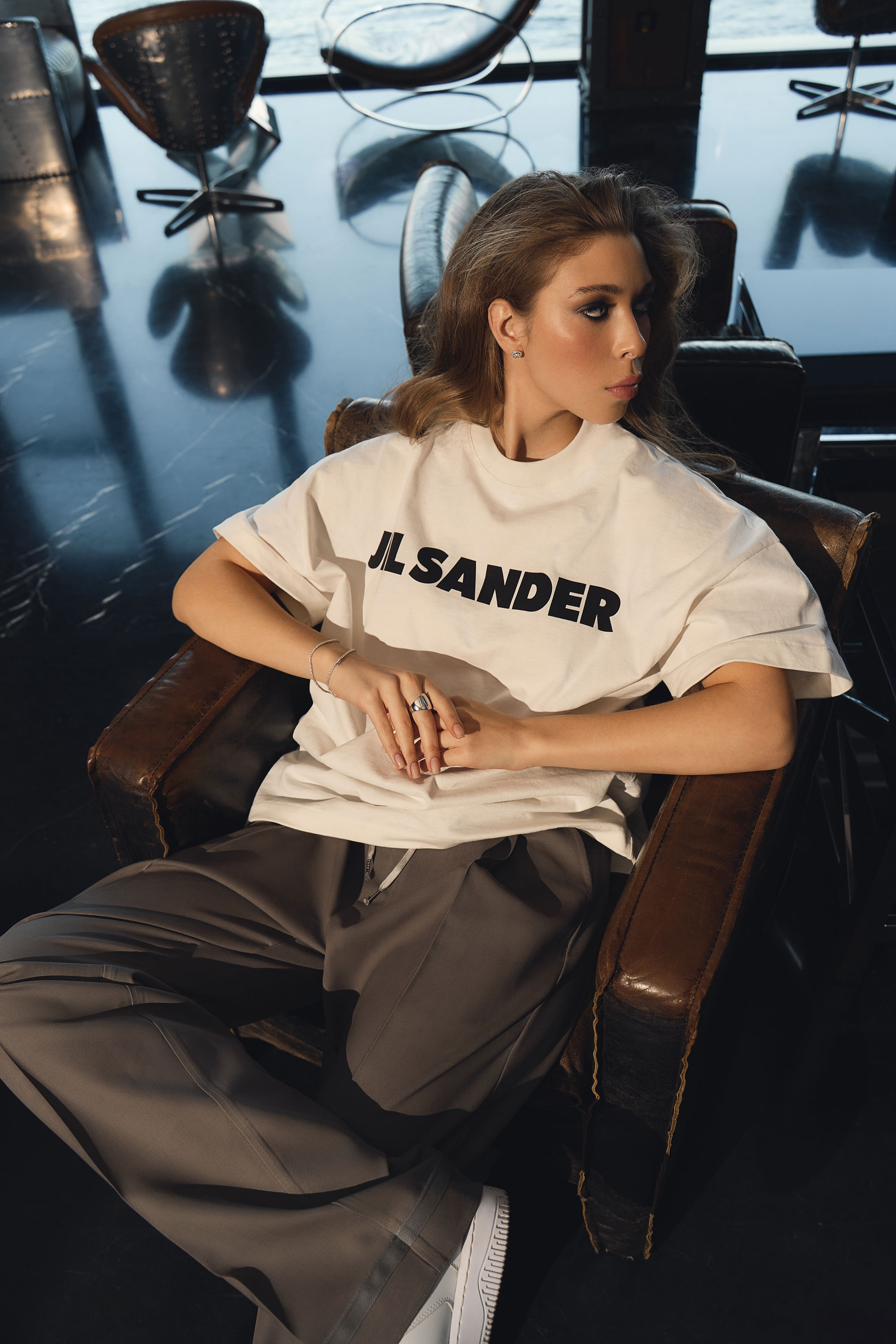 Класична футболка з бавовни є не тільки предметом одягу, але й справжньою statement-річчю. Лаконічний дизайн втілює цінності мінімалізму та передає дух сучасності. Інший елемент образу – класичні сірі брюки з вовни – позачасове вкладення у гардероб. Прикраси втілюють баланс фемінності та маскулінності, розставляючи правильні акценти.