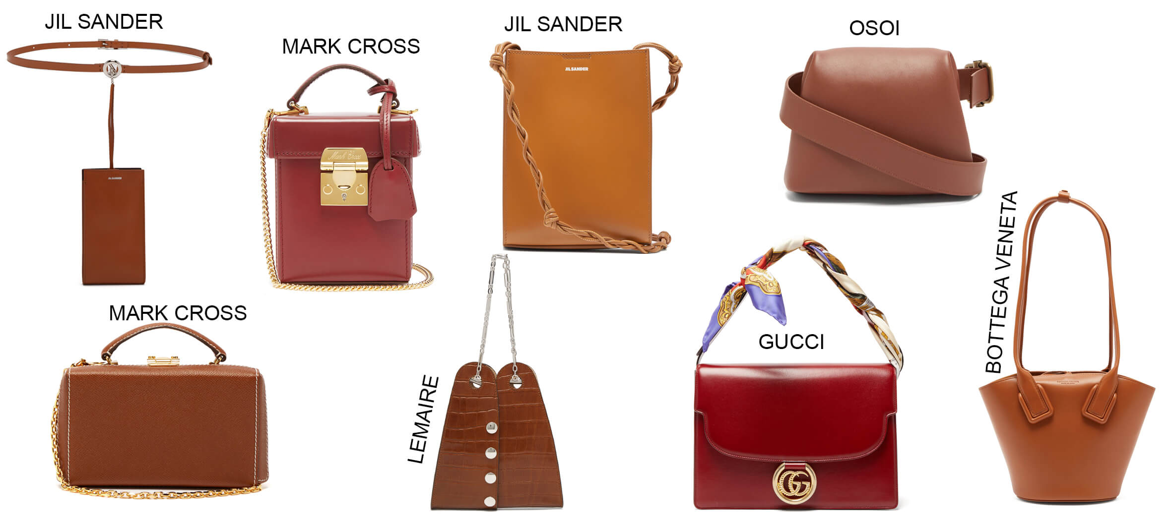 Оттенок опавшей листвы, разбеленного бургунди или верблюжьей шерсти — сумка любого из этих тонов будет уместна как в повседневных и деловых, так и в вечерних образах, как в случае с ручными сумочками Lemaire и Mark Cross и поясным чехлом для телефона и необходимых мелочей от Jil Sander.