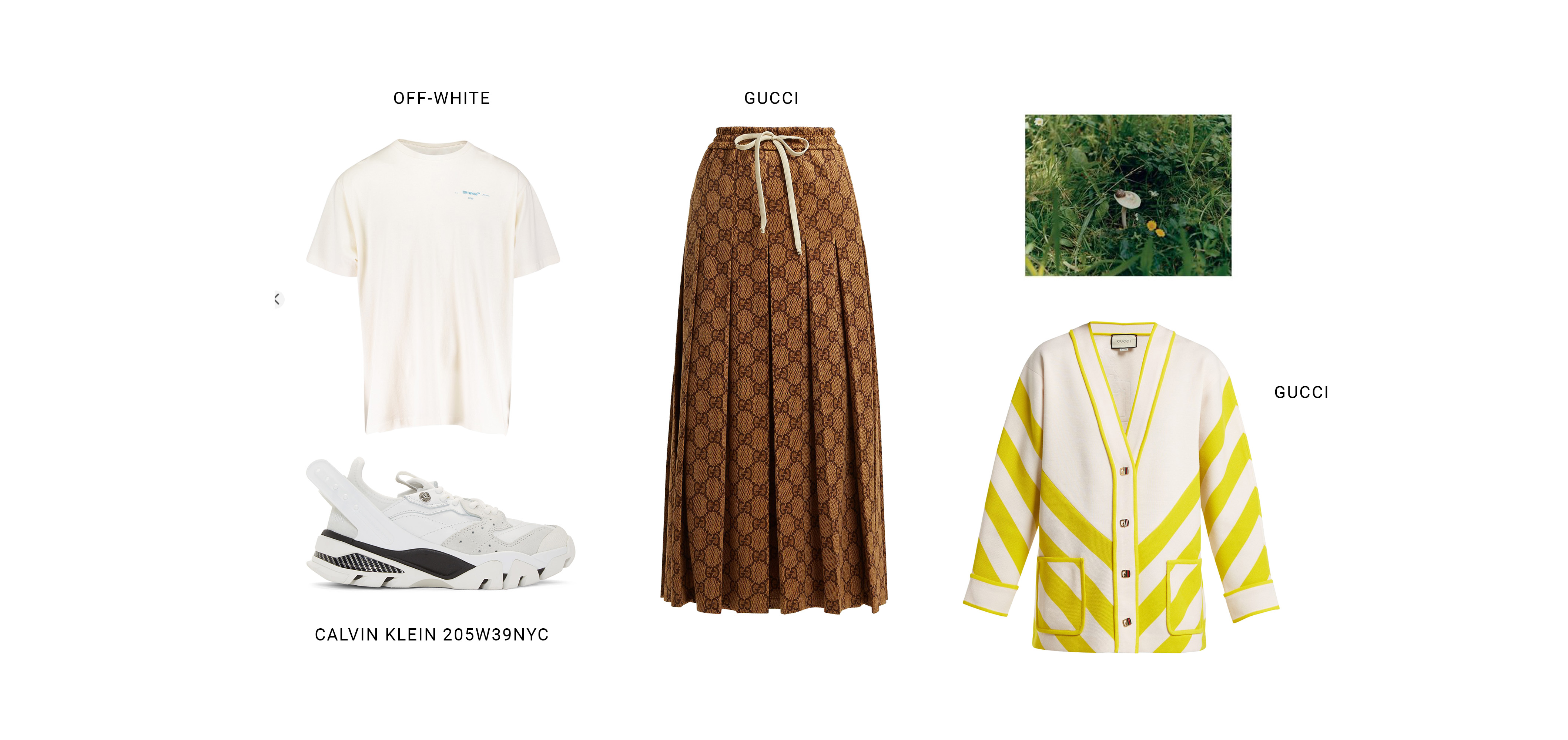 Юбку Gucci, расшитую сеткой логотипов, сочетайте с "папиными" кроссовками Calvin Klein, контрастным кардиганом в полоску и простой белой футболкой.