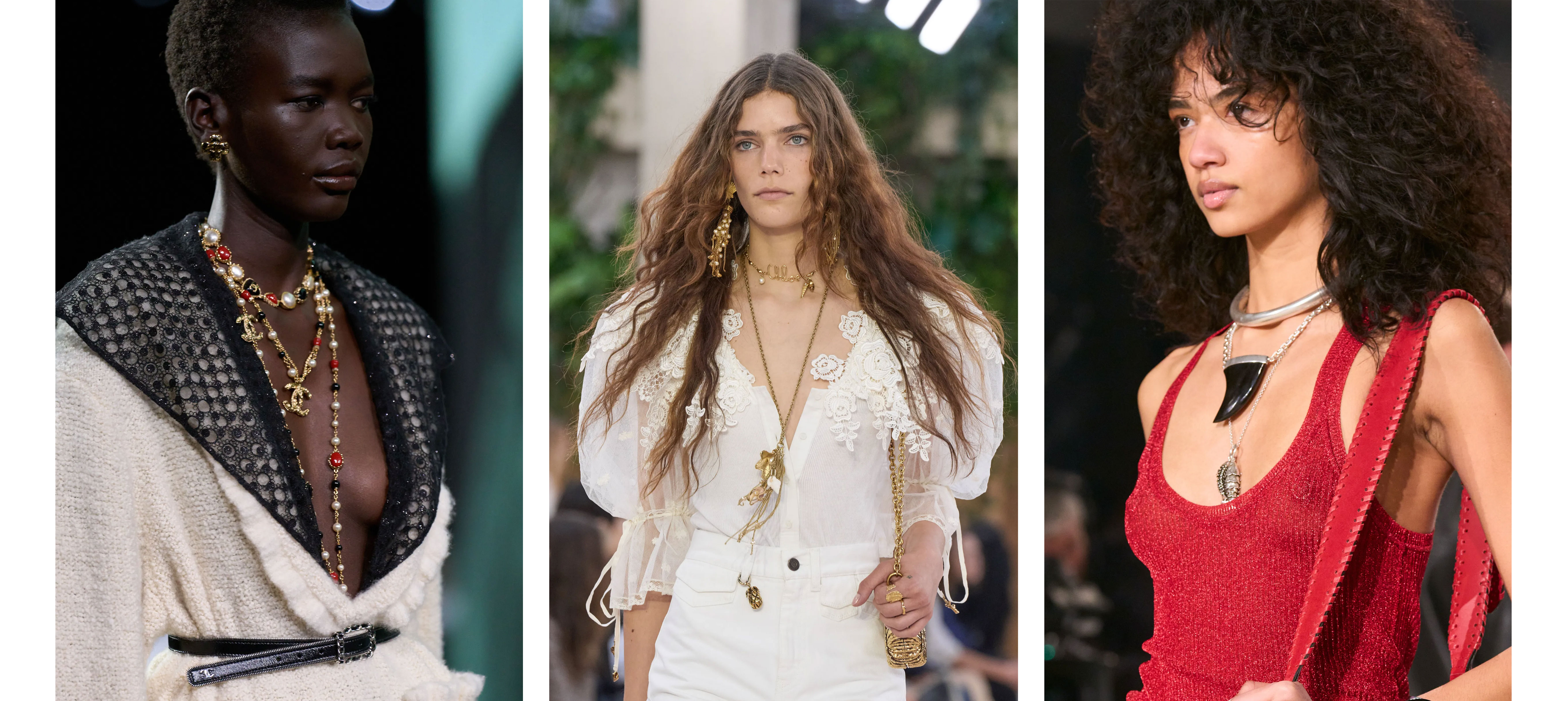 Ряди прикрас на шиї дозволяють модним образам стати більш контрастними. Цей стильовий орієнтир ми помітили в Chanel — тут і кольє, і кулон, і довге намисто. Долучилися до тренду також Isabel Marant та Chloé.