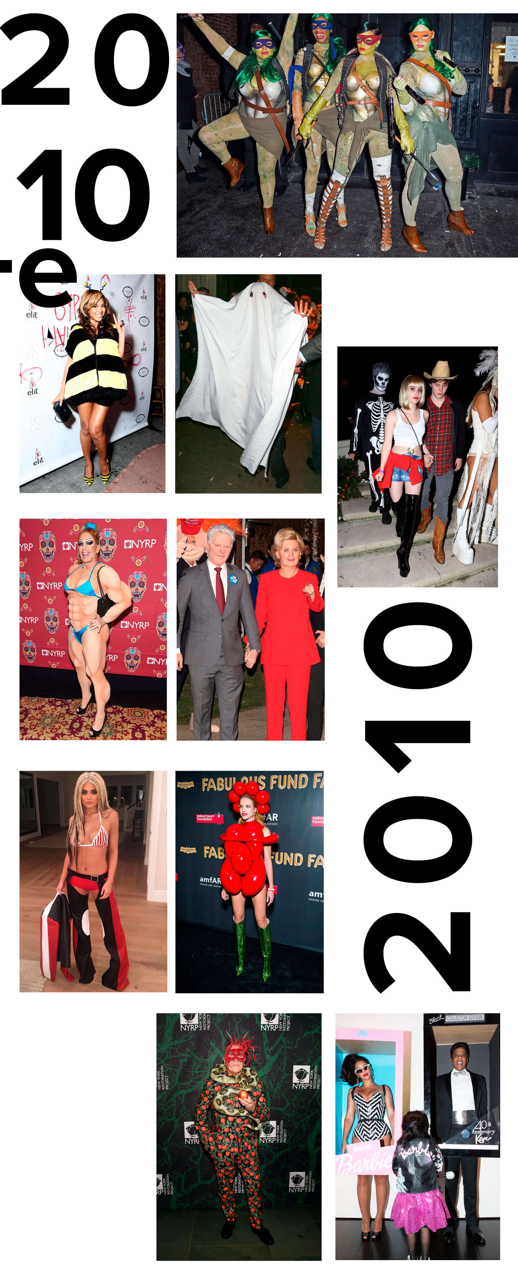 Леди Гага в канун Хеллоуина решила отдохнуть от своих сценических образов и просто вырезала две дырки на простыне. Эмма Робертс появилась в образе Вивьен Уорд из фильма "Красотка", в котором сыграла ее тетя Джулия Робертс. Марк Джейкобс переоделся в женщину-бодибилдера, Орландо Блум и Кэти Пэрри — в Билла и Хиллари Клинтон. Дизайнер Майкл Корс отказался от заезженых вампиров и суперменов: он пришел на вечеринку в образе сада наслаждений из Библии. С запретным плодом вместо аксессуара.