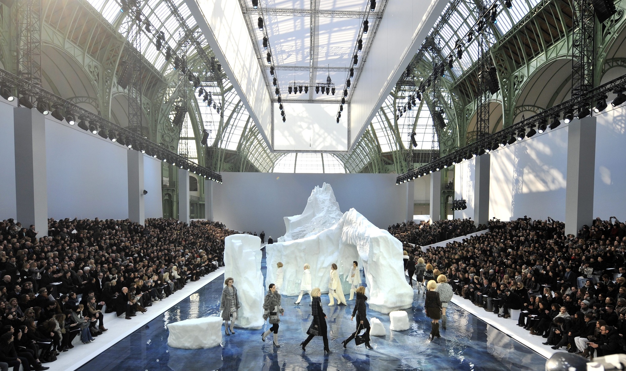 «Глобальне потепління — це проблема нашого часу», — говорив Карл Лагерфельд. «Мода повинна її висвітлити». Так на подіумі в Гран-Пале з’явився айсберг вагою 265 тонн і довжиною 40 метрів, спроєктований і виготовлений зі снігу та льоду у швейцарському Юккас'ярві. Сім днів поспіль над ним працювали сорок митців.