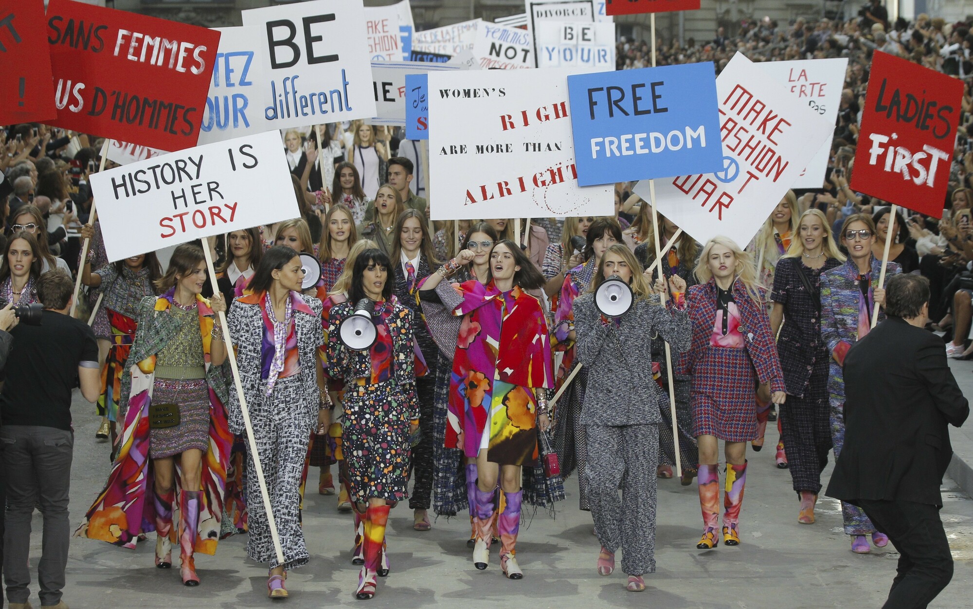 Все, як і мода, існує в глобальному контексті, про що креативний директор Карл Лагерфельд вирішив нагадати, перетворивши фінальний вихід моделей у протест. Манекенниці виходили з гаслами в руках, як-от «Хлопці теж повинні вагітніти» й «Спочатку леді».