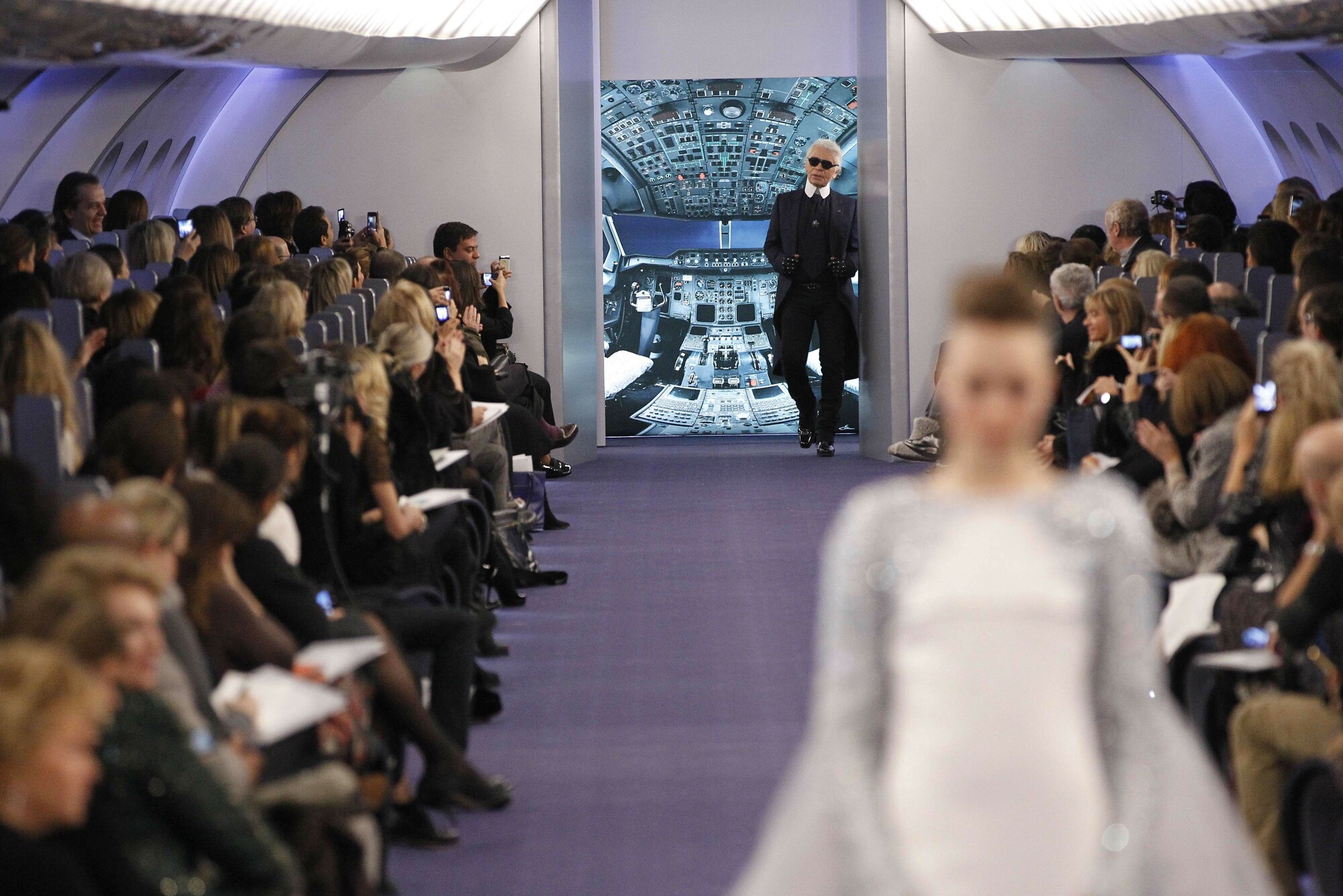 Шановні пасажири, приготуйтеся до злету модної фантазії. Показ Chanel Haute Couture весна-літо 2012 проходив в об'єкті в Гран-Пале, що відтворював вміст літака із відповідними сидіннями й небом, яке можна було побачити через невеликі вікна.