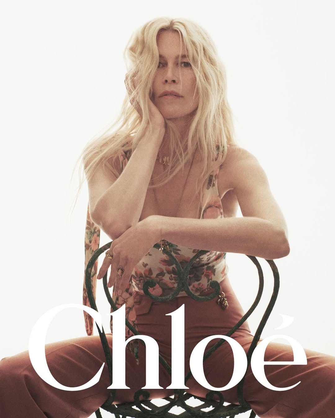 Французький Дім Chloé переживає ренесанс за очільництва дизайнерки Чемени Камалі, яка представляє свою першу літню капсульну колекцію під назвою à la Plage. Найменування останньої — це ода французькому кінорежисеру «нової хвилі» Еріку Ромеру. Образи з колекції демонструє культова німецька супермодель й подруга Будинку Клаудія Шиффер. В об’єктиві фотографа Девіда Сімса вона позує в ніжних ансамблях, що включають джинси із завищеною талією, плетену сумку й верхи та шорти з квітковими мотивами.