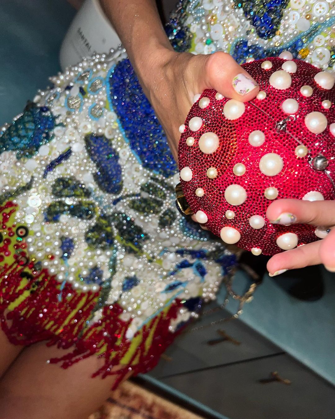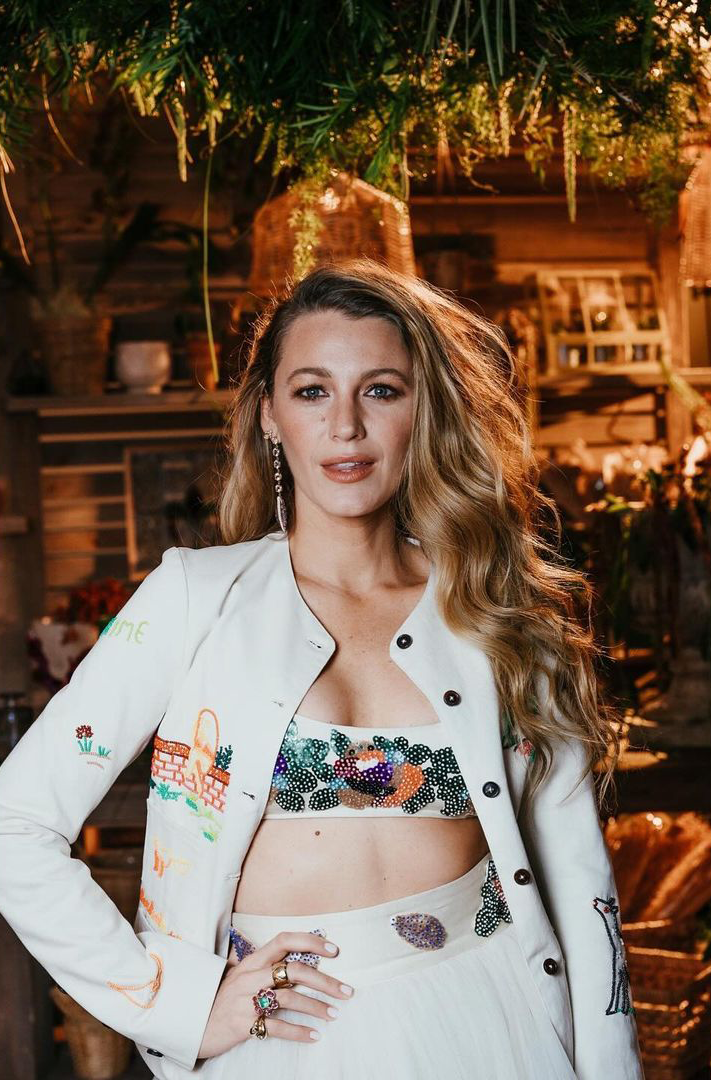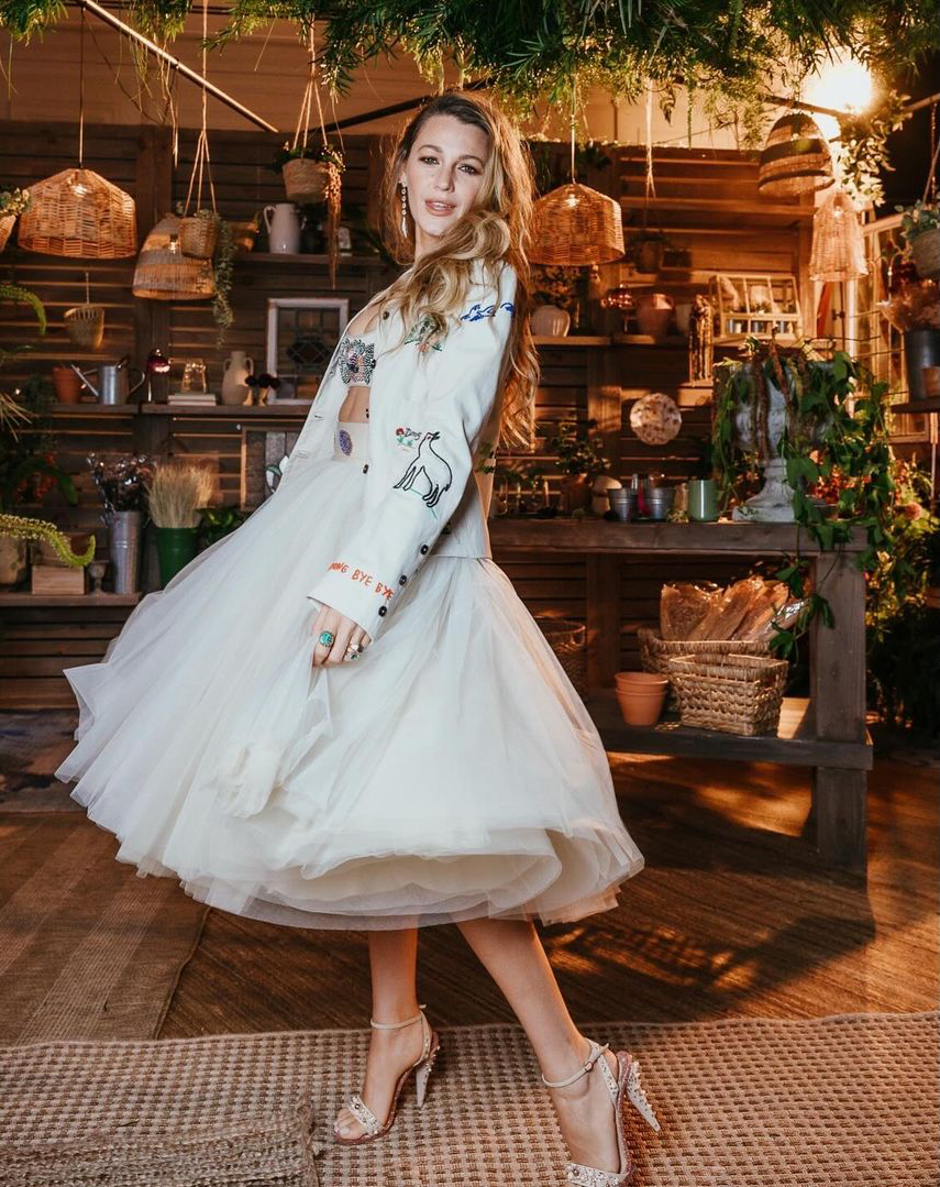 Бренд Bode створив для Лайвлі комплект з розшитого топу, жакету та пишної спідниці, яка вже нерозривно асоціюється з естетикою стилю Керрі Бредшоу. Романтичної інфантильності образу додавала вишивка, що нагадувала дитячі малюнки та написи крейдою.