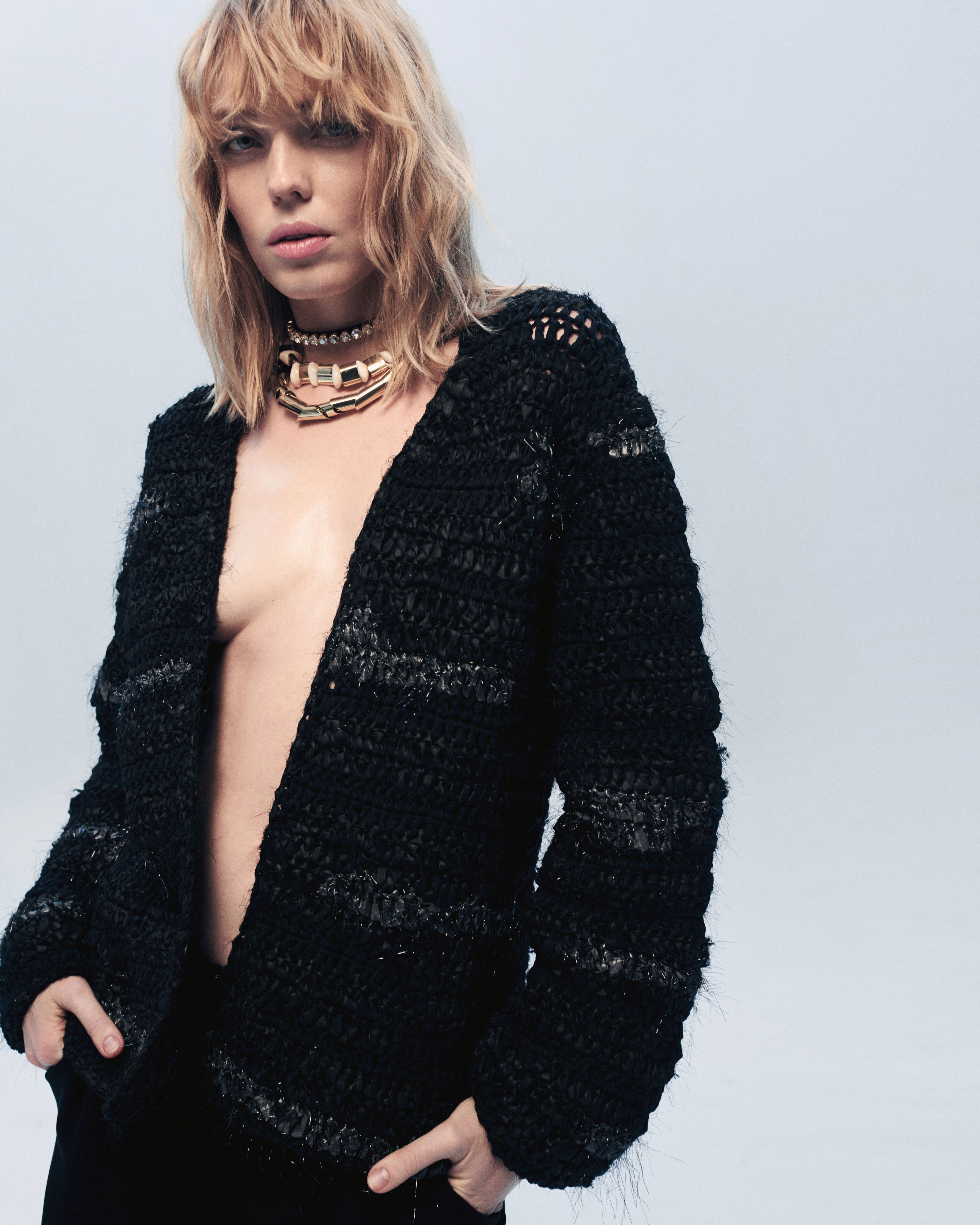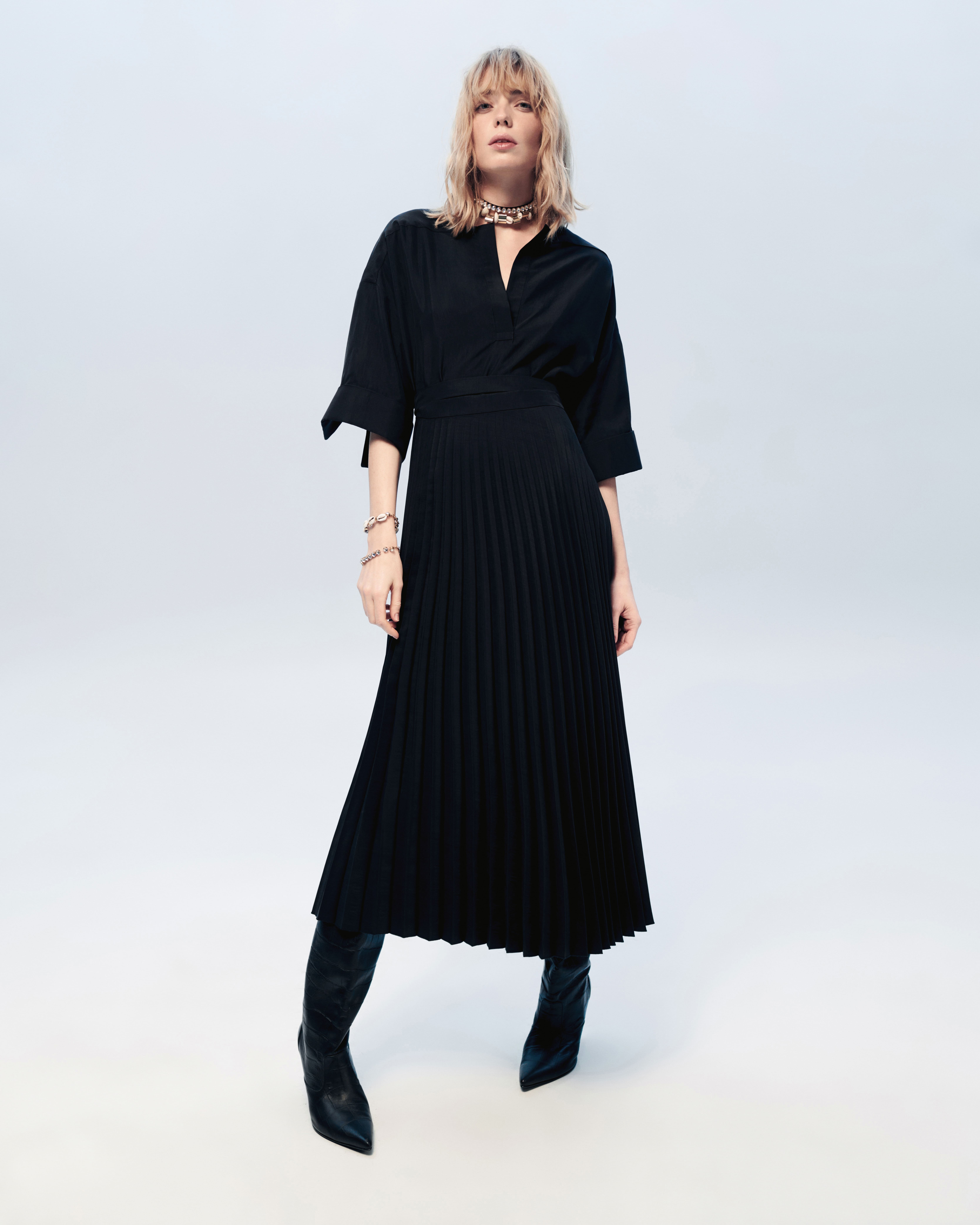 Дополнять черные наряды бренд предлагает золотом и кристаллами, а вещи из коллекции — свободно комбинировать, дополняя брюки мужского кроя платьем-рубашкой, плиссированной юбкой и топом. Также в коллекцию вошли платья-трансформеры, ставшие бестселлером бренда, — при помощи шнура они легко меняют форму выреза.