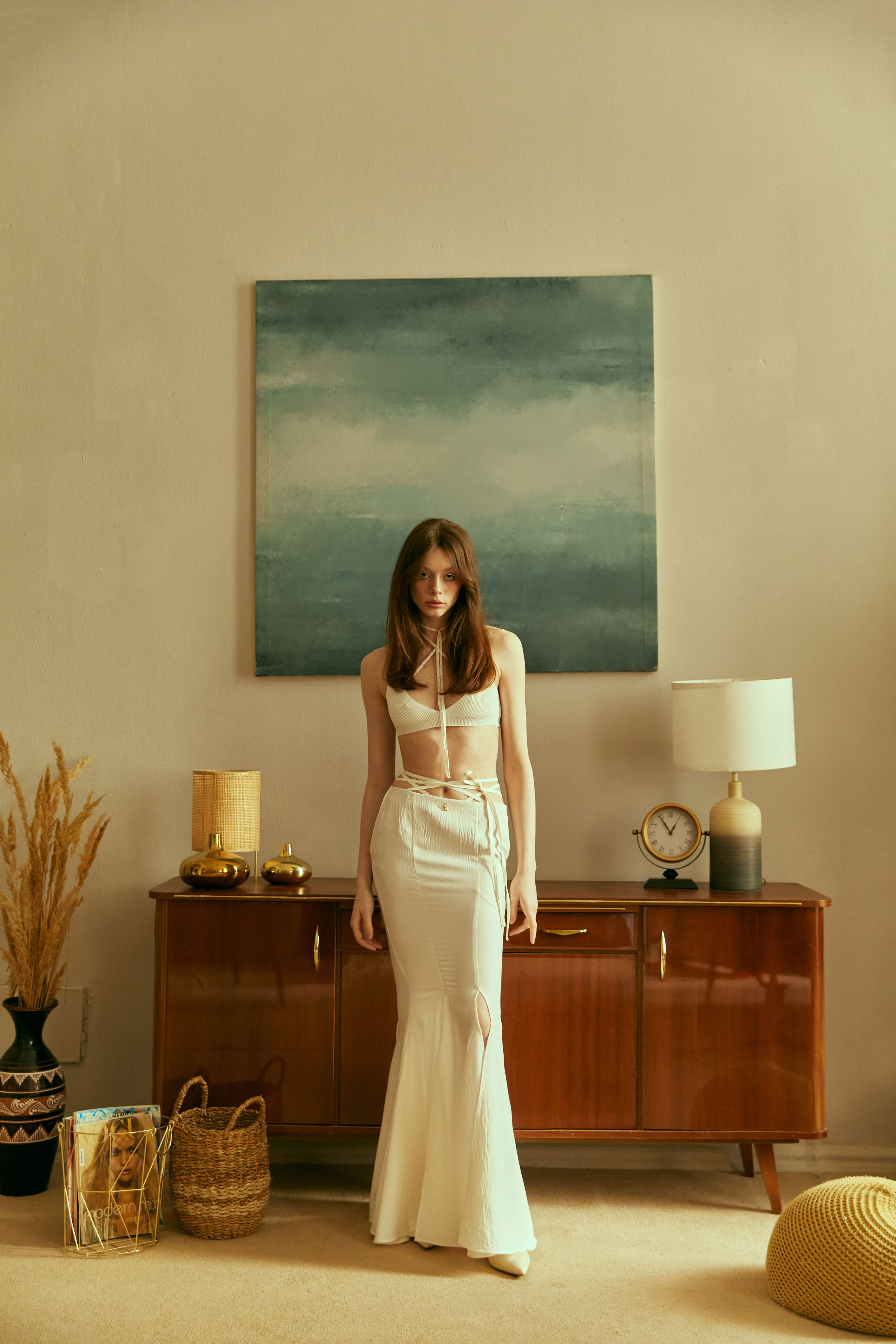 Традиційно дизайнерка продовжує обігрувати текстури, які надають прозорості і відсилають до 70-х рр. — прозорі брюки, довга спідниця-годе з розрізами, в’язаний кроп-топ створені для жінки, яка приймає своє тіло і має сміливість виражати себе.