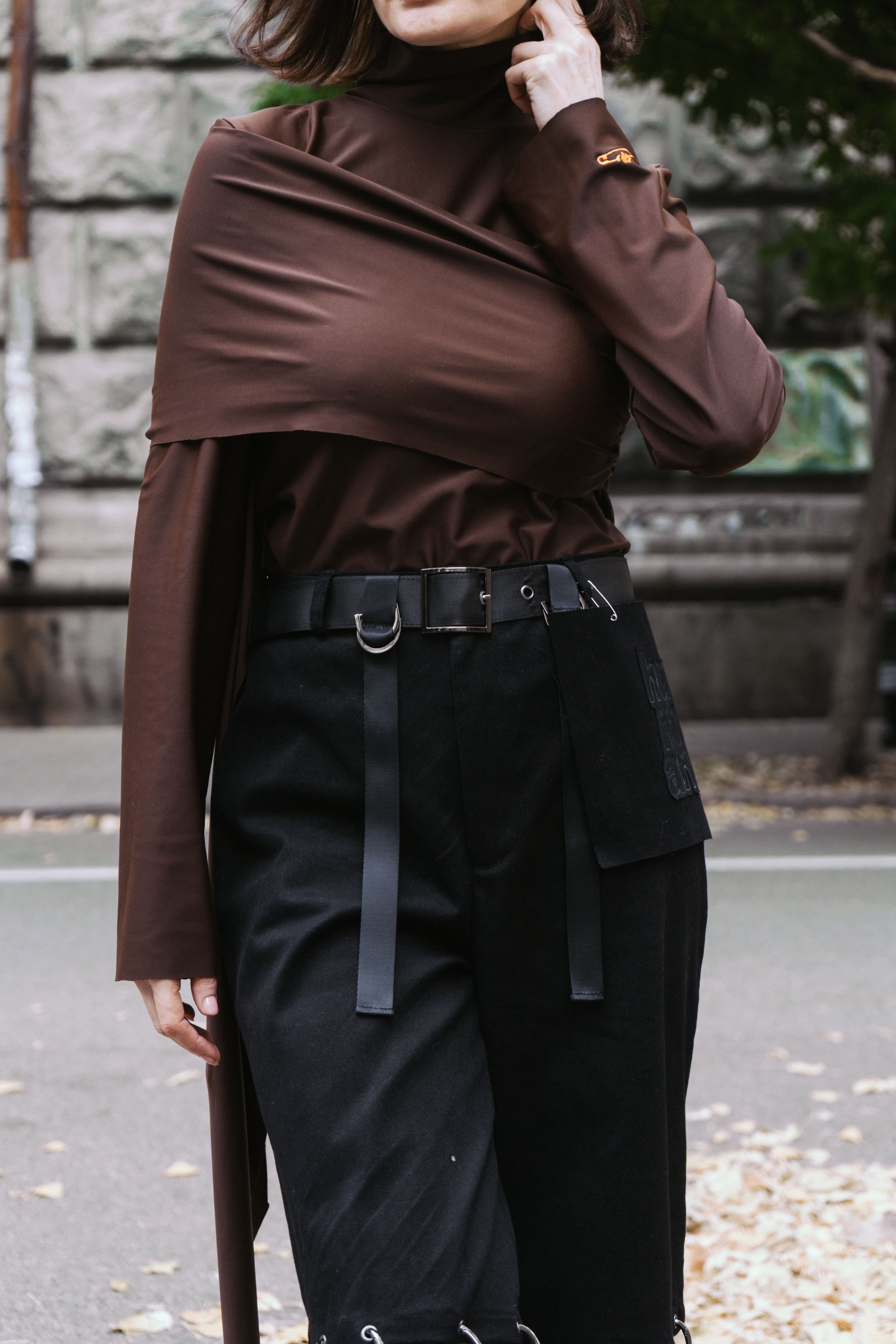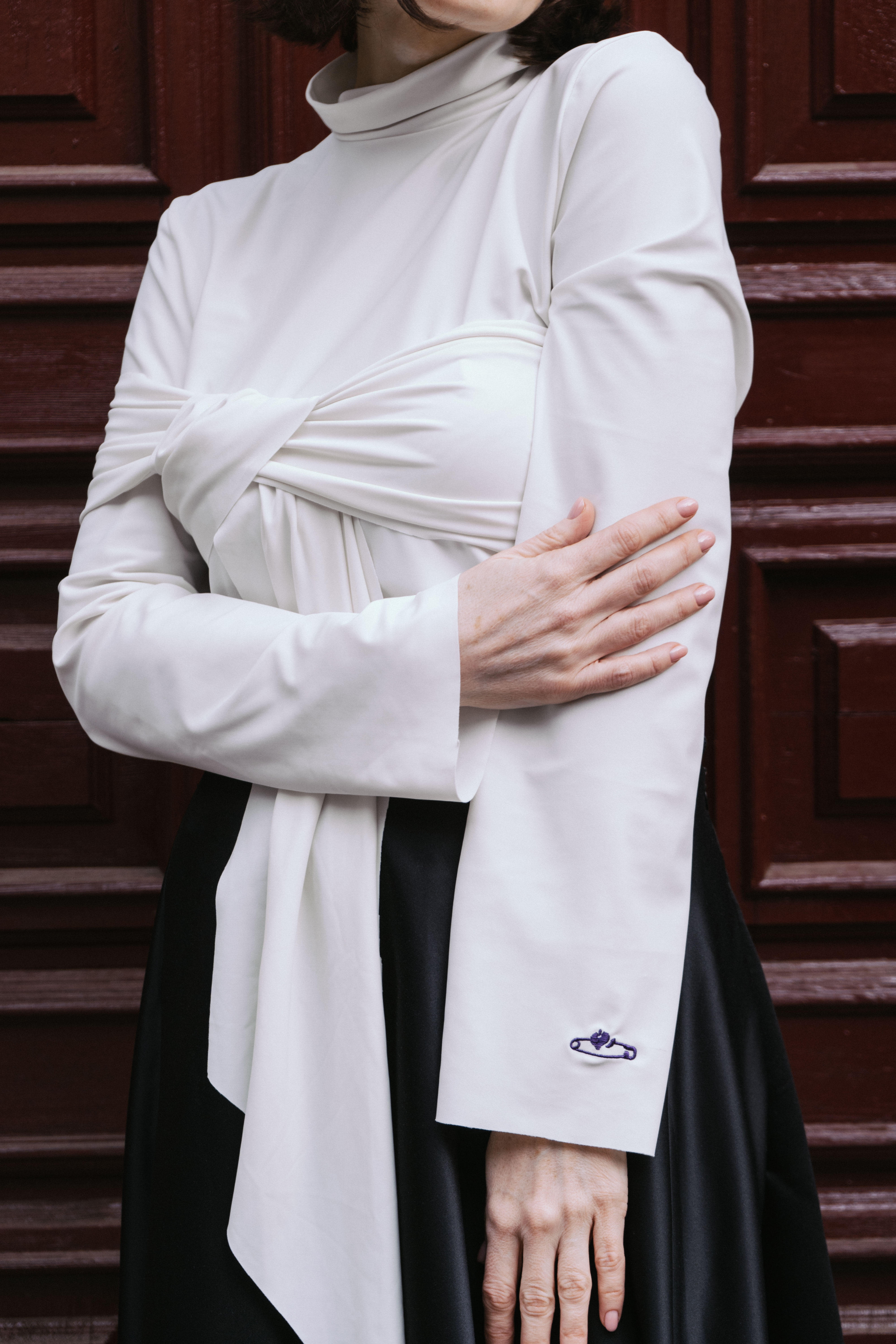 Гольф зроблений з приємної тканини, яка дуже ніжно торкається тіла та дошитий елемент на гольфі ніби обіймає за плечі свого власника. Він доповнюється візуальним елементом — довгим шматком тканини, який можна загорнути по різному та зробити абсолютно унікальний дизайнерський виріб.