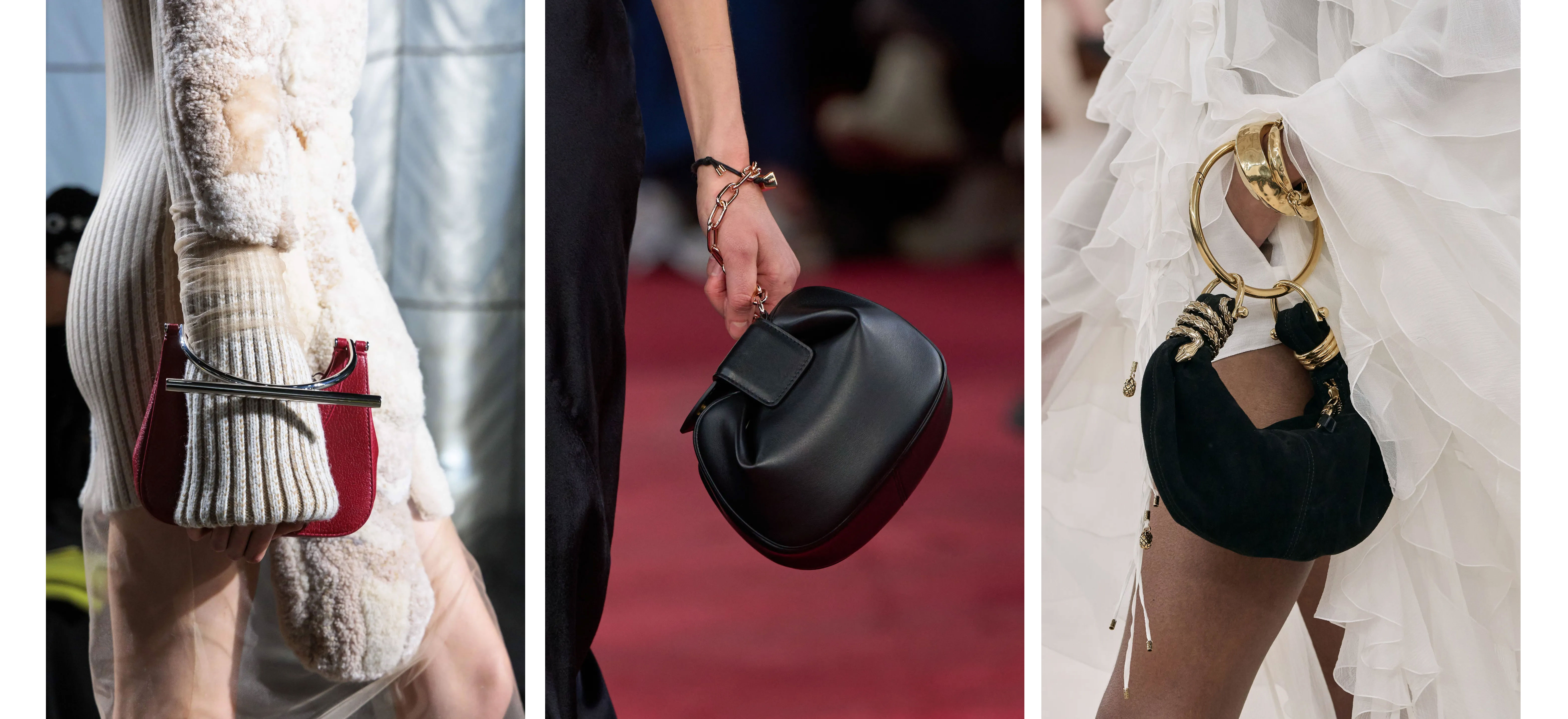 Garbriela Hearst пропонують носити мішкувату невелику сумку із золотистим ланцюжком, нагадуючи про елегантні «мішечки», які дами носили у вікторіанську еру. У тріумфальній дебютній колекції для Chloé дизайнерка Чемена Камалі звернулася до архівів. Вперше для модного дому сумку-браслет представила колишня креативна директорка Фібі Файло на початку 2000-х. Завдяки баченню Чемени Камалі така модель знову успішно повернулася на подіум із золотими кільцями. Ще один дебютант — Шон МакГір в McQueen — теж не оминув сумку-браслет.