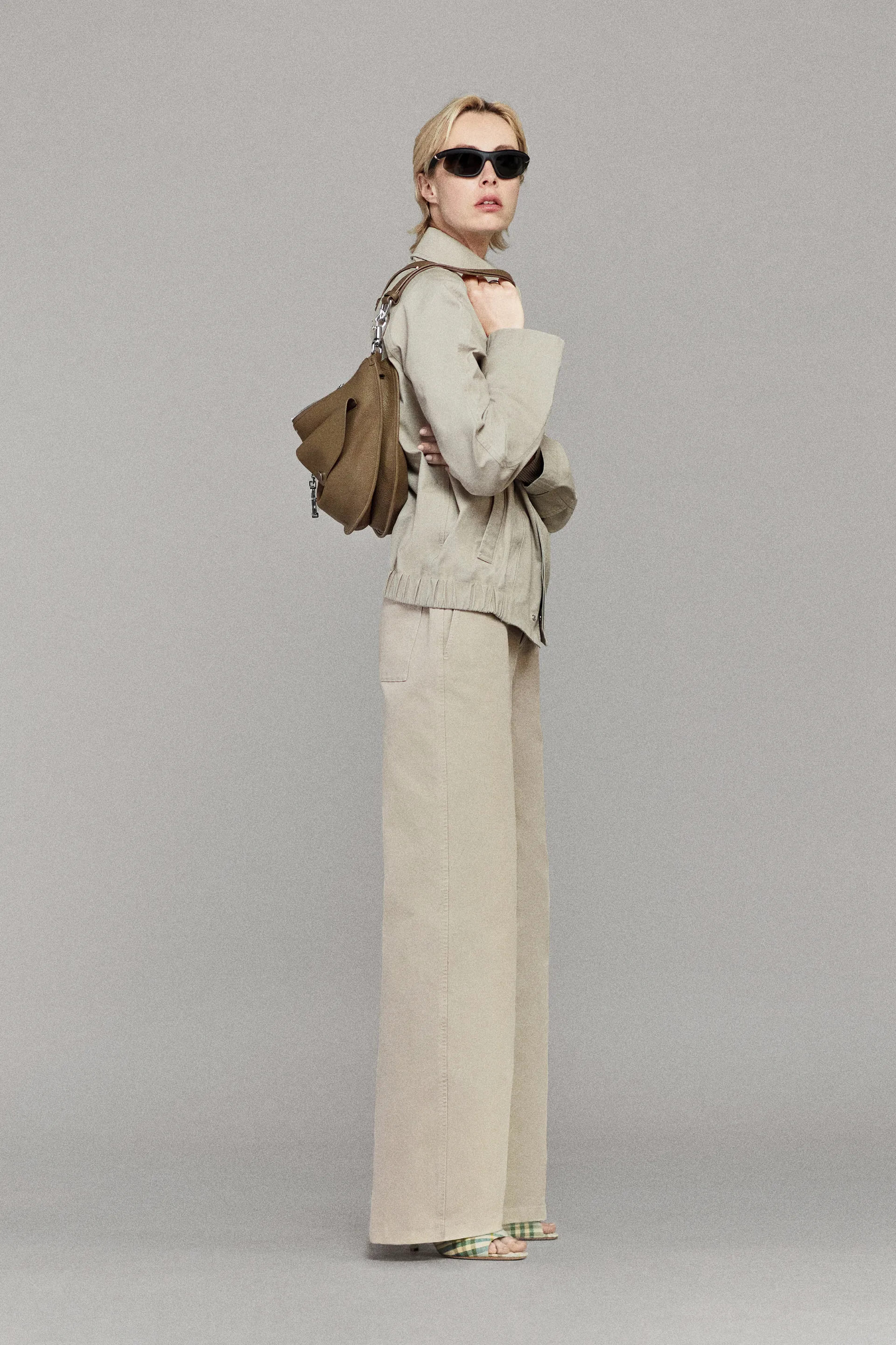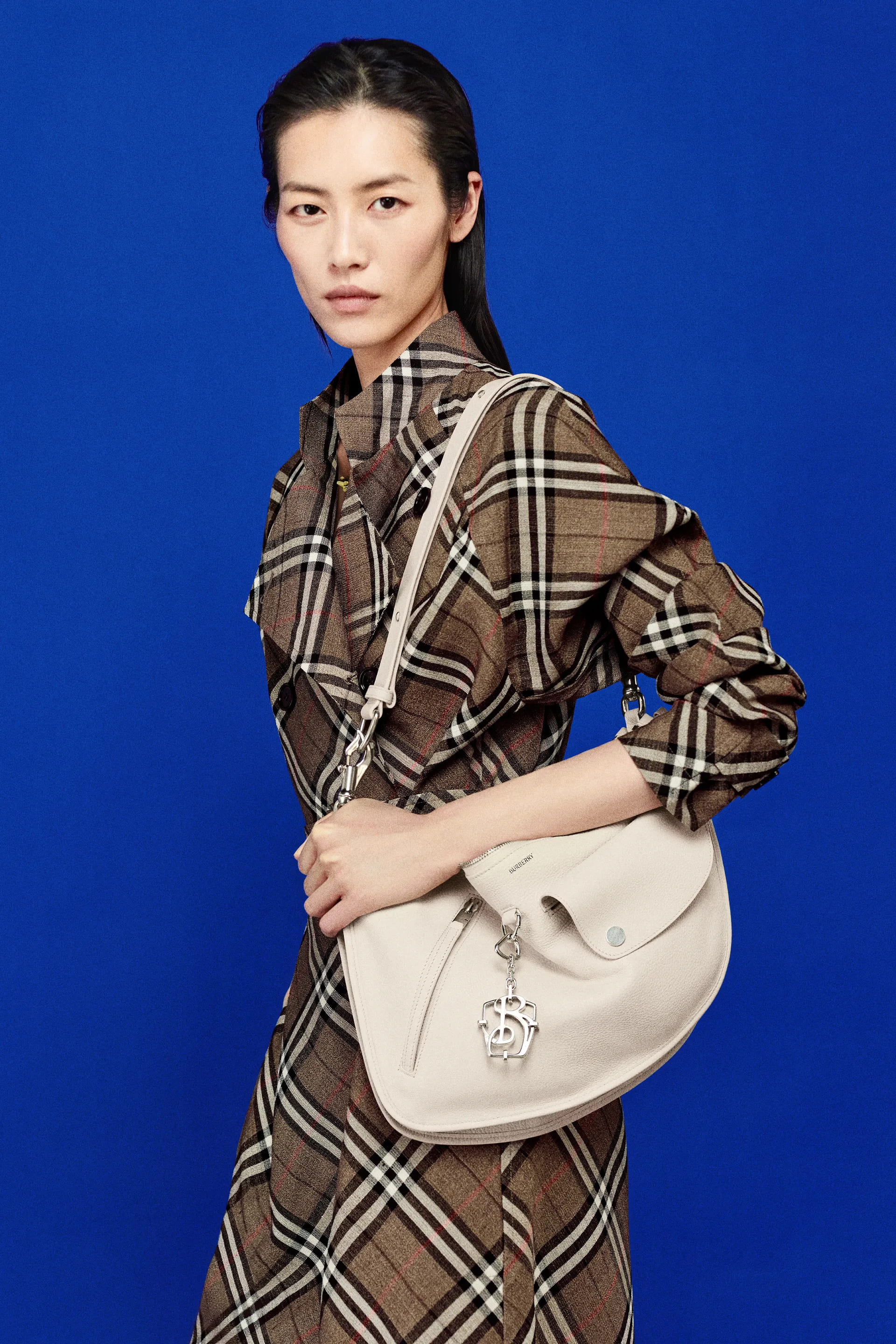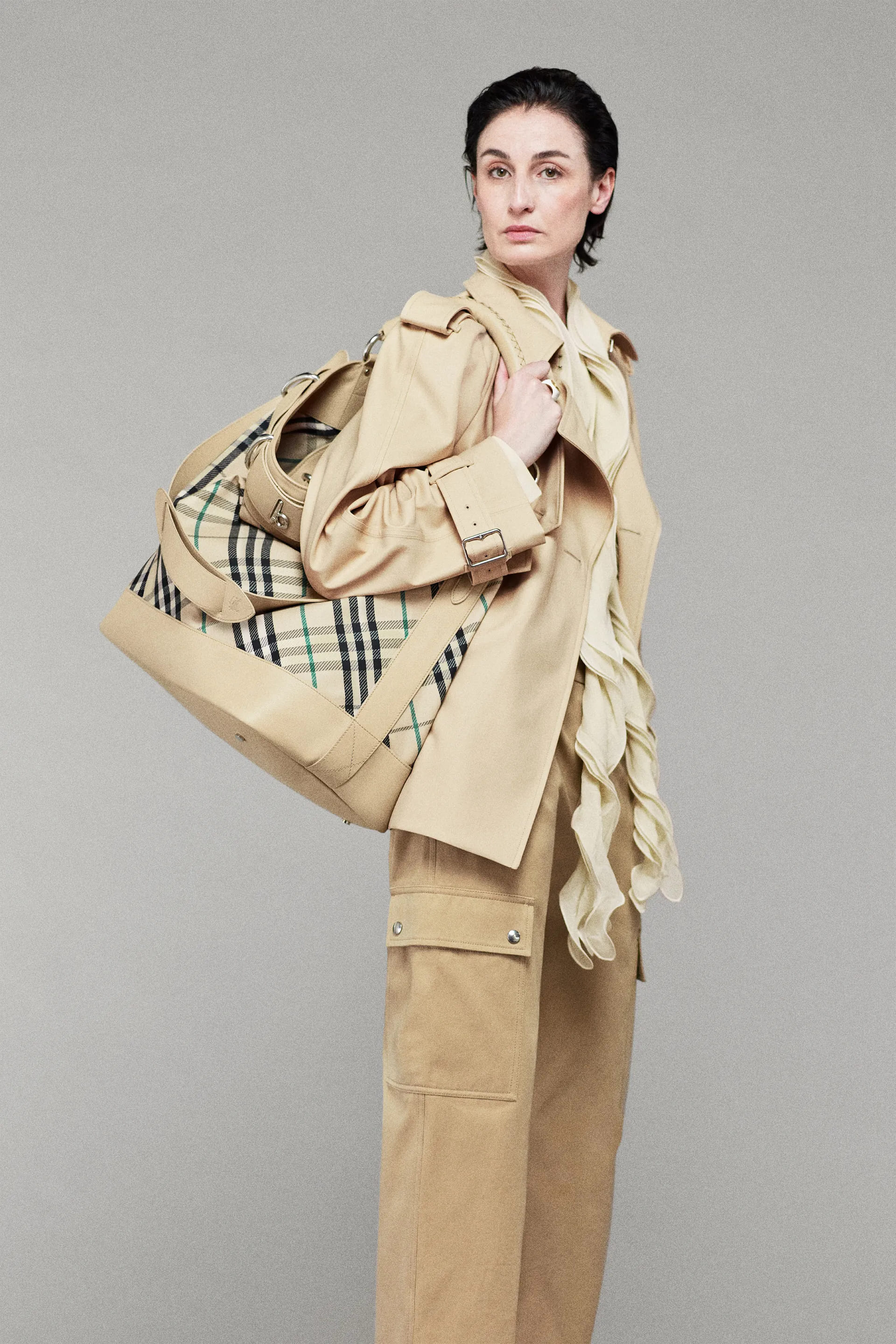Образи з колекції resort — 2025 Burberry балансували стриманими аксесуарами, серед яких м’які та структуровані мінімалістичні сумки, босоніжки з металевими монограмами або знаковими принтами, хустки з каліграфічним логотипом.