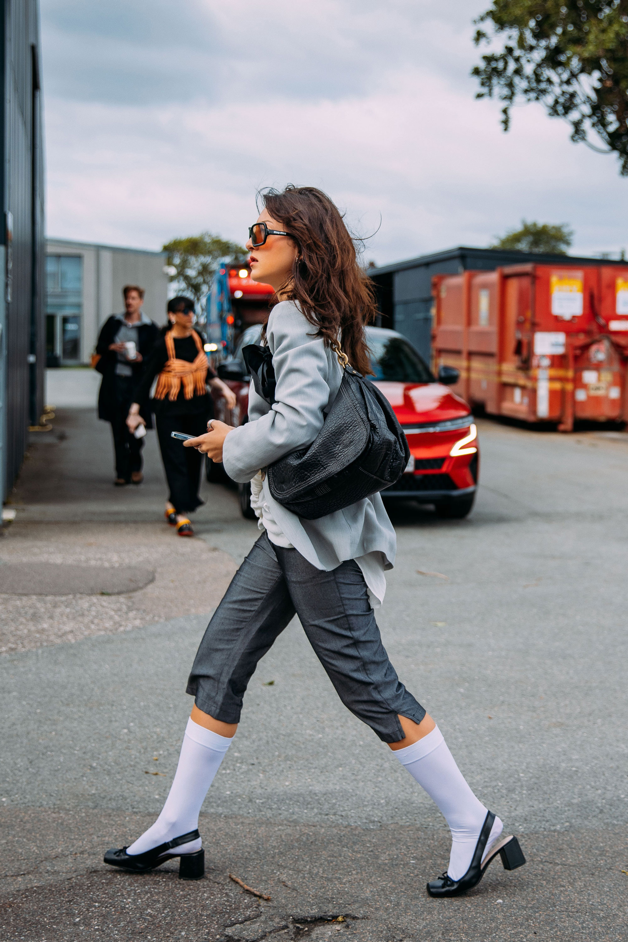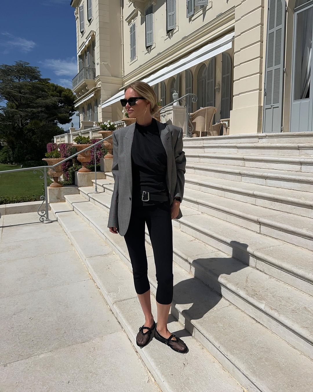Зі свого боку фешн-інфлюенсерка й модель Клер Роуз надала перевагу більш стриманому бізнес-образу, вдягнувши чорні облягаючі капрі з сірим блейзером Saint Laurent, поєднаними з трендовими прозорими балетками Alaïa. Взуття даної моделі надало невимушеності та легкого натяку на balletcore.