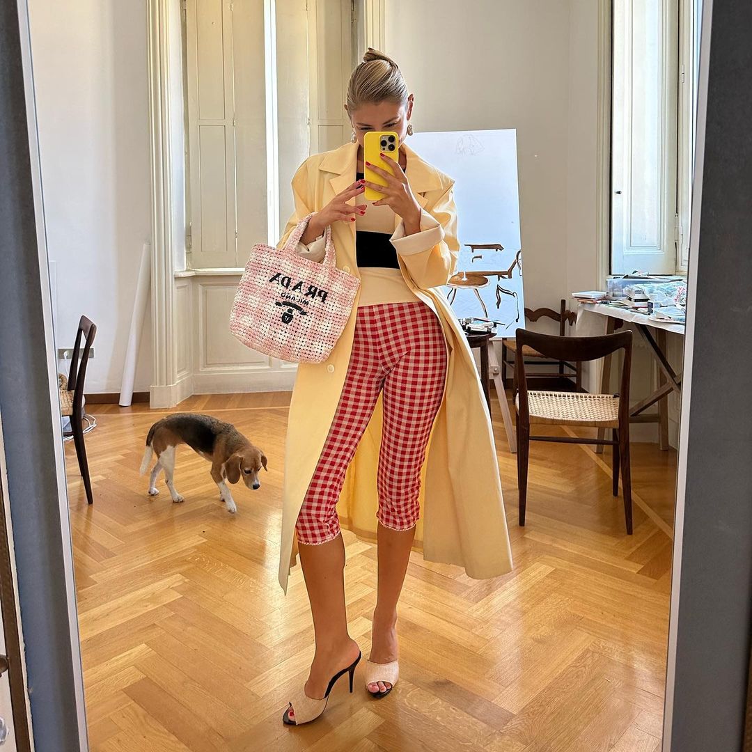 Створити образ з відлунням промайнулого літо вдалося Дженні Валтон, фешн блогерці та ілюстраторці. Капрі у червоно-білу клітинку вдало поєдналися з жовтим тренчем, створивши силует в стилі 60-х років минулого століття. Довершивши вбрання підборами з відкритим носком, Дженні сміливо може йти як на ланч з подругами, так і відвідати галерею сучасного мистецтва.