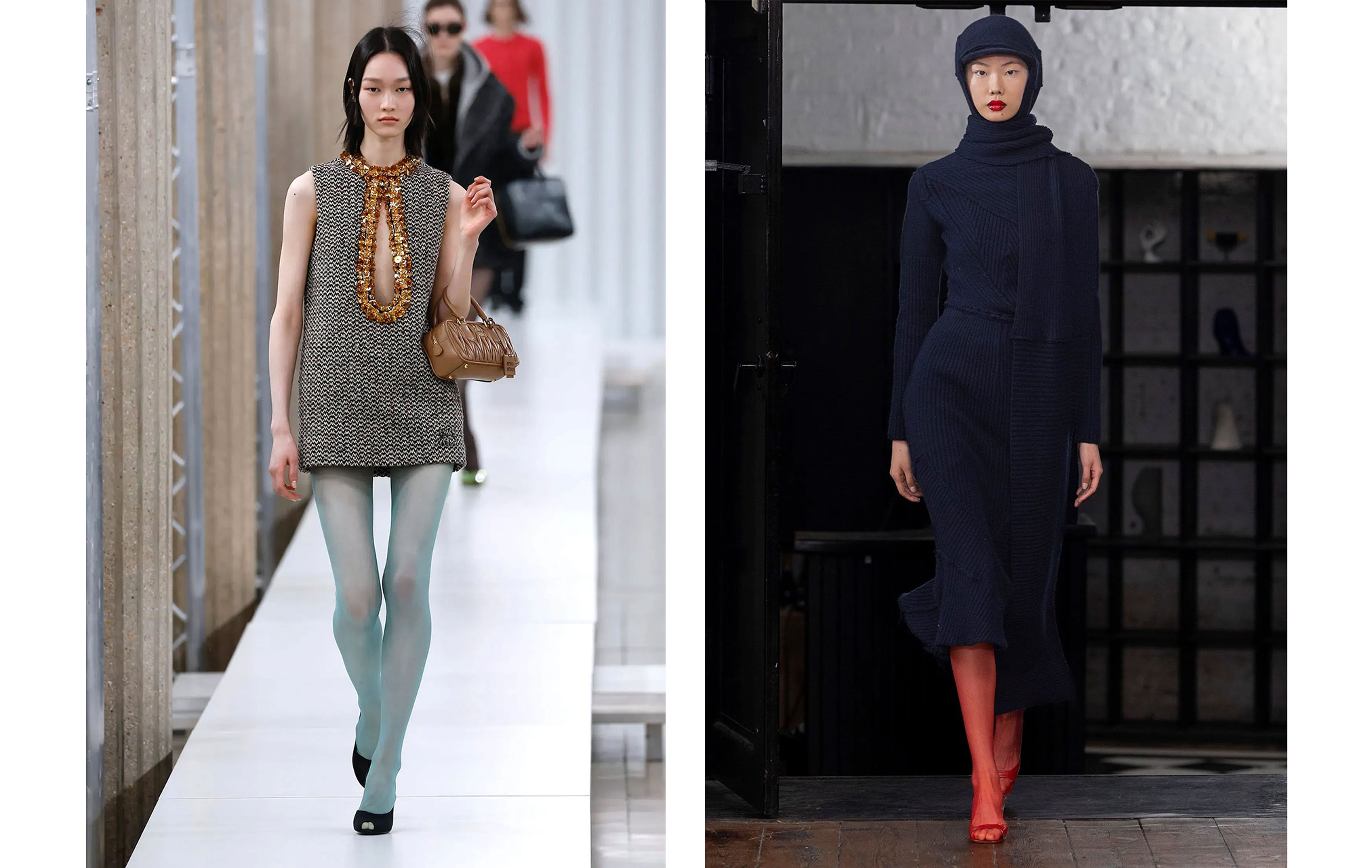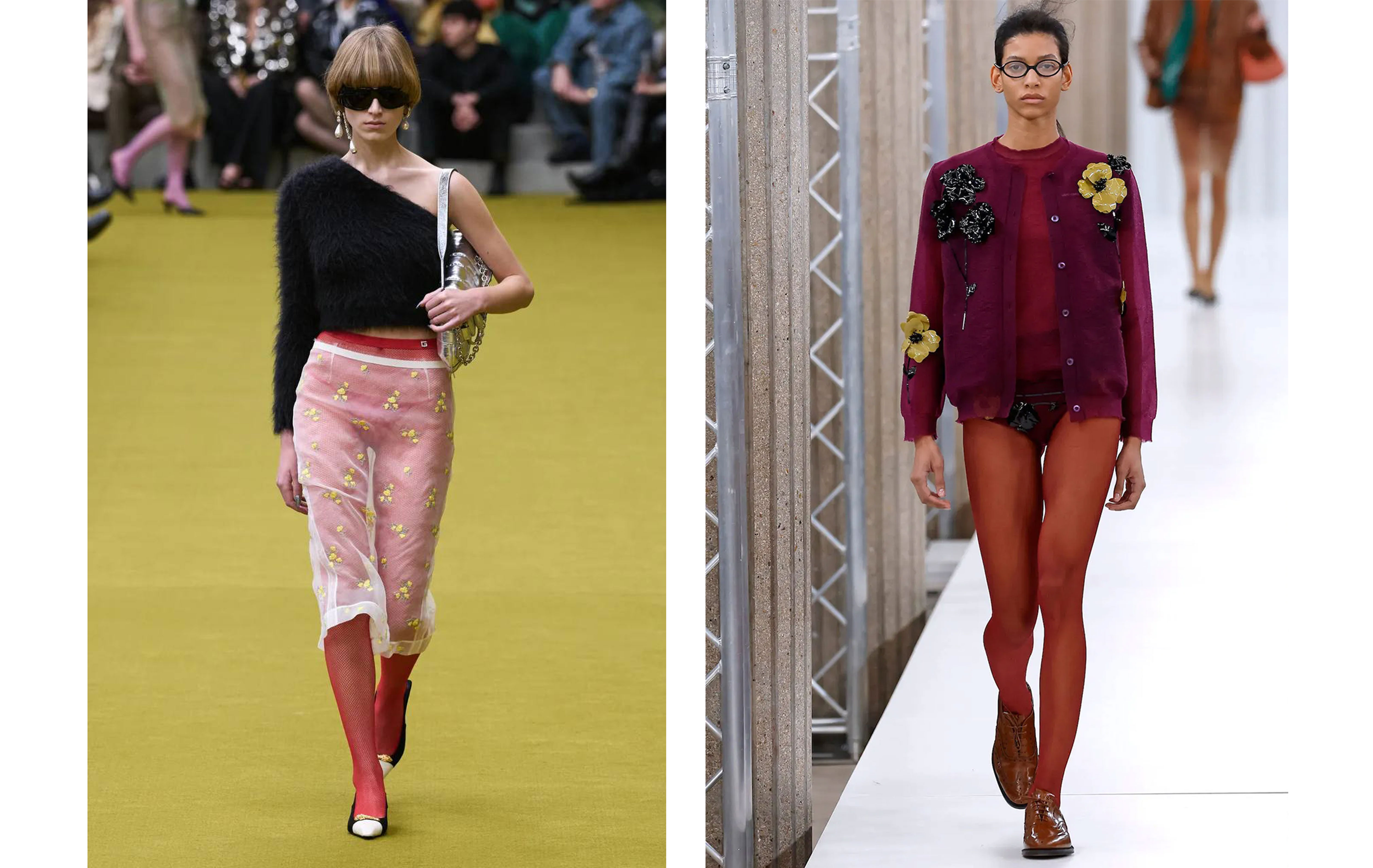 Якщо ви залишаєтеся вірним прихильником мінімалізму, обирайте напівпрозорий аксесуар. Miu Miu доводять, що нещільні блакитні колготки чудово доповнюються класичною твідовою сукнею, а бренд Talia Byre підкреслюють стриману сексуальність чорних суконь максі за допомогою напівпрозорої червоної опції.
