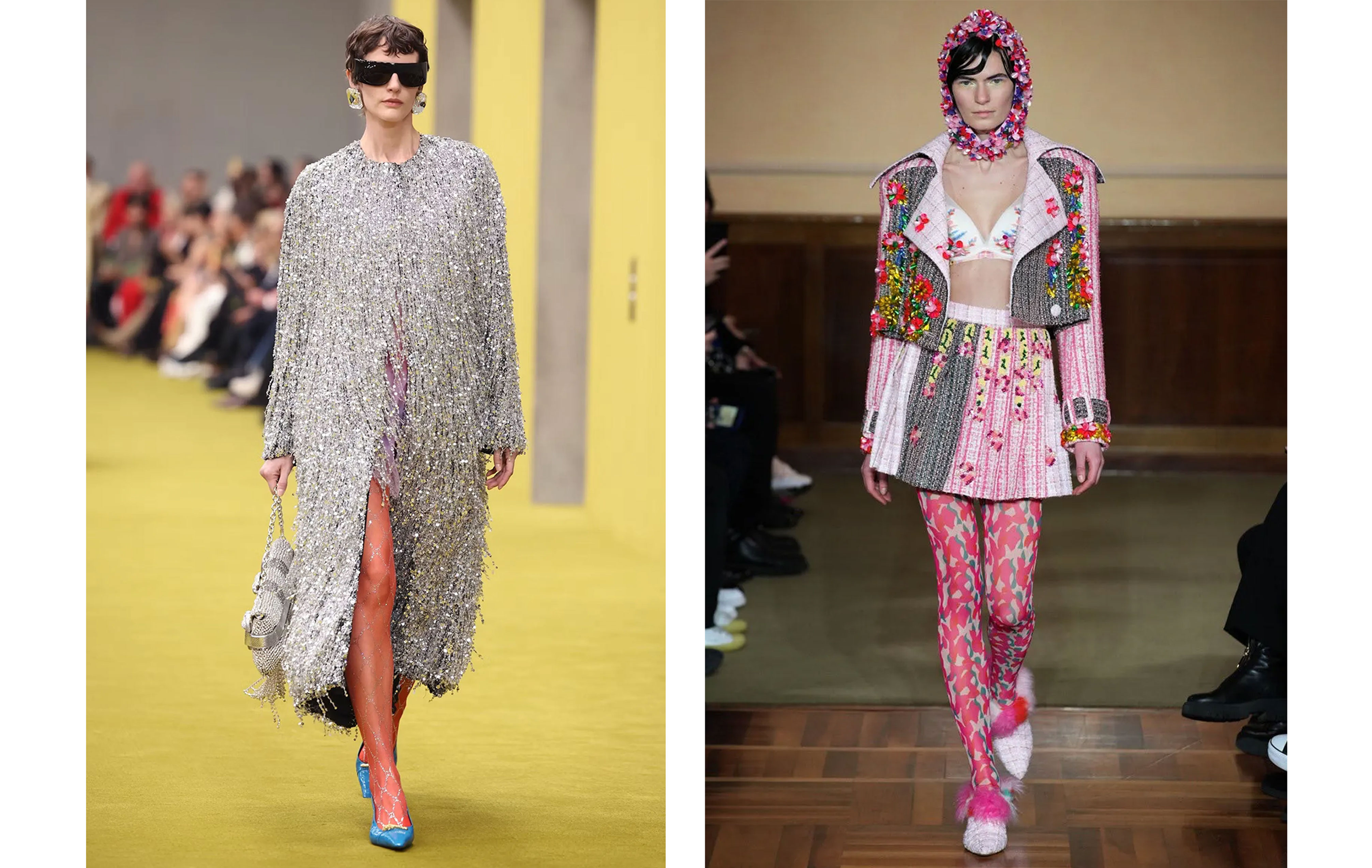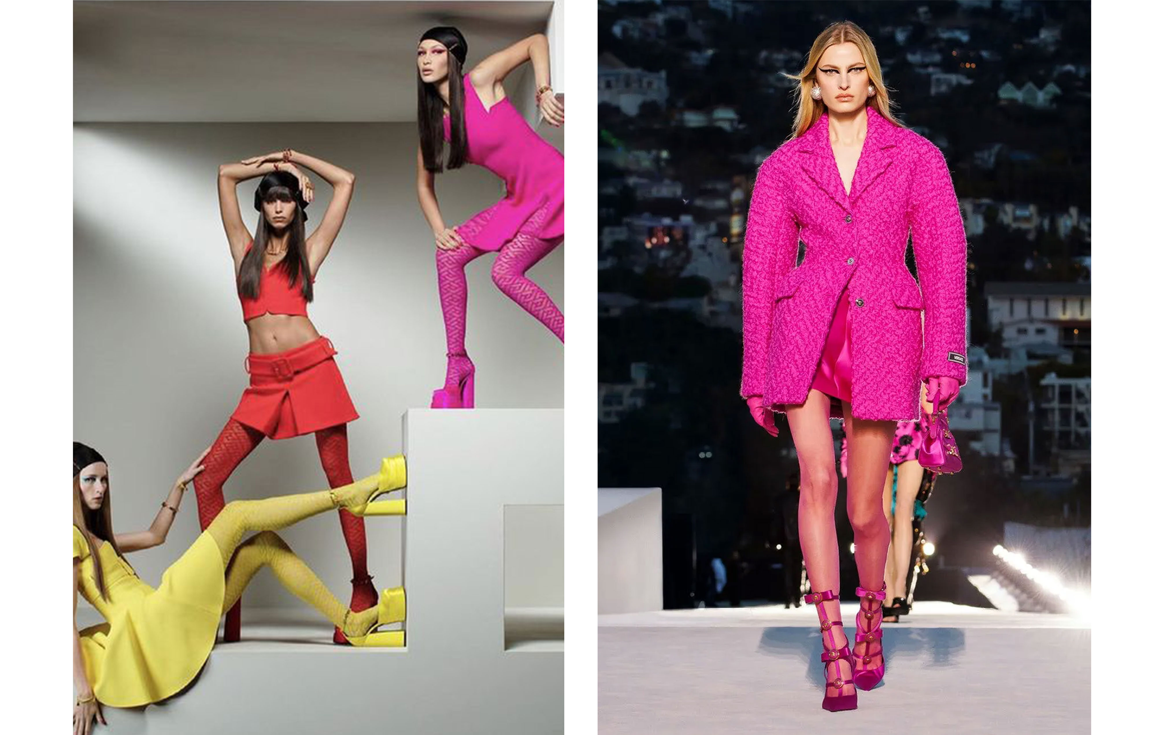 Versace були тими, хто запевнював нас у трендовості таких образів задовго до нової хвилі популярності. Починаючи з пандемійних часів, бренд неодноразово представляв монохромні образи з яскравими колготами – від рекламної кампанії з Беллою Гадід у 2021 році до нещодавніх подіумних образів сезону fall-winter – 2023. Для створення таких образів найкраще підходитимуть колготи червоного, рожевого, блакитного, жовтого та зеленого кольорів: поєднуйте з речами в тон або експериментуйте з відтінками та текстурами.