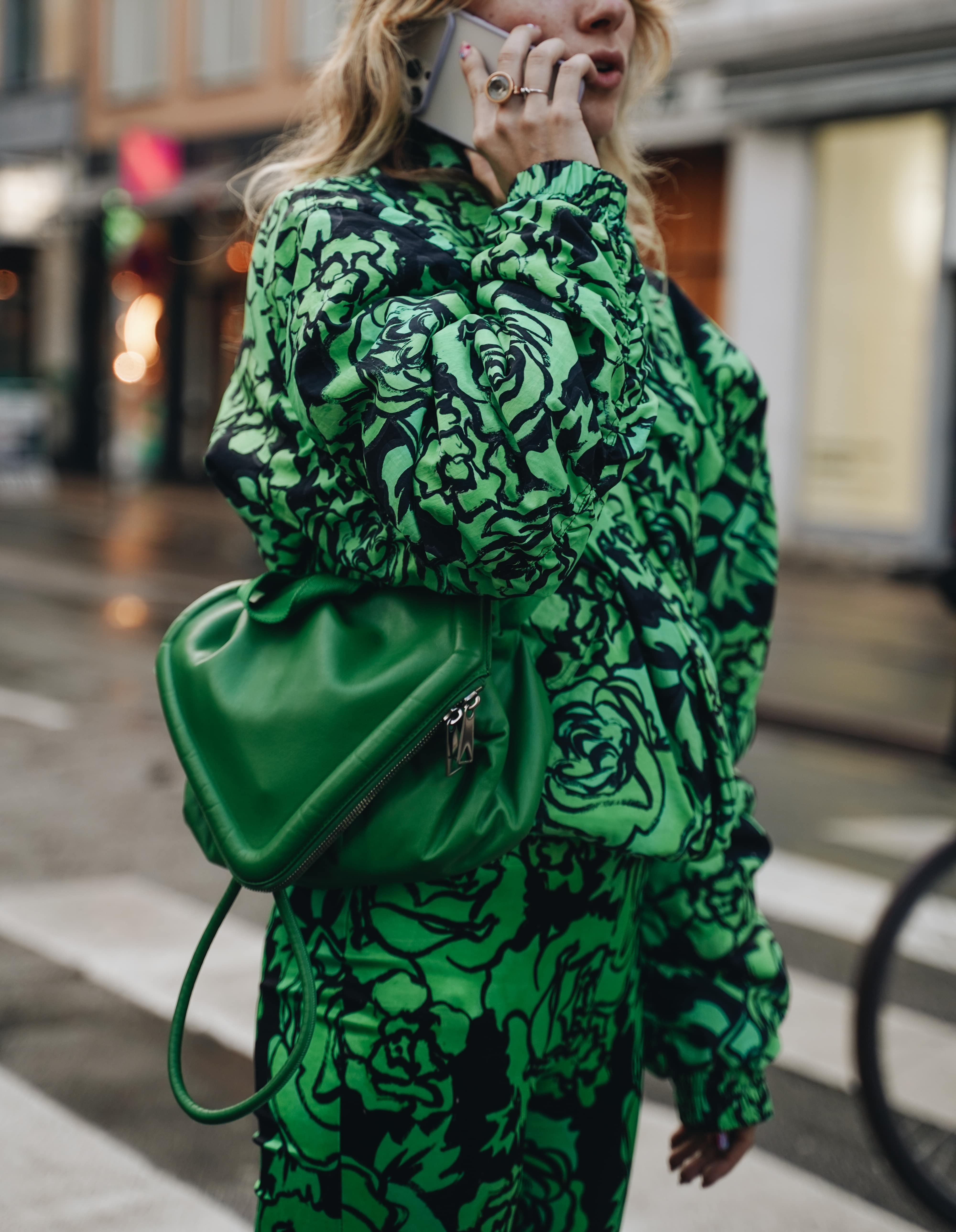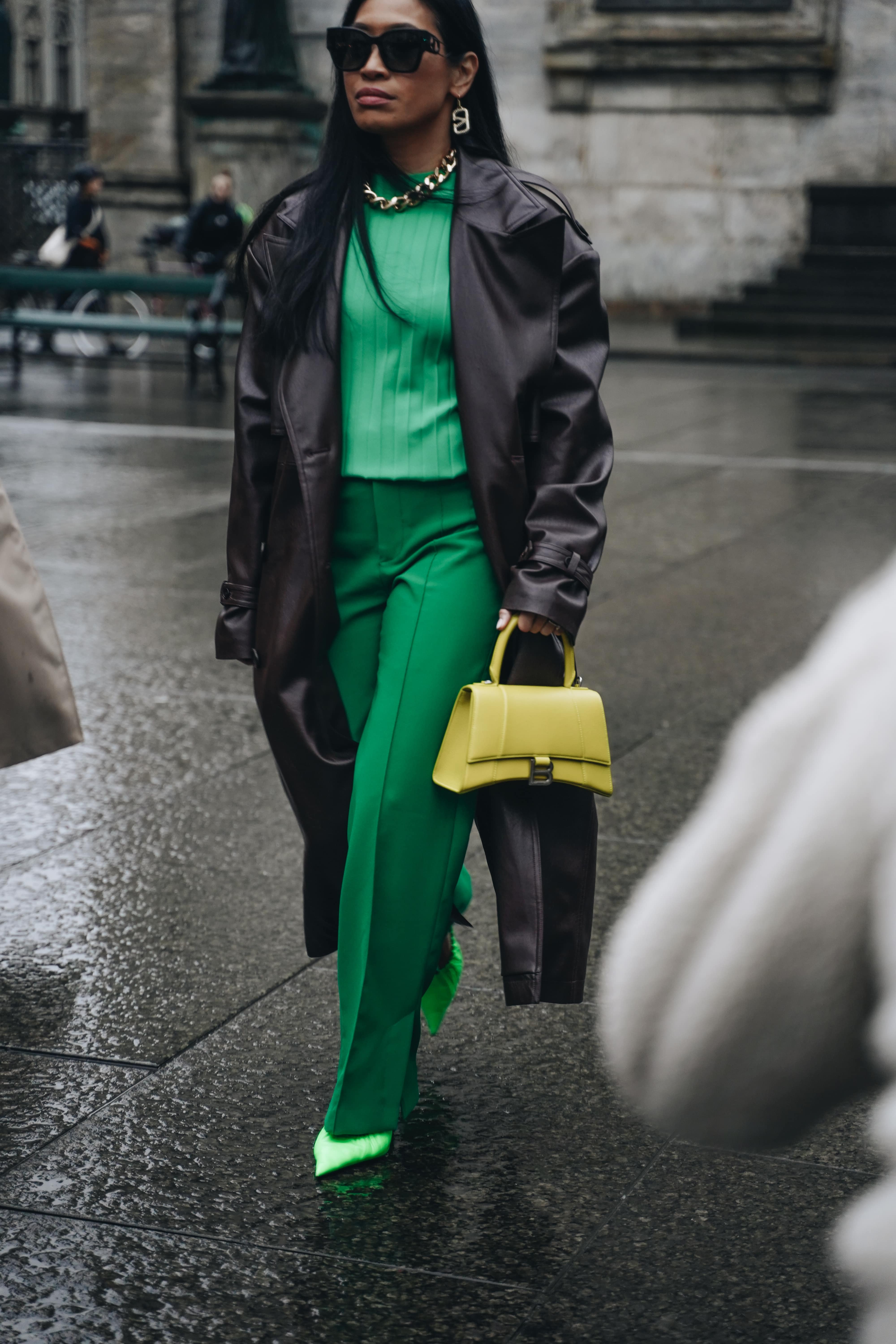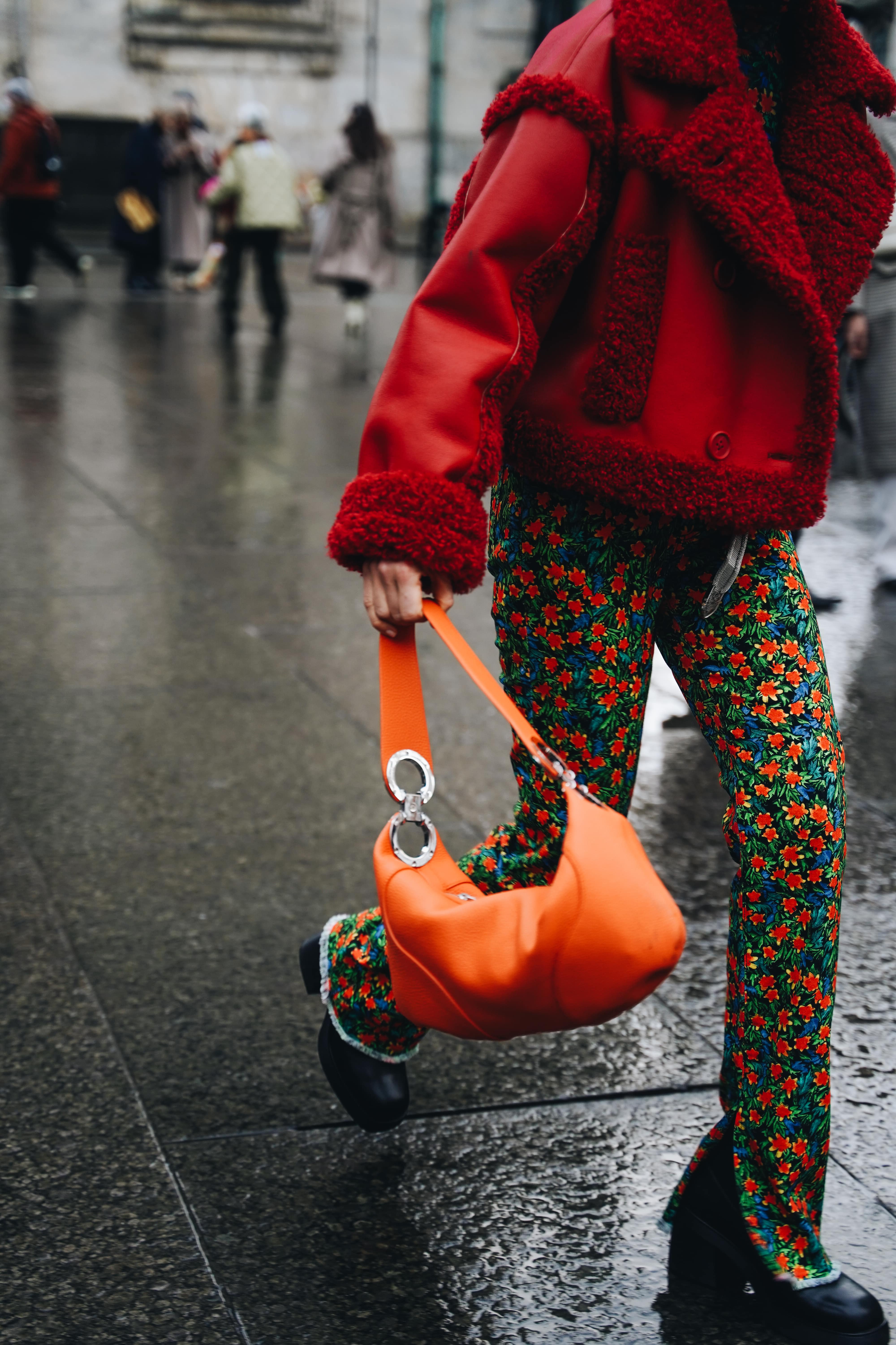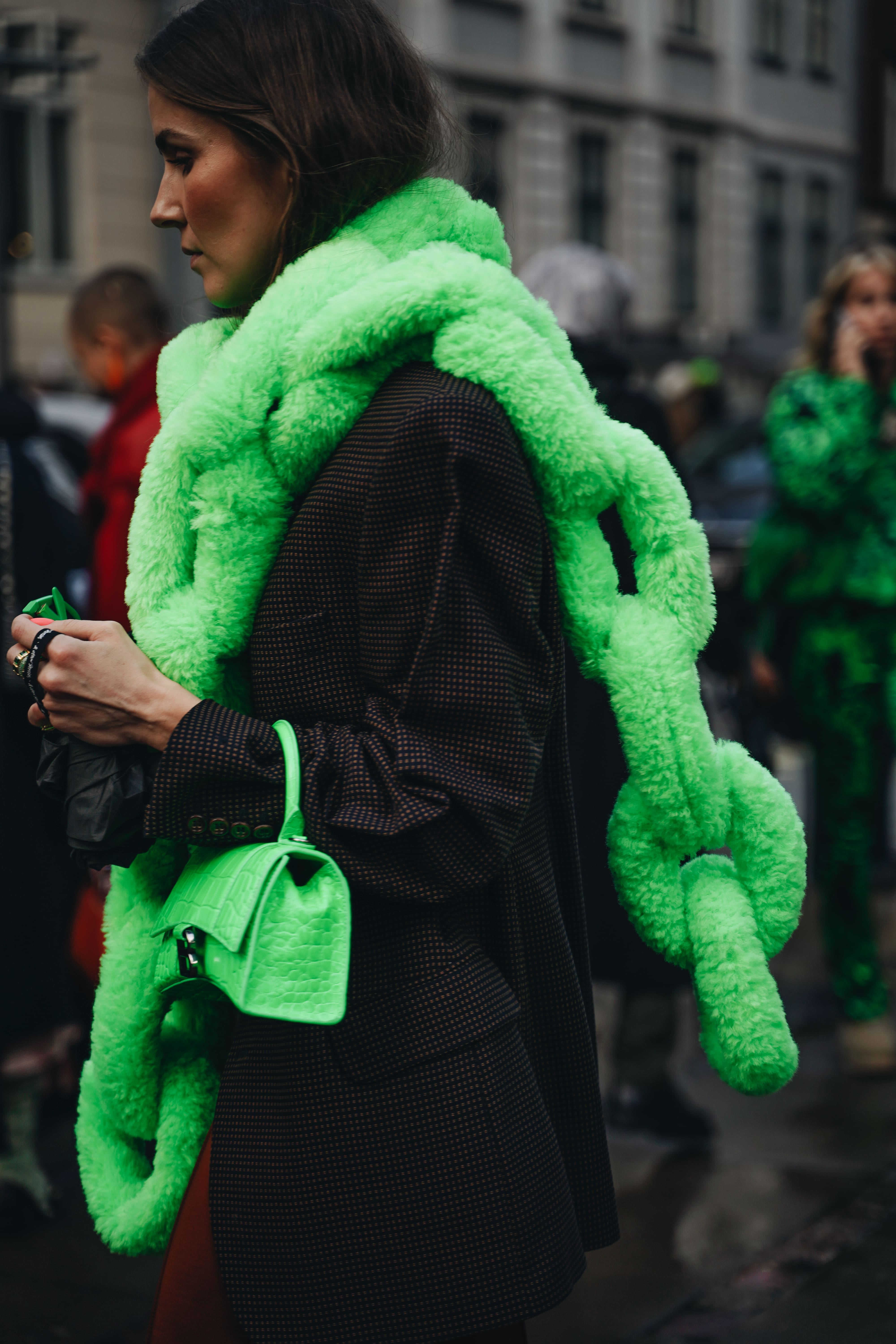 Жизнеутверждающие мотивы проявляются и в образах гостей. Фавориты среди цветов — оптимистичный и страстный оттенок красного, неоновый зелёный, фуксия и пастельные тона. Главенствующими также оказались графичные силуэты, дополненные гиперболизированными аксессуарами, огромными шарфами и клатчами.
