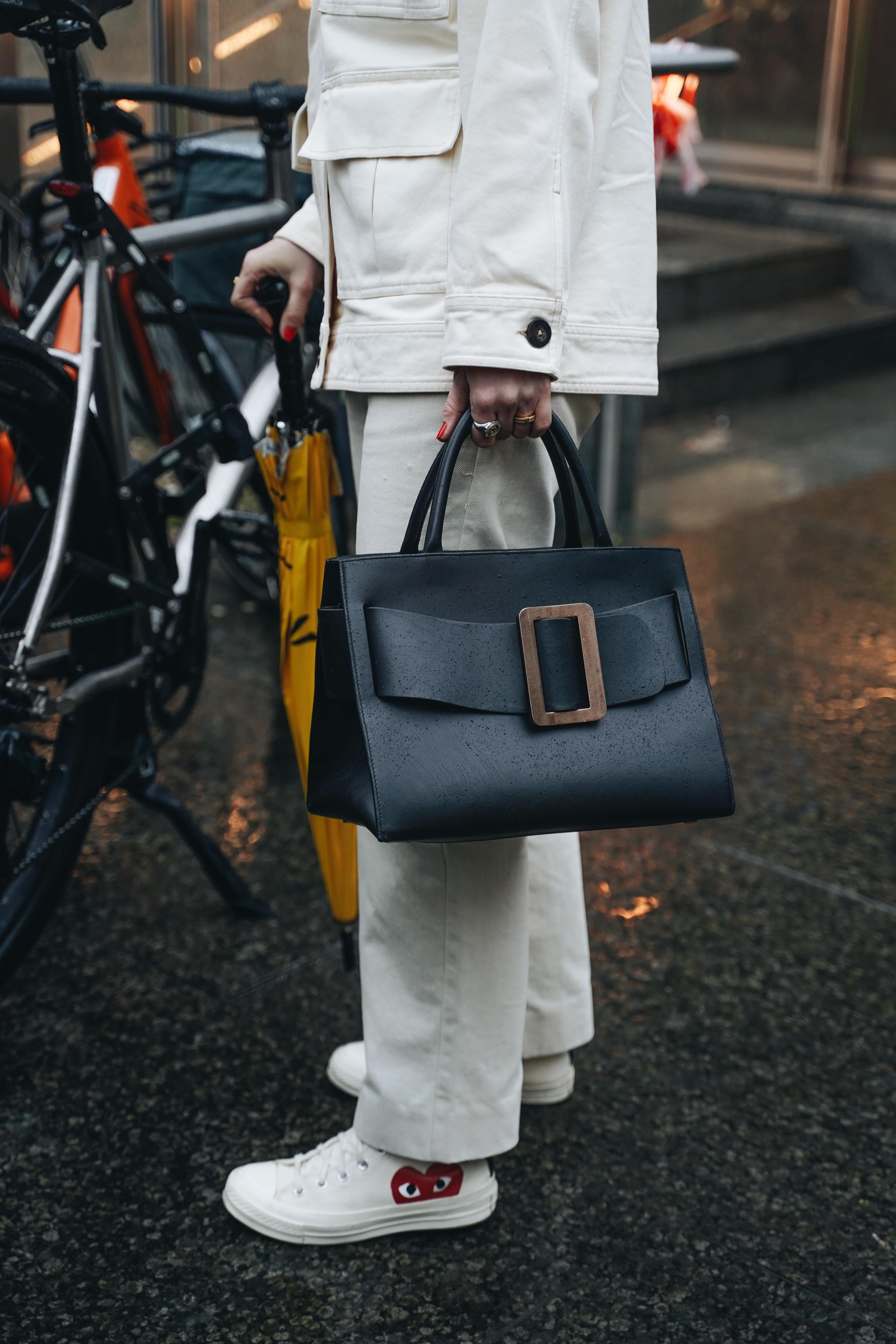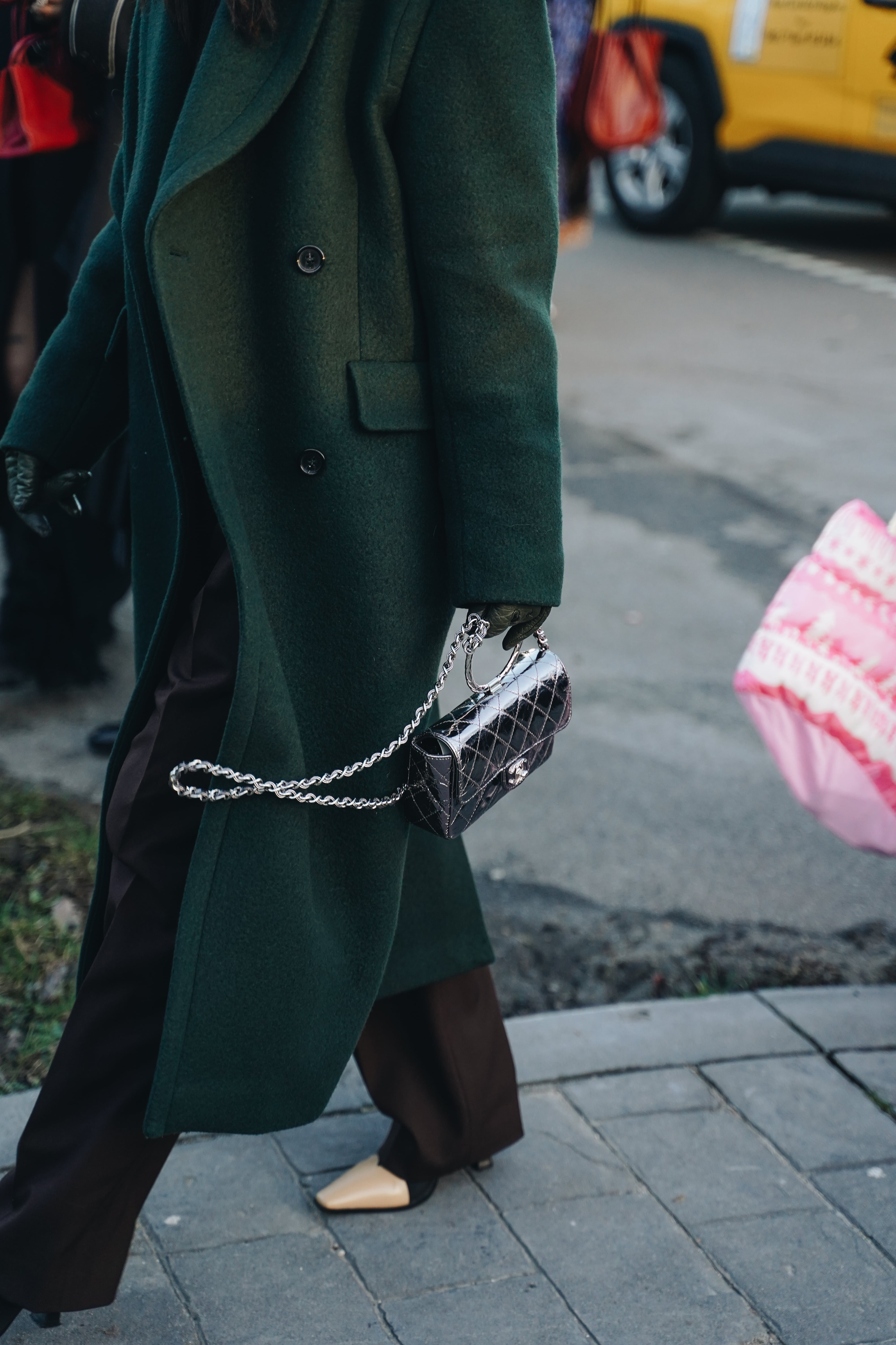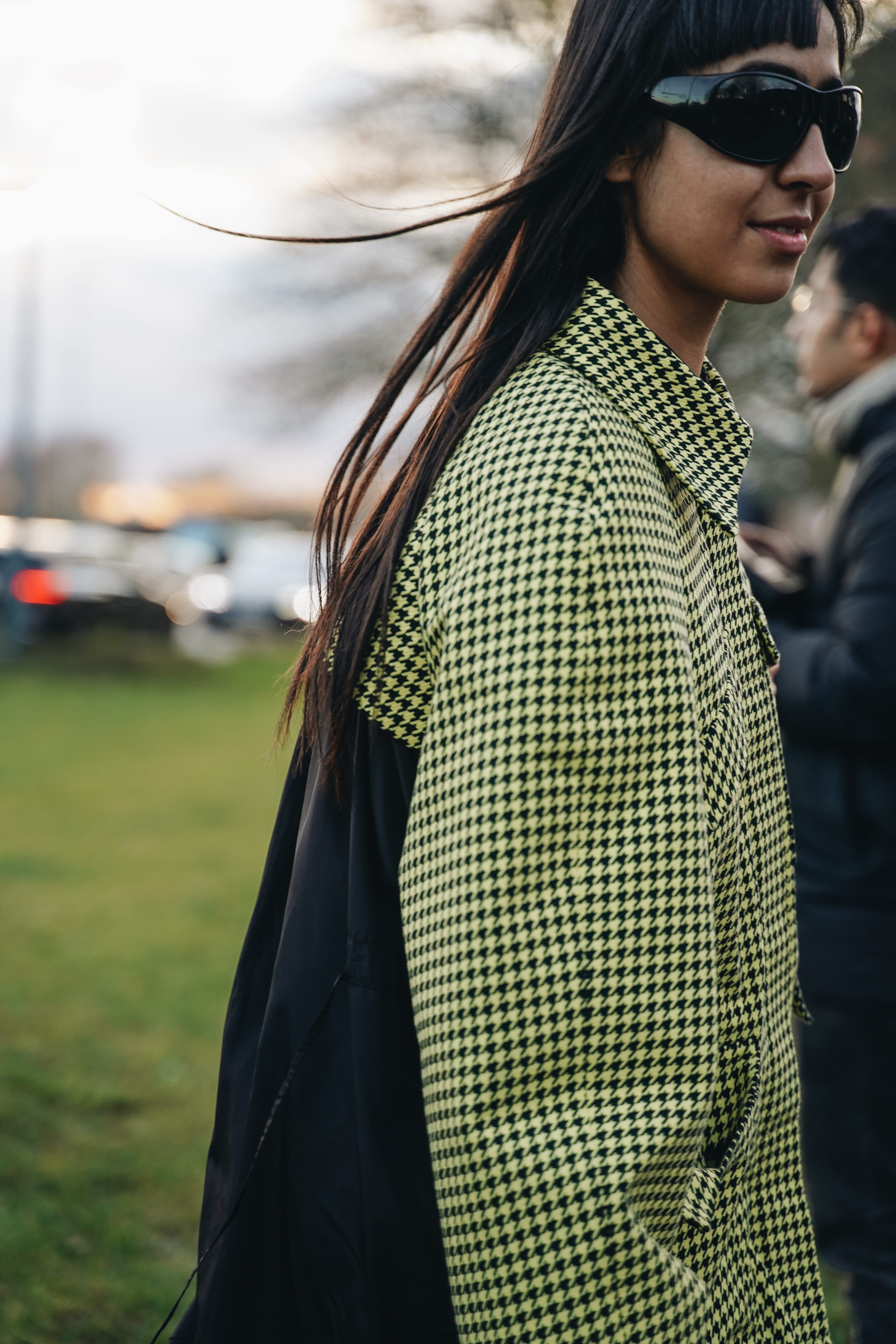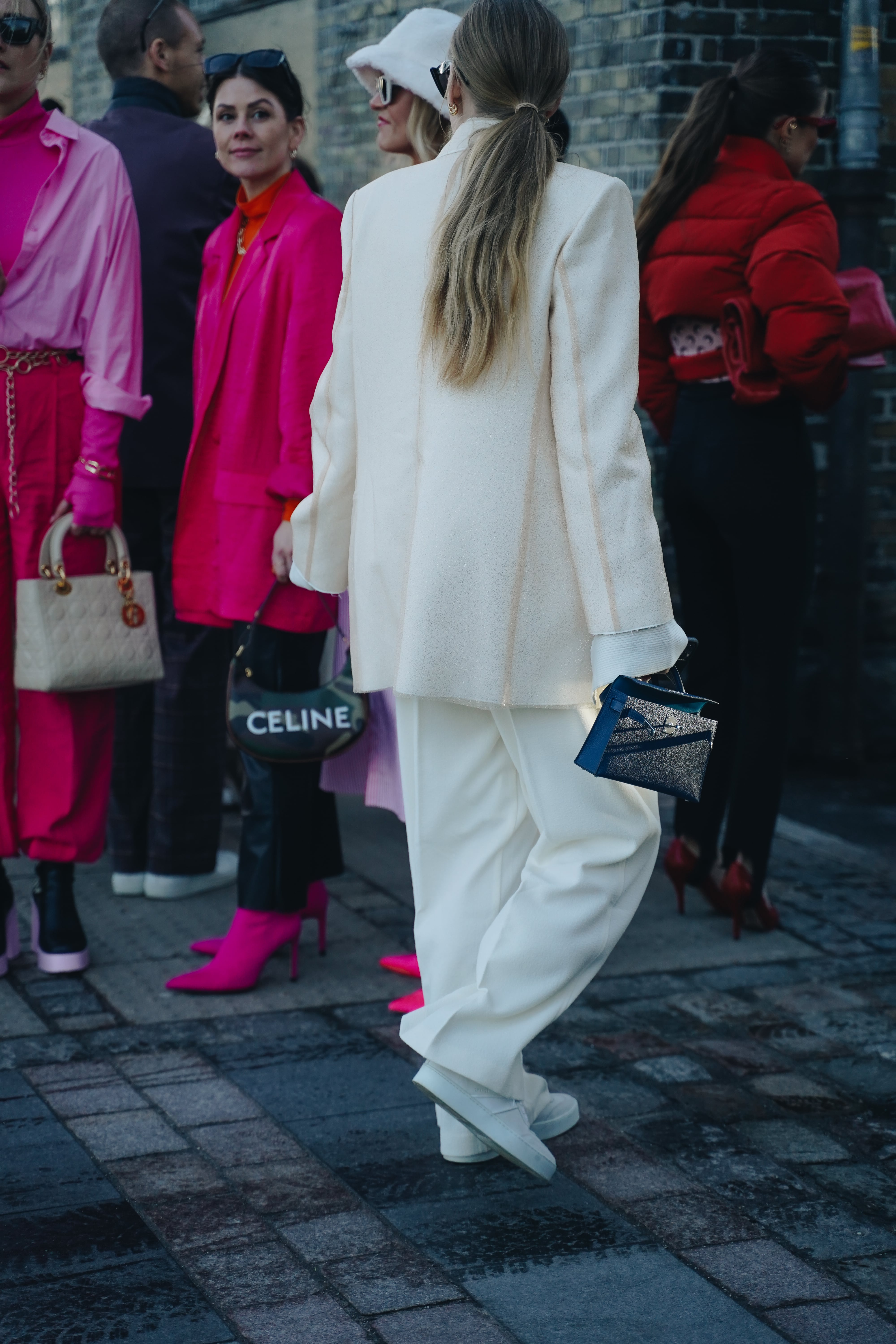 Жизнеутверждающие мотивы проявляются и в образах гостей. Фавориты среди цветов — оптимистичный и страстный оттенок красного, неоновый зелёный, фуксия и пастельные тона. Главенствующими также оказались графичные силуэты, дополненные гиперболизированными аксессуарами, огромными шарфами и клатчами.