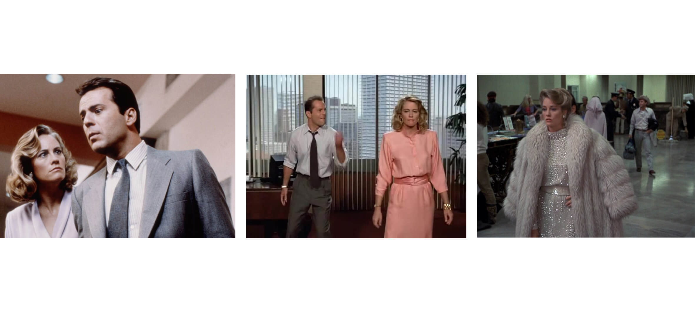 Определенная "винтажность" присуща не только вечерним нарядам Мэделин, но и повседневным. Известно, что в 80-е модные тенденции были созвучны тем, что царили в 40-х, и Туртуричче обыграл эту созвучность на наивысшем художественном уровне. Маскулинность силуэтов 40-х идёт рука об руку с расслабленностью приближающихся 90-х — в брюки с завышенной талией заправлены не глухие рубашки, а вольные шелковые топы, узкие платья с драпировками на рукавах выполнены в нежно-коралловых или сияющих перламутровых цветах, а взбитые ухоженные локоны прически не перебивает броский макияж. Мэделин Хейс выглядит не карикатурой на сильную и деловую женщину, а живой, динамичной, активной и бесконечно женственной.