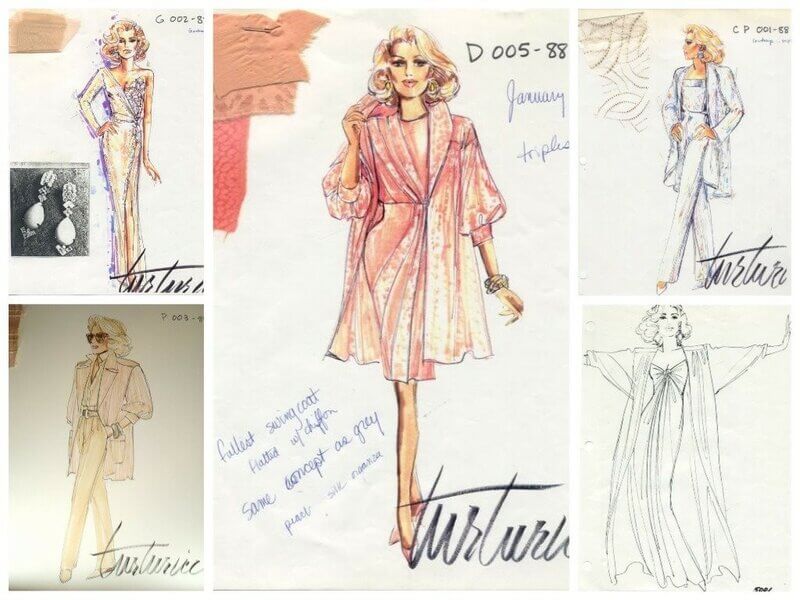 Сам Туртуричче отмечал: "Я просто беру тонны шёлка, габардина, жаккарда, шармёза..." Мягкость и плавную графику линий дополняли немногочисленные украшения гладких фактур, что придавало образам дух богатства и изобилия, но не делало их избыточными и вычурными. Все платья и костюмы непременно дополнялись аккуратными лодочками на небольшом каблуке, что позволяло актрисе выглядеть изящно и не грузно.
