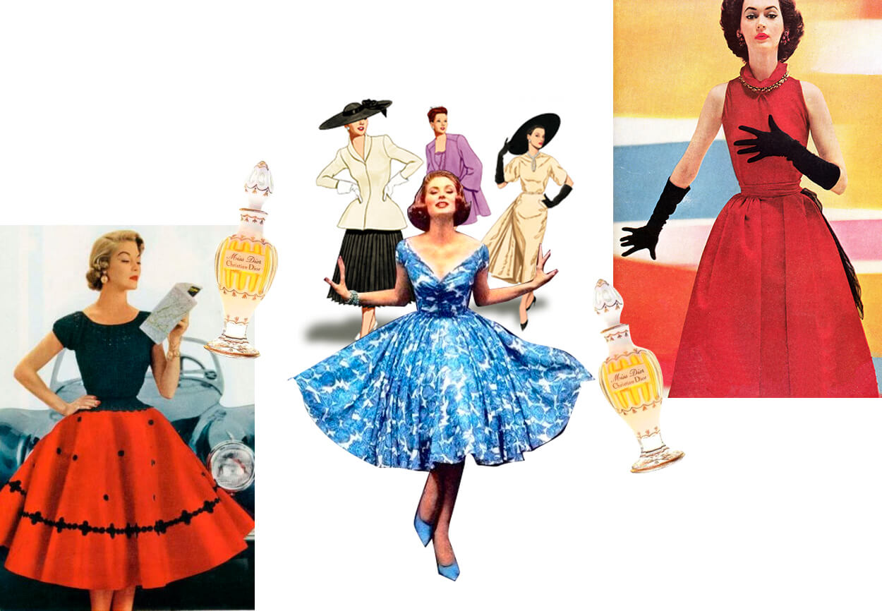 1947 року Крістіан Діор представив у Парижі свою першу колекцію, що стала різким контрастом ідеології поміркованості та раціонального споживання, актуальної в перші повоєнні роки. Сукні з пишними спідницями, що вражають уяву, на які пішли десятки метрів розкішної тканини, шокували та обурили громадськість до такої міри, що в манекенниць, які позували в Dior на Монмартрі, жбурляли гнилі овочі. І все ж втомлені від робітничих повинностей, форменого одягу і поневірянь воєнних років жінки побачили в урочистих та гламурних вбраннях справжній порятунок.