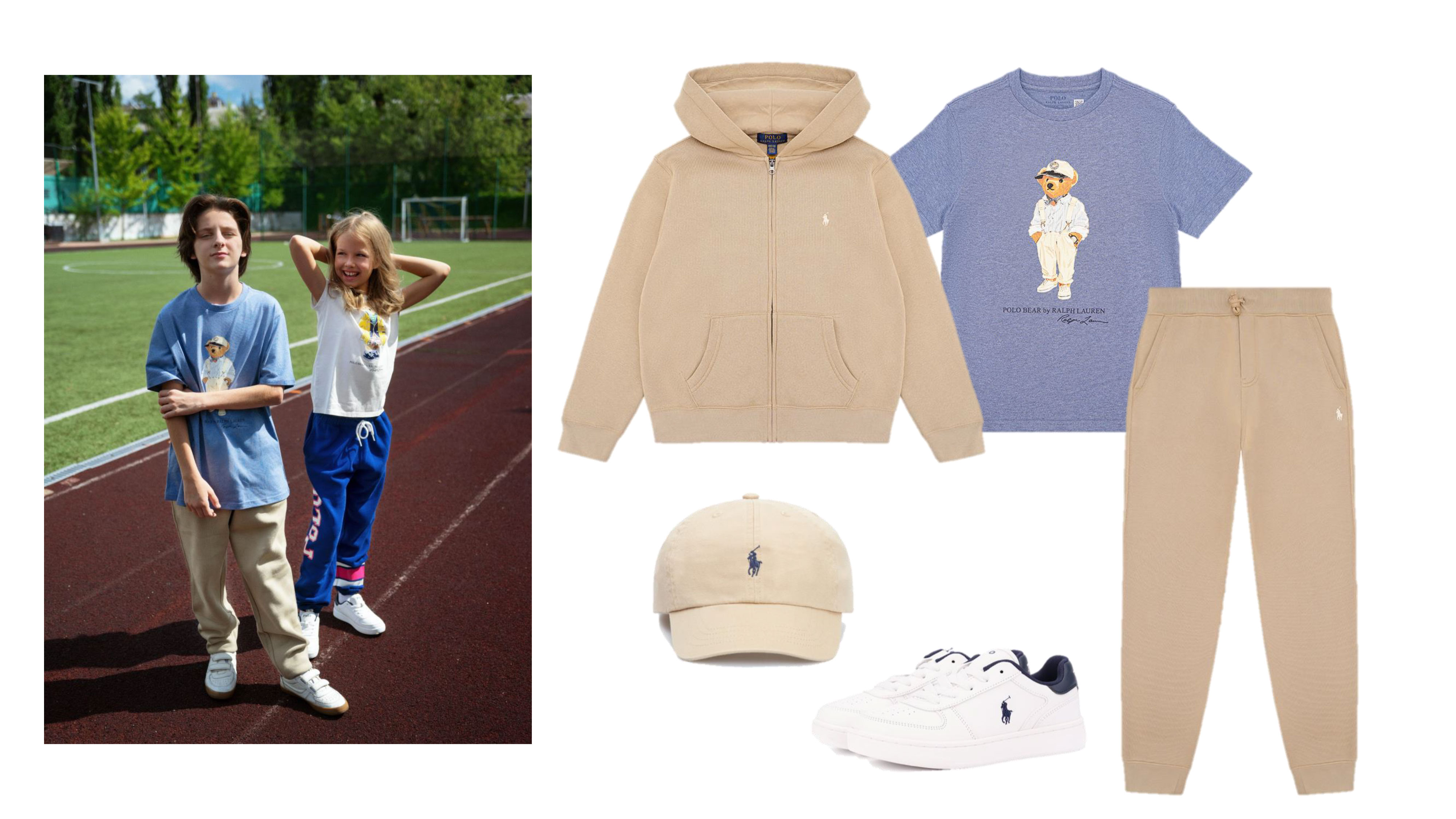 Футболка, Polo Ralph Lauren. Толстовка, Polo Ralph Lauren. Спортивні штани, Polo Ralph Lauren. Бейсболка, Polo Ralph Lauren. Кеди, Polo Ralph Lauren