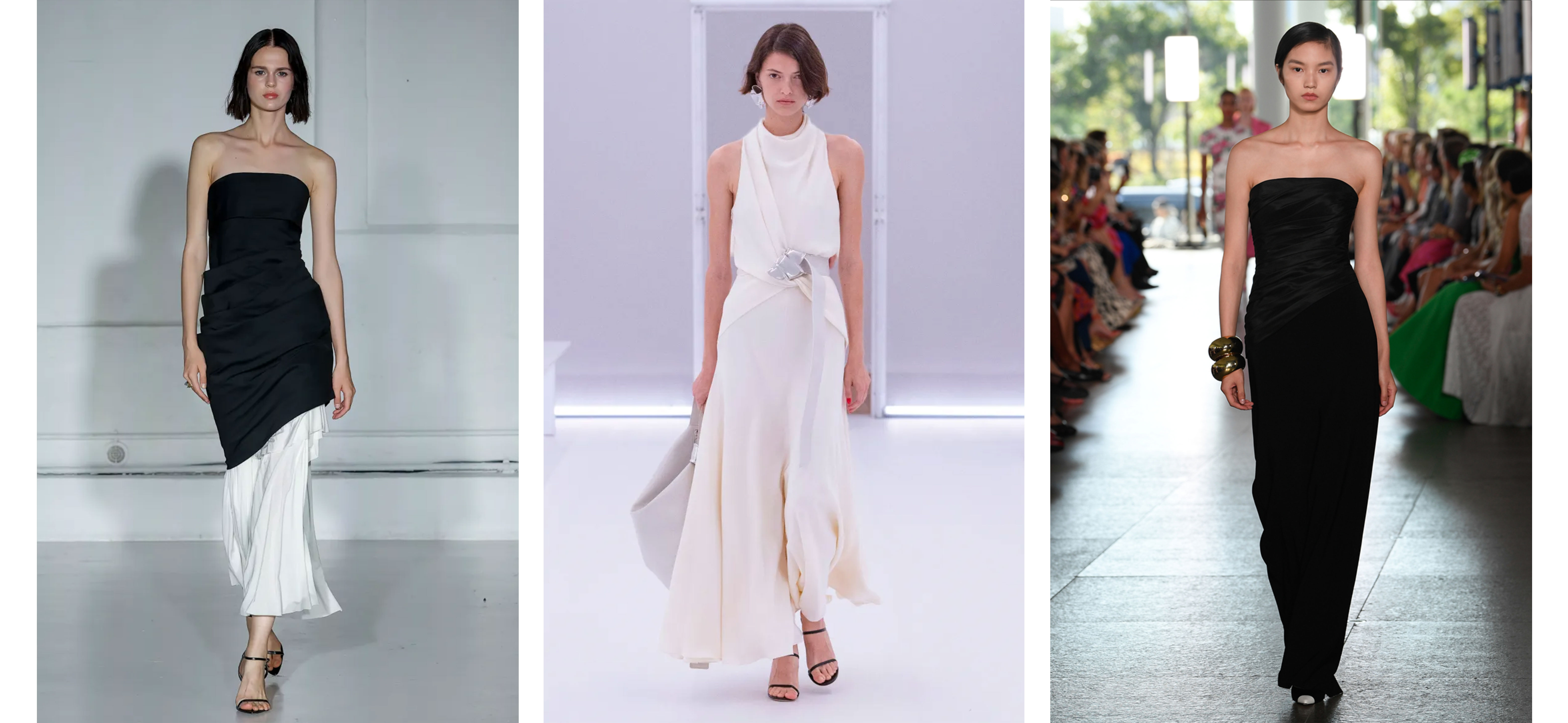 Сукні з драпіруванням мають потенціал стати ідеальним вибором для офіційних подій, що підтверджують колекції сезону весна-літо 2024. Так, втіленням елегантності виступає мінімалістична чорно-біла сукня від французького бренду Mossi, а також чорна приталена модель від Carolina Herrera, доповнена масивними золотими браслетами. Водночас більш романтичний, але не менш класичний ансамбль представляє Brandon Maxwell — із білою максісукнею, прикрашеною акцентним лискучим ременем.