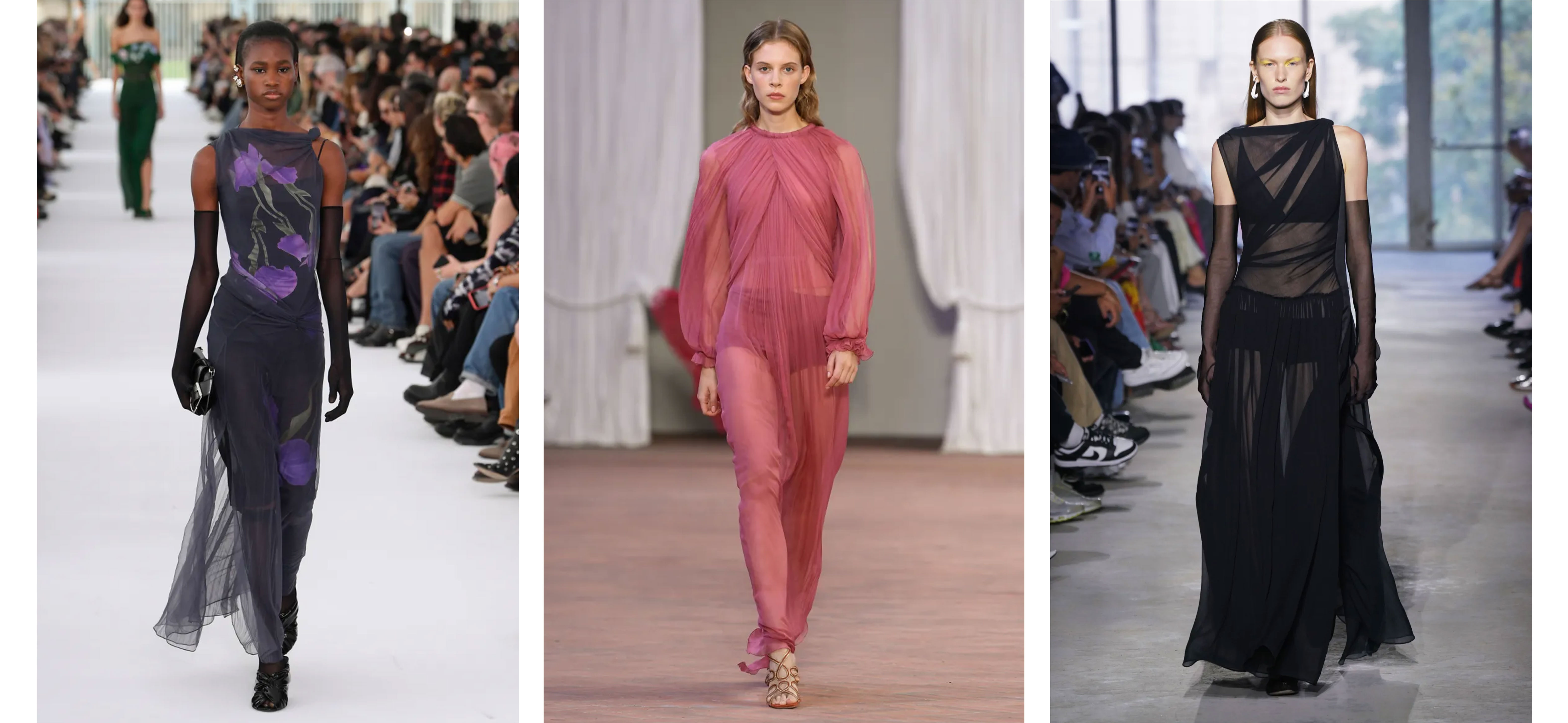 Прозорість — тренд, що не покидає подіуми вже кілька сезонів і надихає дизайнерів на створення ефектних образів. Драпіровані сукні не стали винятком, гармонійно поєднуючись із тендендцією. У сезоні весна-літо 2024 такі моделі мають домінанту максідовжину, яка дозволяє досягнути балансу між спокусливістю та елегантністю. Натхненням для власної стилізації стануть, зокрема, вишукані й струмливі сукні від Phillip Lim, Alberta Ferretti та Givenchy.