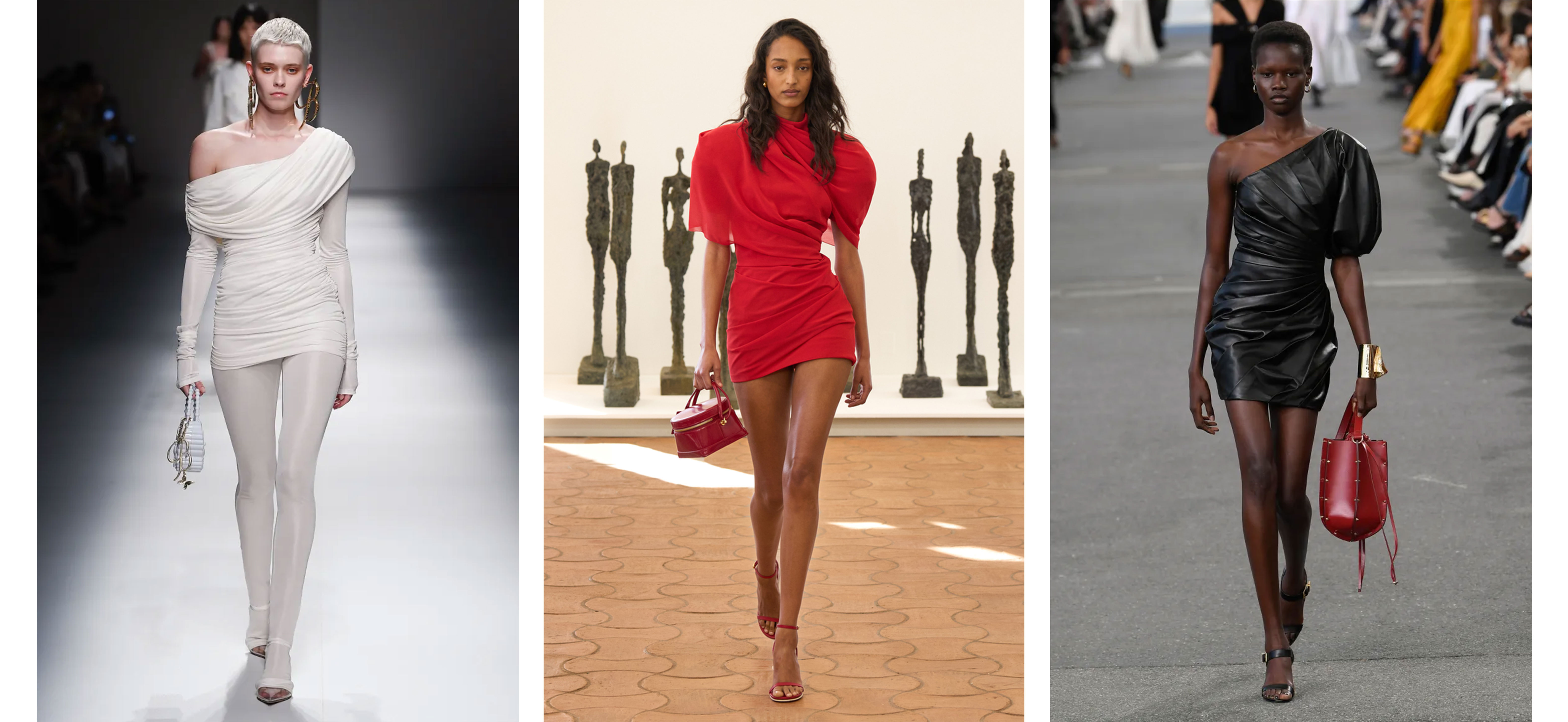 Драпіровані сукні в довжині міні — це не менш актуальний вибір для цієї весни й літа, що з’явився в колекціях багатьох флагманів фешн-індустрії. У їхніх рядах — Blumarine з ефектною моделлю на одне плече, що скомбінована з колготками в тон і масивними монограмними сережками. Інші прихильники таких моделей включають Jacquemus, які презентували червону міні зі стейтмент-рукавами, та Chloé, на показі яких чорна мінісукня на одне плече була поєднана з акцентною червоною сумкою.