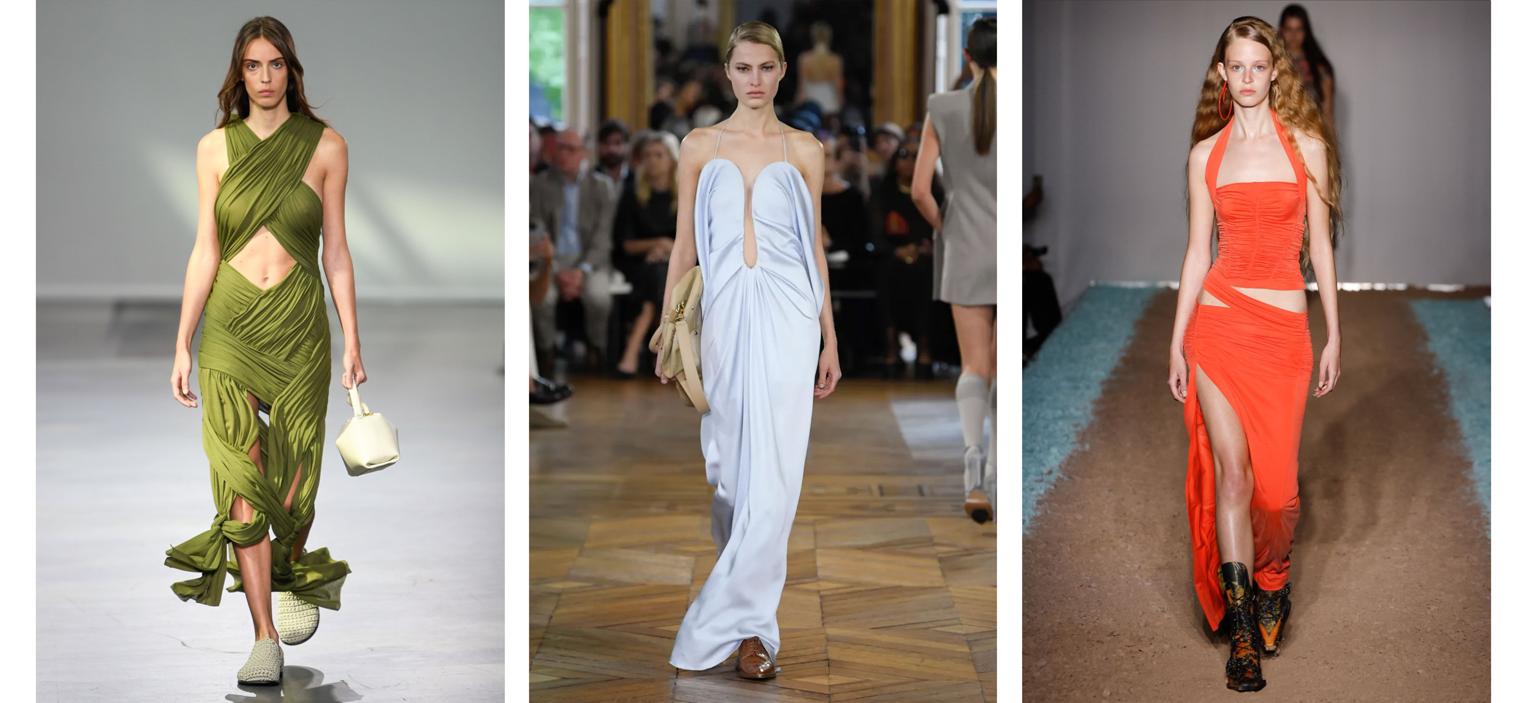 Асиметричні, в несподіваних місцях та звабливі — вирізи на драпірованих вбраннях додають особливий шарм до вечірніх образів. Серед адептів таких моделей Victoria Beckham, що представили світло-блакитну максісукню на тонких бретелях. А також — J.W Anderson зі струмливою сукнею у відтінку хакі, що поєднана з трендовими плетеними клогами, та лондонський бренд KNWLS із приталеним кораловим ансамблем.