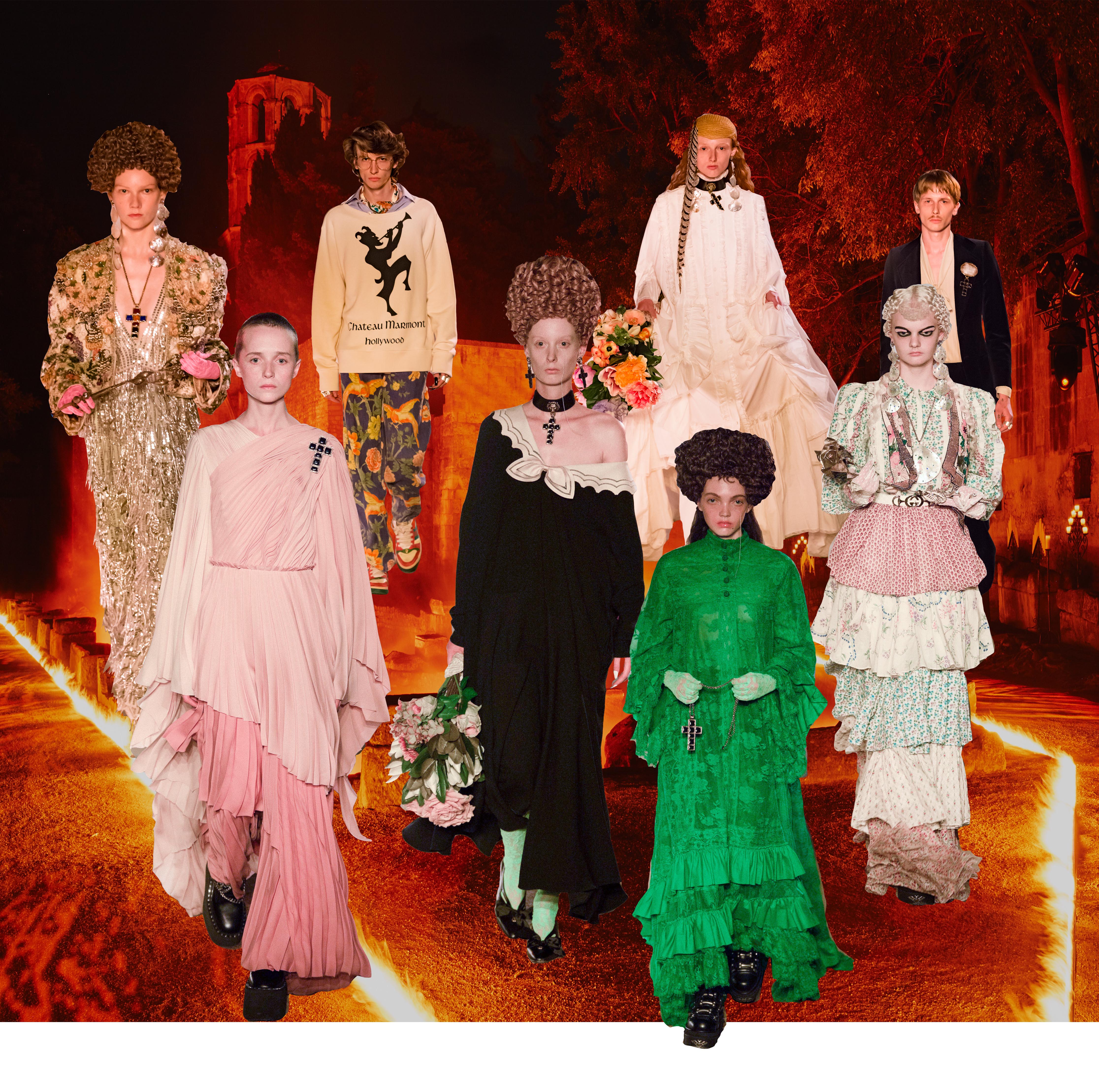 Все смешалось в доме Gucci: в своей круизной коллекции Алессандро Микеле цитировал образы золотого века, времен правления Елизаветы, добавлял лоска 80-х и возвращался к Античности (изображение Диониса на лонгсливах). Потом он решил добавить несколько силуэтов из 60-х, закрепить все спортивными сандалиями из 90-х и надеть моделям по инкрустированному кресту на шею. Работая над коллекцией, дизайнер фантазировал на тему загробной жизни — отсюда и эклектика в стиле. Довольно смелая ирония, так как не стоит забывать, что это круизная коллекция, которая обычно посвящена отдыху, — Микеле подошел к решению этой задачи пафосно, помпезно и немного фатально.