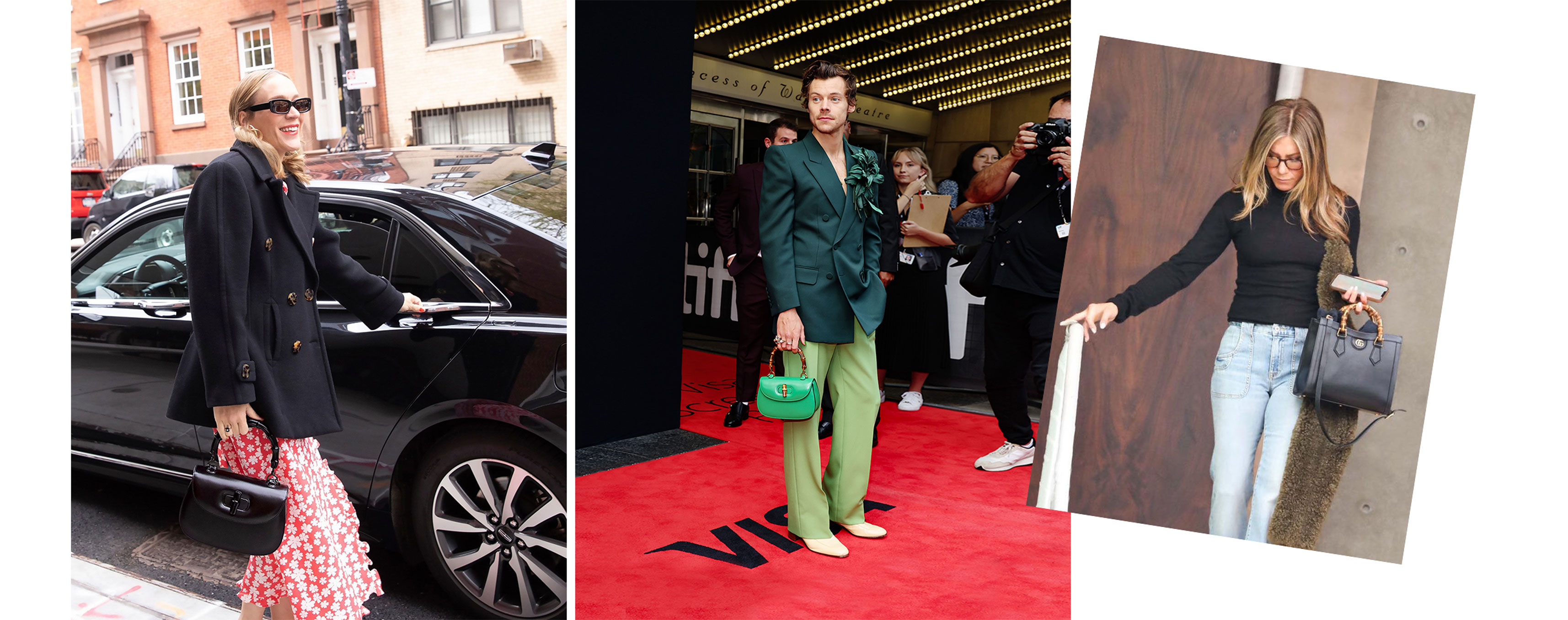 Зліва направо: Хлої Севіньї, Гаррі Стайлз і Дженніфер Еністон із «бамбуковою» сумкою Gucci