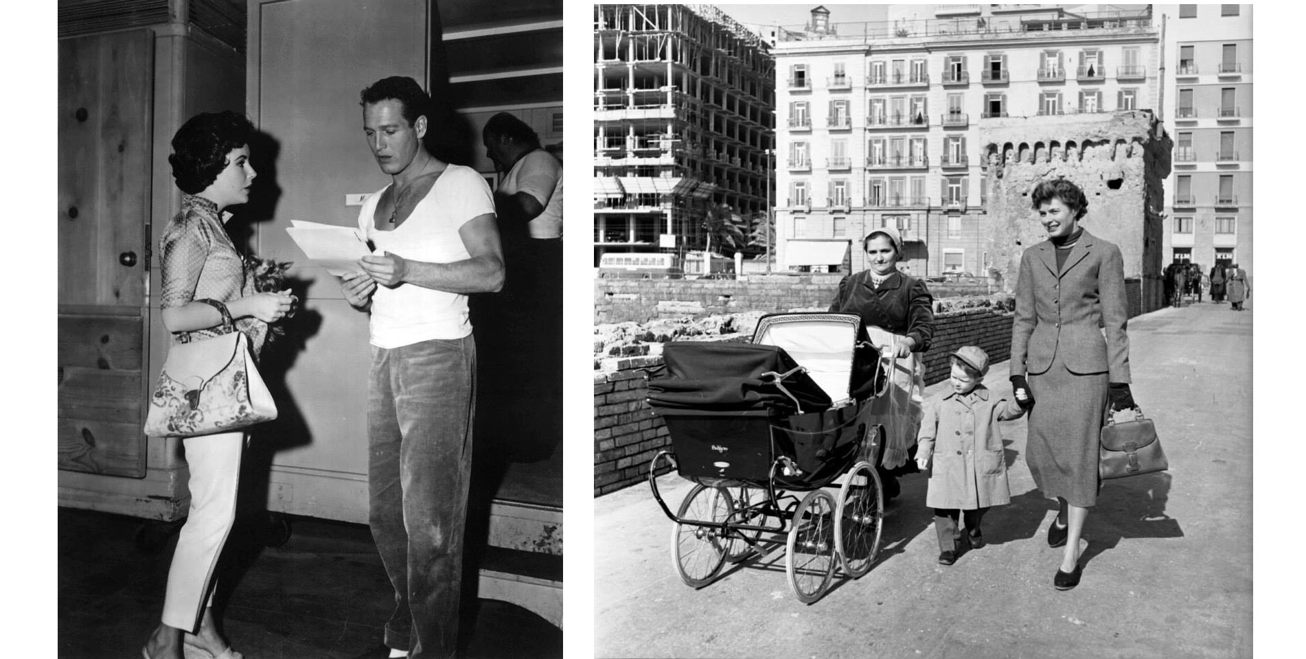 Зліва направо: Елізабет Тейлор із «бамбуковою» сумкою Gucci під час знімання фільму «Кішка на розпеченому даху», 1958 рік; Інгрід Бергман з «бамбуковою» сумкою Gucci в Неаполі, 1953 рік