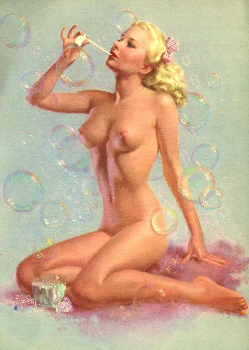 Что же касалось жанра иллюстрации, в 1950-х издатели подхватили людскую тягу к возрождению развлечений и понятным, легко читаемым эмоциям. На смену томным дивам и задорным морячкам пришли лёгкие, шутливые сюжеты — как правило, бытовые сценки, в которых девушки оказывались в неловких ситуациях. Всем нравились забавные и волнительные пустяки — и, казалось бы, эротические открытки были самой невинной затеей. Однако в американском обществе произошло очередное обострение добропорядочности и жанр пин-ап оказался на культурных задворках. Наряду с игрой в процветание и благопристойность, заскучавшая и пресытившаяся публика увлеклась шпионскими фильмами, научной фантастикой и ужасами, и издатели начали эксплуатировать образ девушки-жертвы, то раздираемой страхом перед кошмарными монстрами из космических глубин, то самими монстрами. Широкой популярности эти изображения не приобрели, однако родилась целая отрасль литературы и комиксов Pulp-Fiction - дешевого чтива на щекотливые темы.
