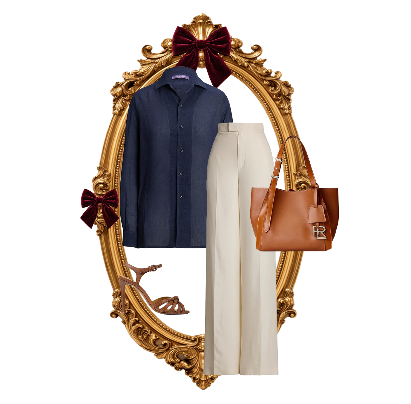 Сорочка Ralph Lauren Collection. Шовкові брюки Ralph Lauren Collection. Сумка-тоут Ralph Lauren Collection. Босоніжки Ralph Lauren Collection