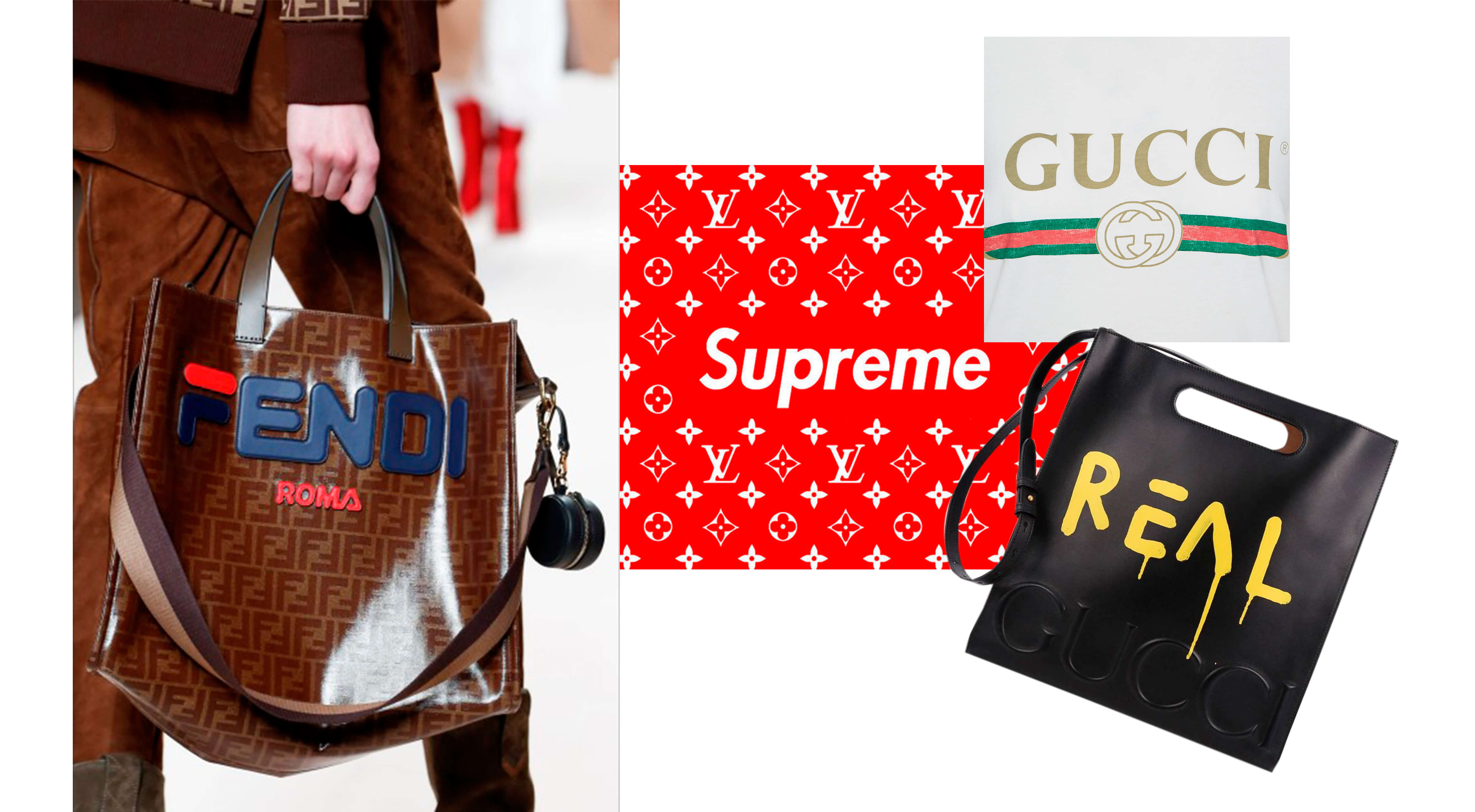 Как раз тогда весь мир и помешался на логотипах. Винтажные футболки Gucci захватывают ленту инстаграма и стритстайл отчеты, Fendi помещают свой логотип на всевозможные поверхности (включая мех), а красная монограмма Louis Vuitton, созданная в коллаборации с Supreme, становится популярнее оригинала. Gucci выпускают сумки с нарочито неправильным логотипом Guccy, а Fendi создают новый логотип вместе с Fila.
