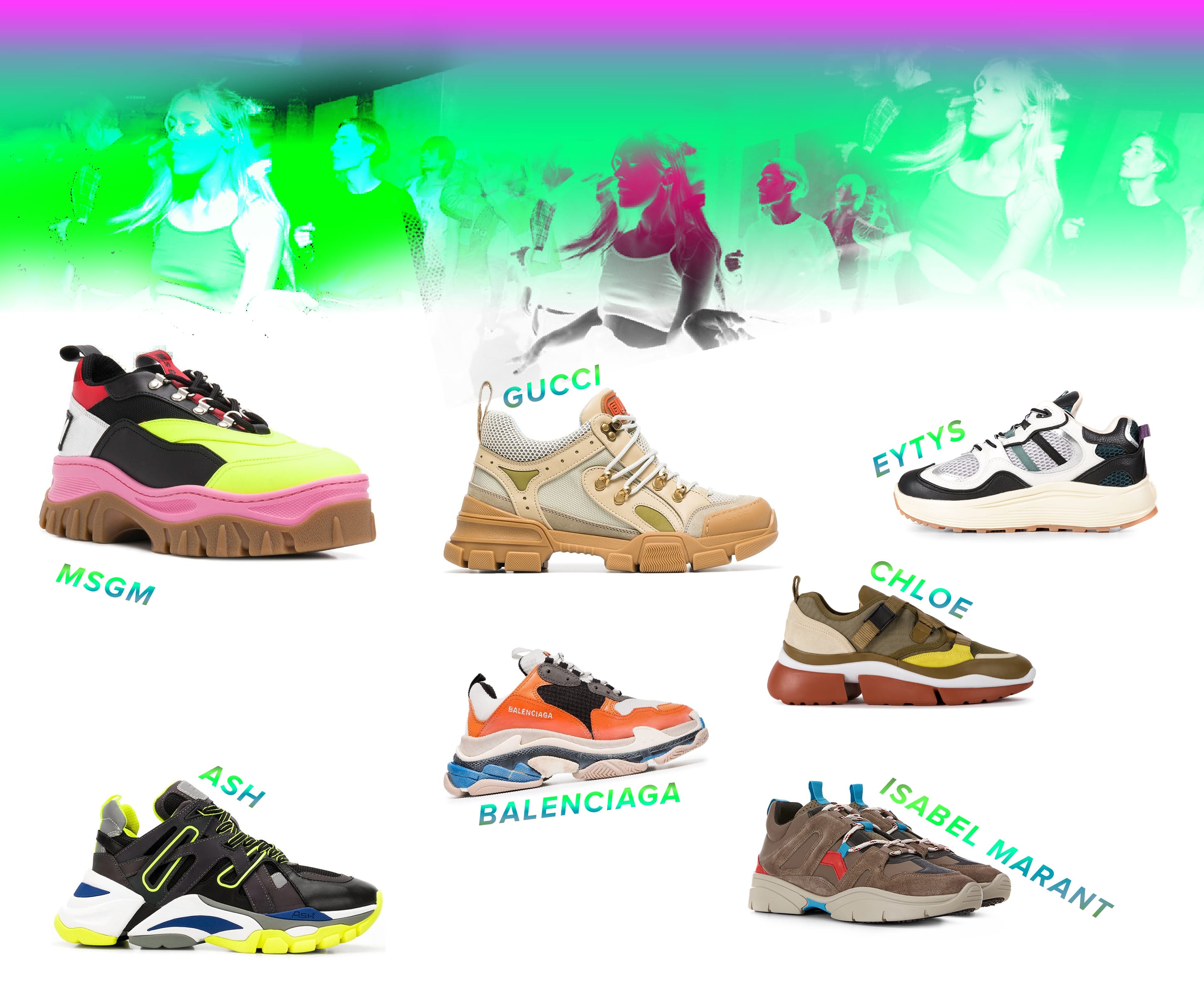 Рейв как раз тот случай, когда обувь должна быть максимально удобной, чтобы забыть обо всем и танцевать до рассвета. Можно выбрать "папины" кроссовки – олдскульные модели на толстой подошве из 1990-х. Или же посмотреть что-то из более современного, например модели Eytys или Balenciaga.
