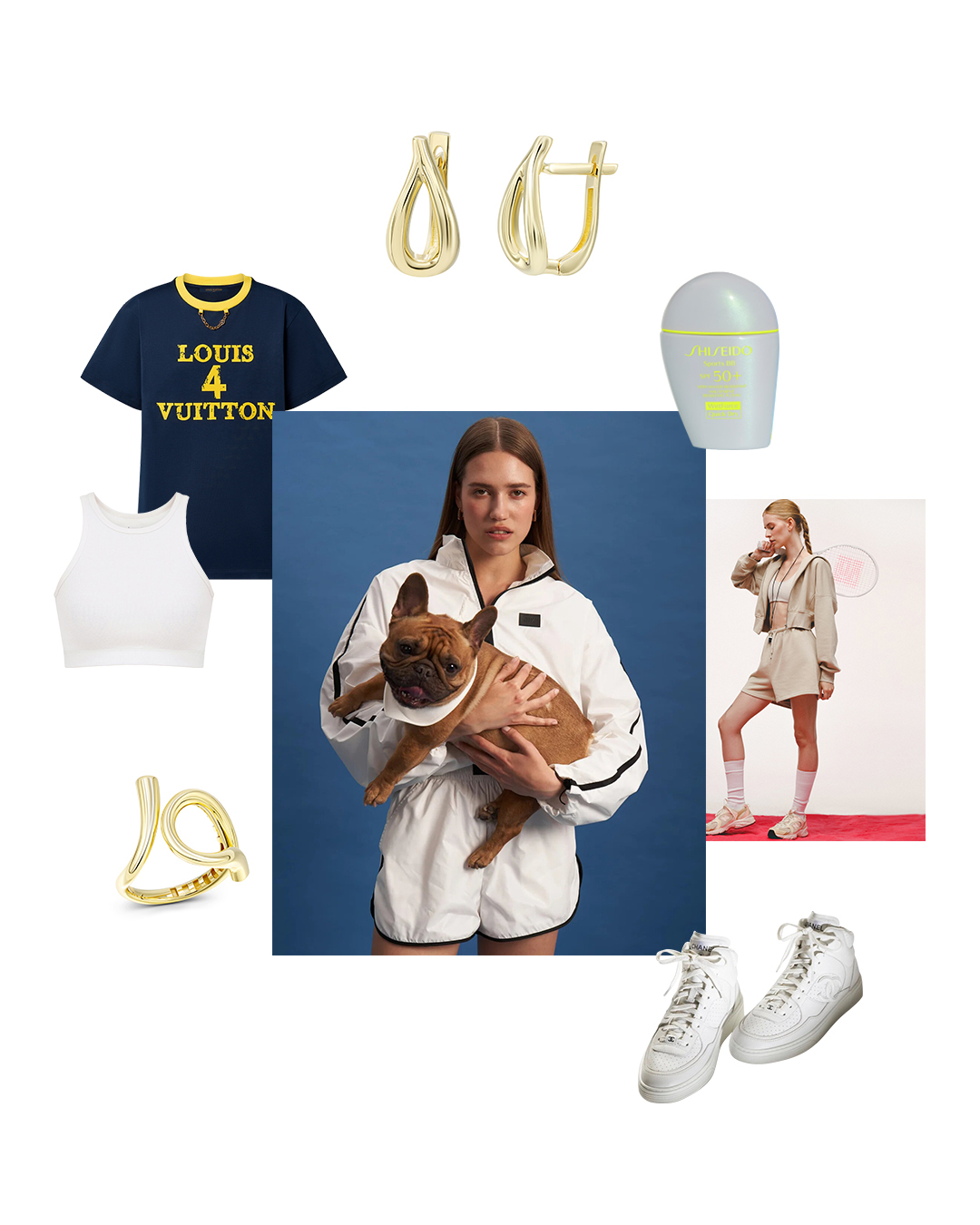 Футболка, Louis Vuitton. Топ-майка Alexandra, колір молочний, GNZ. Кросівки, Chanel. Шорти GNZ Olympics team, колір молочний, GNZ. Базове укорочене худі з металевою блискавкою, Papaya. Спортивні шорти міні, Papaya. Каблучка у жовтому золоті, Ювелірний Дім ZARINA. Сережки у жовтому золоті, колекція Forma, Ювелірний Дім ZARINA. Сонцезахисний BB-крем для обличчя Shiseido Sports BB SPF 50+, Shiseido.