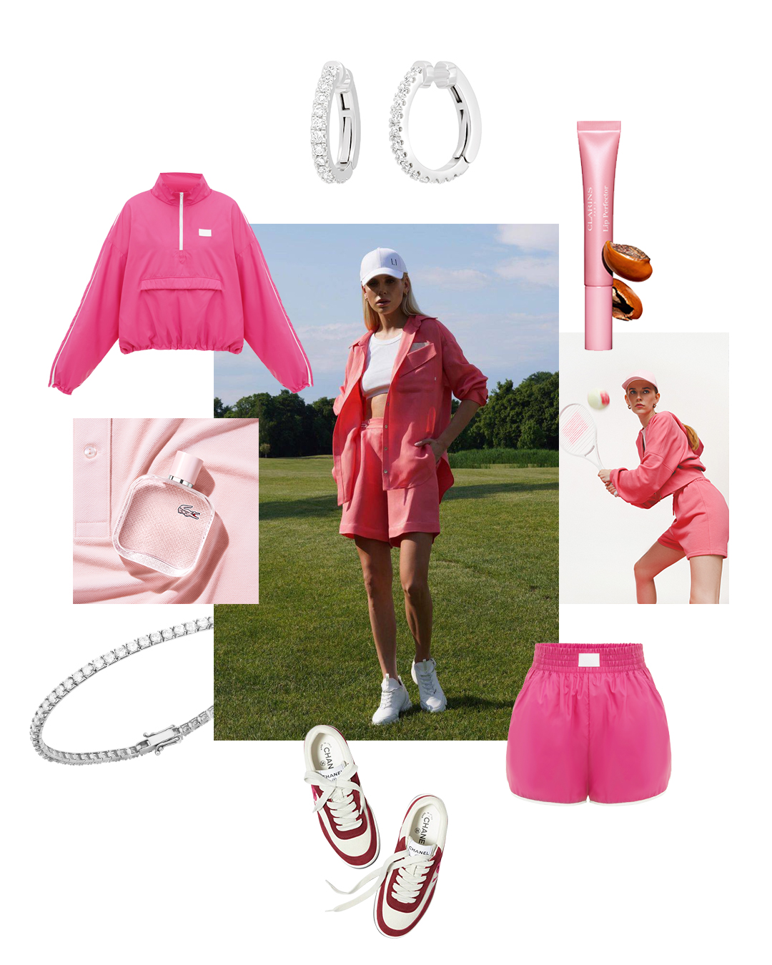 Вітрівка GNZ Olympics team 80', колір маджента, GNZ. Шорти GNZ Olympics team 80', колір рожевий, GNZ. Шорти Coral, LIPUNOVA. Діамантовий тенісний браслет, колекція Sparkling Eyes, Ювелірний Дім ZARINA. Сережки з діамантами у білому золоті, Ювелірний Дім ZARINA. Туалетна вода Lacoste L.12.12 Eau Fraiche, Lacoste. Блиск для губ та щік Clarins Lip Perfector, Clarins.