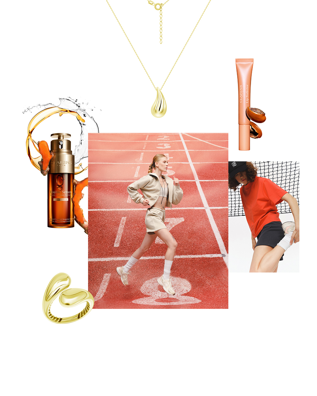 Базова футболка оверсайз, Papaya. Спортивні шорти міні, Papaya. Сферична каблучка з жовтого золота, колекція Forma, Ювелірний Дім ZARINA. Кольє у жовтому золоті, колекція Forma, Ювелірний Дім ZARINA. Сироватка для обличчя Clarins Double Serum Light, Clarins. Блиск для губ та щік Clarins Lip Perfector, Clarins.